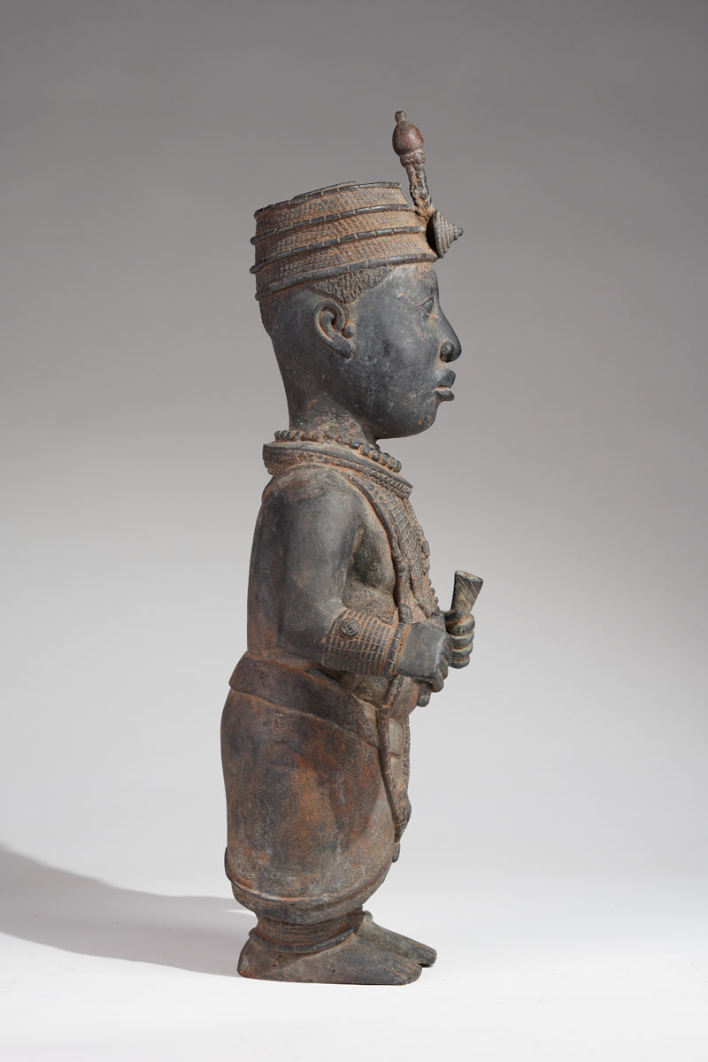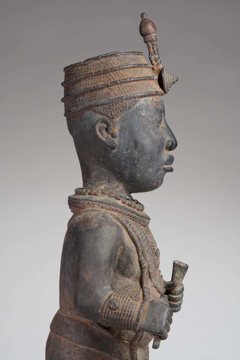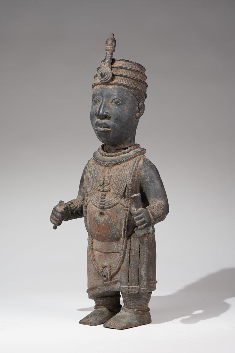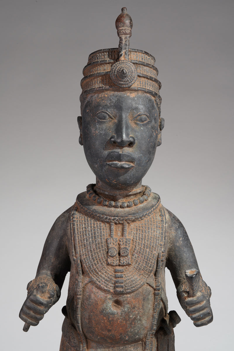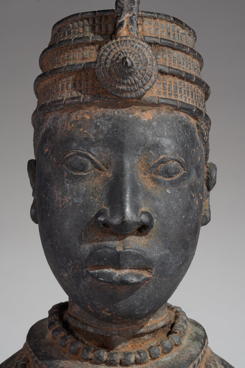 A bronze sculpture of an Ooni (Oba), in the style of Ife, Nigeria who shows the traditional signs of dignity that the king wore during the classical period: a crown, a heavy pearl necklace around the neck, another chain hanging from the neck to the knees and a net of fine strings of pearls with two knots in the middle covering the naked chest. In his left hand he's holding a sign of authority representing once a ram's horn filled with magical substances called "ashe" (exists only fragmentary) and in his right hand a sceptre whose archetype is made of pearls and cloth, both symbols of his authority and power. He also wears wide bracelets around his wrists. He has got a small, gently bulging belly. His robe, over which his belly bulges has a sloping hem. The face is ovoid and full and very even with an expression of calm serenity and quiet dignity. The head of this figure measures more than a quarter of the figures´ length, a proportion that is particularly characteristic of West African sculpture; a bronze with many different layers of oxidations.