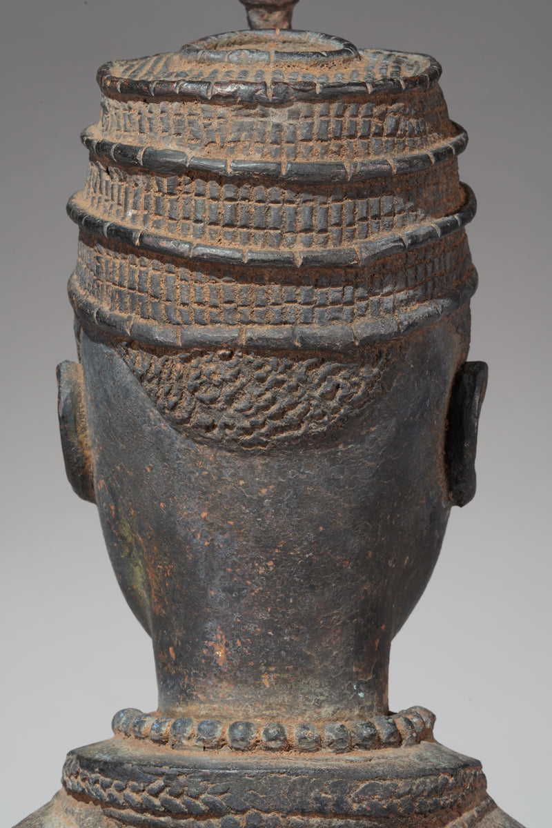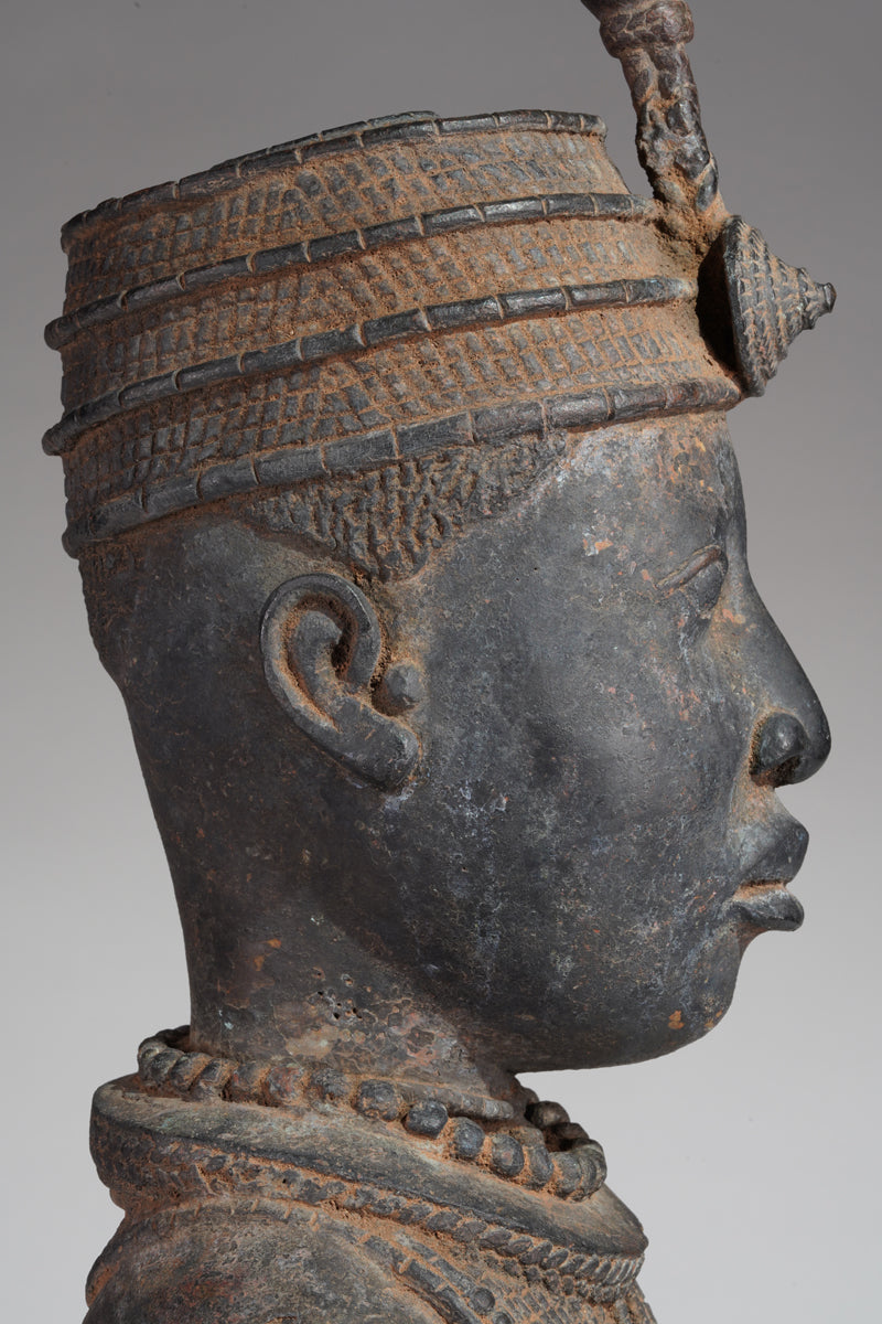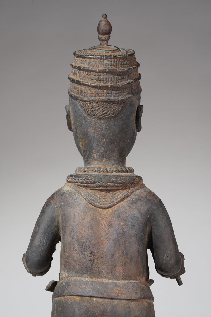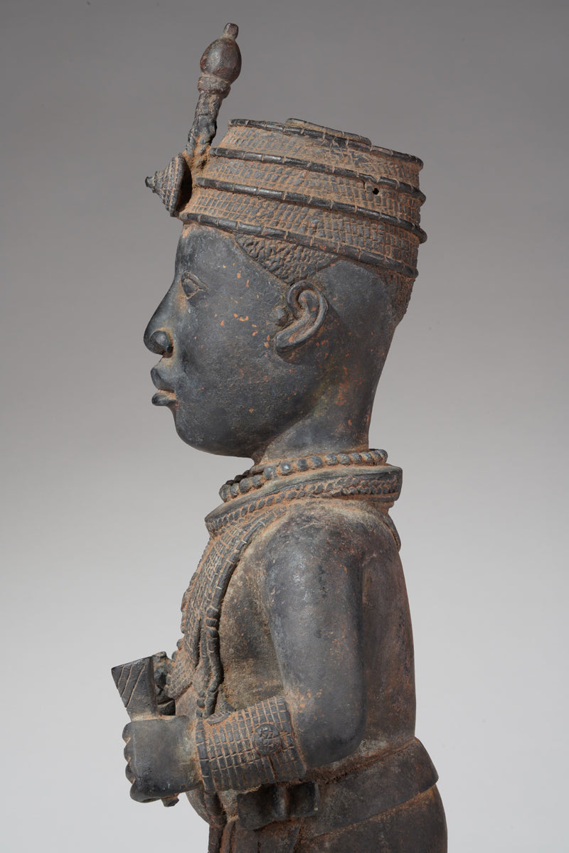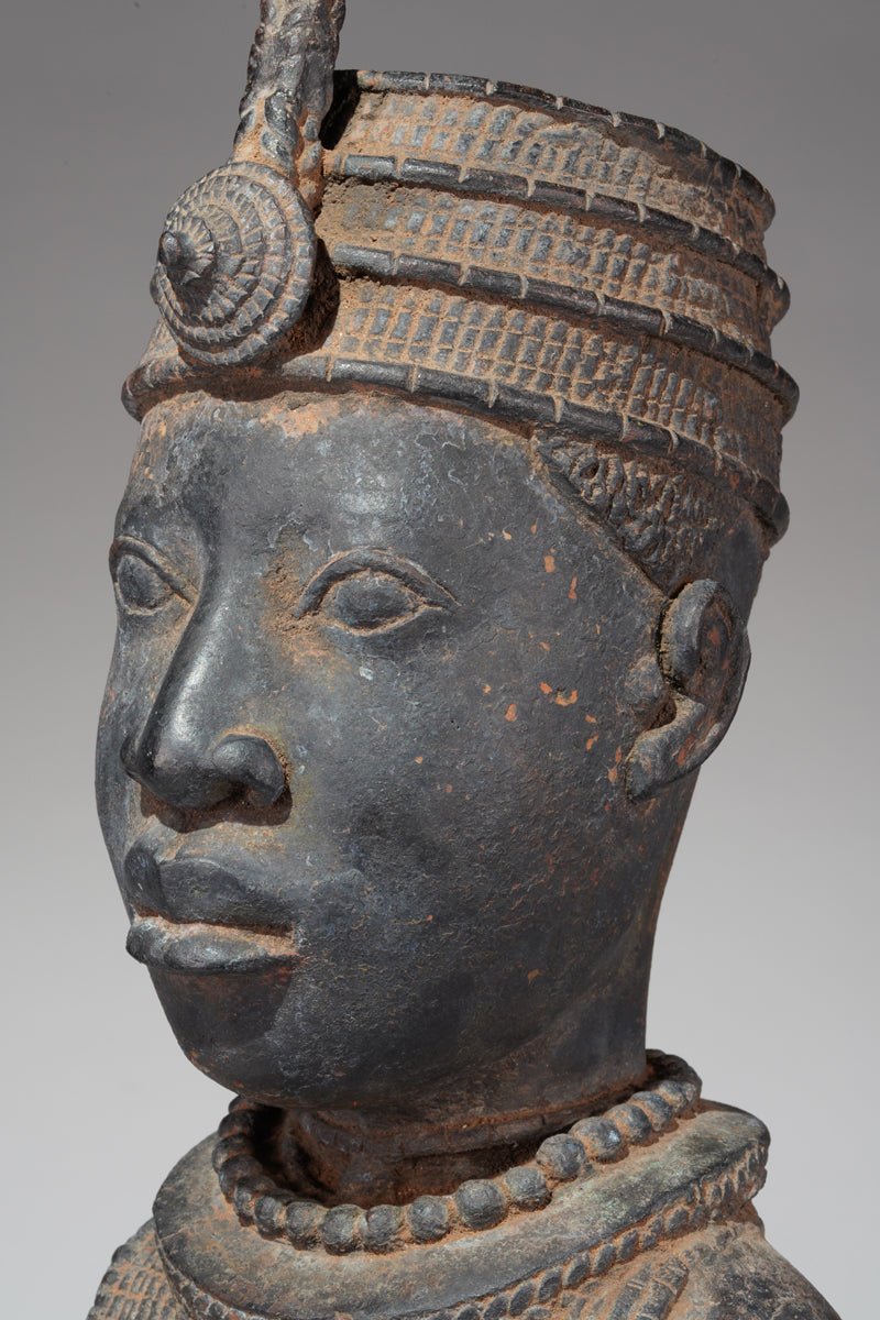 A bronze sculpture of an Ooni (Oba), in the style of Ife, Nigeria who shows the traditional signs of dignity that the king wore during the classical period: a crown, a heavy pearl necklace around the neck, another chain hanging from the neck to the knees and a net of fine strings of pearls with two knots in the middle covering the naked chest. In his left hand he's holding a sign of authority representing once a ram's horn filled with magical substances called "ashe" (exists only fragmentary) and in his right hand a sceptre whose archetype is made of pearls and cloth, both symbols of his authority and power. He also wears wide bracelets around his wrists. He has got a small, gently bulging belly. His robe, over which his belly bulges has a sloping hem. The face is ovoid and full and very even with an expression of calm serenity and quiet dignity. The head of this figure measures more than a quarter of the figures´ length, a proportion that is particularly characteristic of West African sculpture; a bronze with many different layers of oxidations.