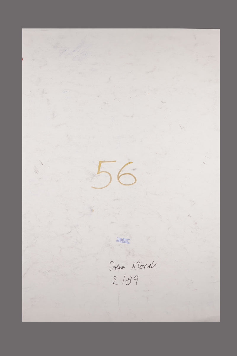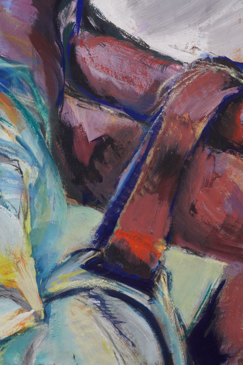 The saddle, predominantly grey and brown, becomes an intriguing focal point. The right stirrup, positioned at the center, draws the viewer's attention. The panel and gulets of the saddle are adorned with vibrant hues—purple, blue, vermillion red, peach, dark blue, and brown. Irena Klonek's signature style is evident in the meticulous detailing, with a play of colors creating a lively and textured composition. The flap of the saddle, rendered in brown and dark blue, adds depth and contrast to the overall color palette. The use of chalk and gouache allows for a rich interplay of textures, enhancing the visual appeal of the artwork. The background left unfinished, reveals some chalk hachure in light blue in the left corner. Solid white colors are strategically placed, contributing to the dynamic contrast with the darker tones. This unfinished background provides a sense of openness and allows the viewer to focus on the intricate details of the saddle.