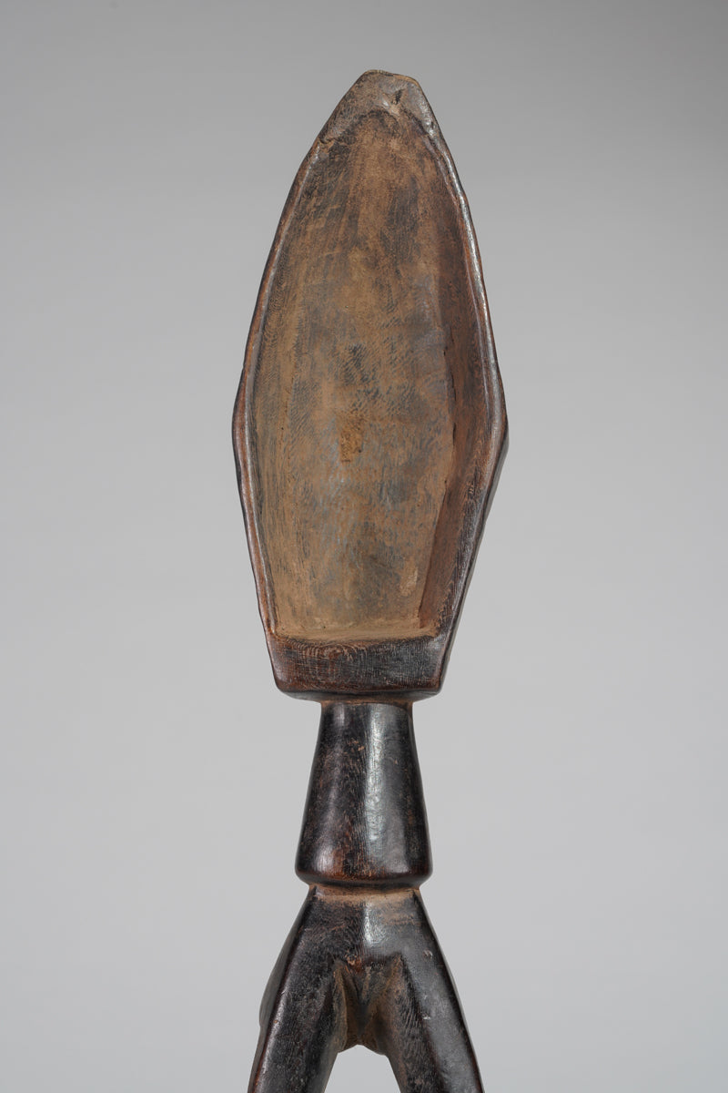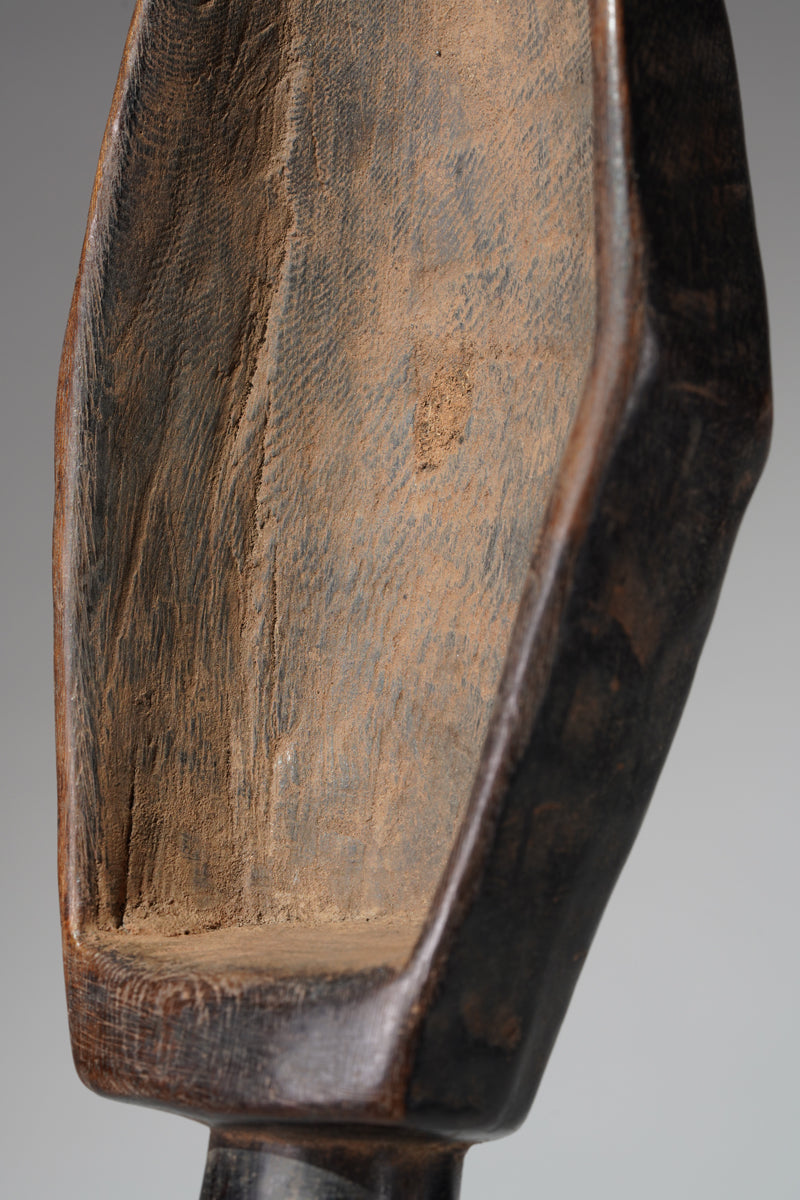 “Artists in Dan communities of Liberia and Côte d’Ivoire have mastered the art of carving impressive wooden ladles that are virtuoso works of sculpture. These ceremonial ladles, known as wunkirmian or wakemia (which translates as "spoon associated with feasts") are badges of prestige acknowledging an individual woman for her incomparable generosity. Oversized (they can measure up to two feet), they are not so much utilitarian objects as symbols of status and the bearer of spiritual powers. Quality of craftsmanship and complexity of design are constitutive of the work’s importance […] To create such esteemed objects, Dan sculptors often rely on anthropomorphic forms and draw upon elements of style developed in other carvings such as masks and figures. […] Other variations include representations of a human hand, animal heads such as goats or cow, small bowls, and a variety of abstract designs. […]