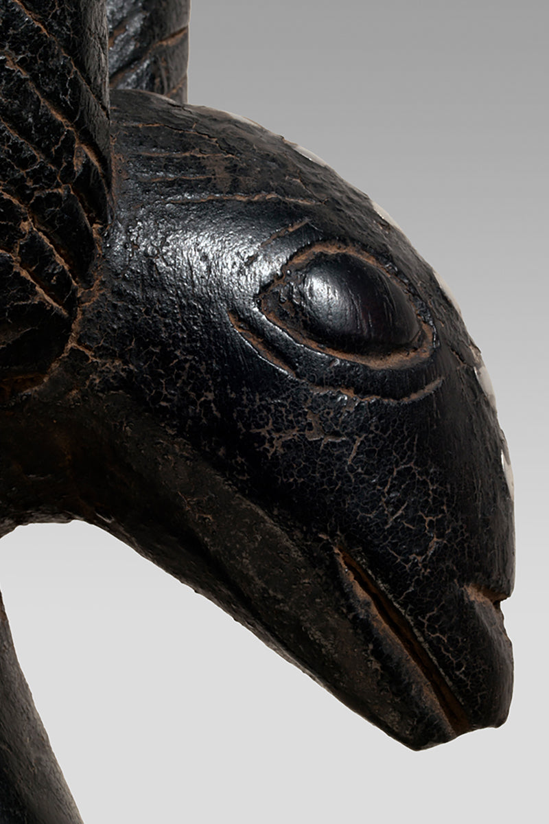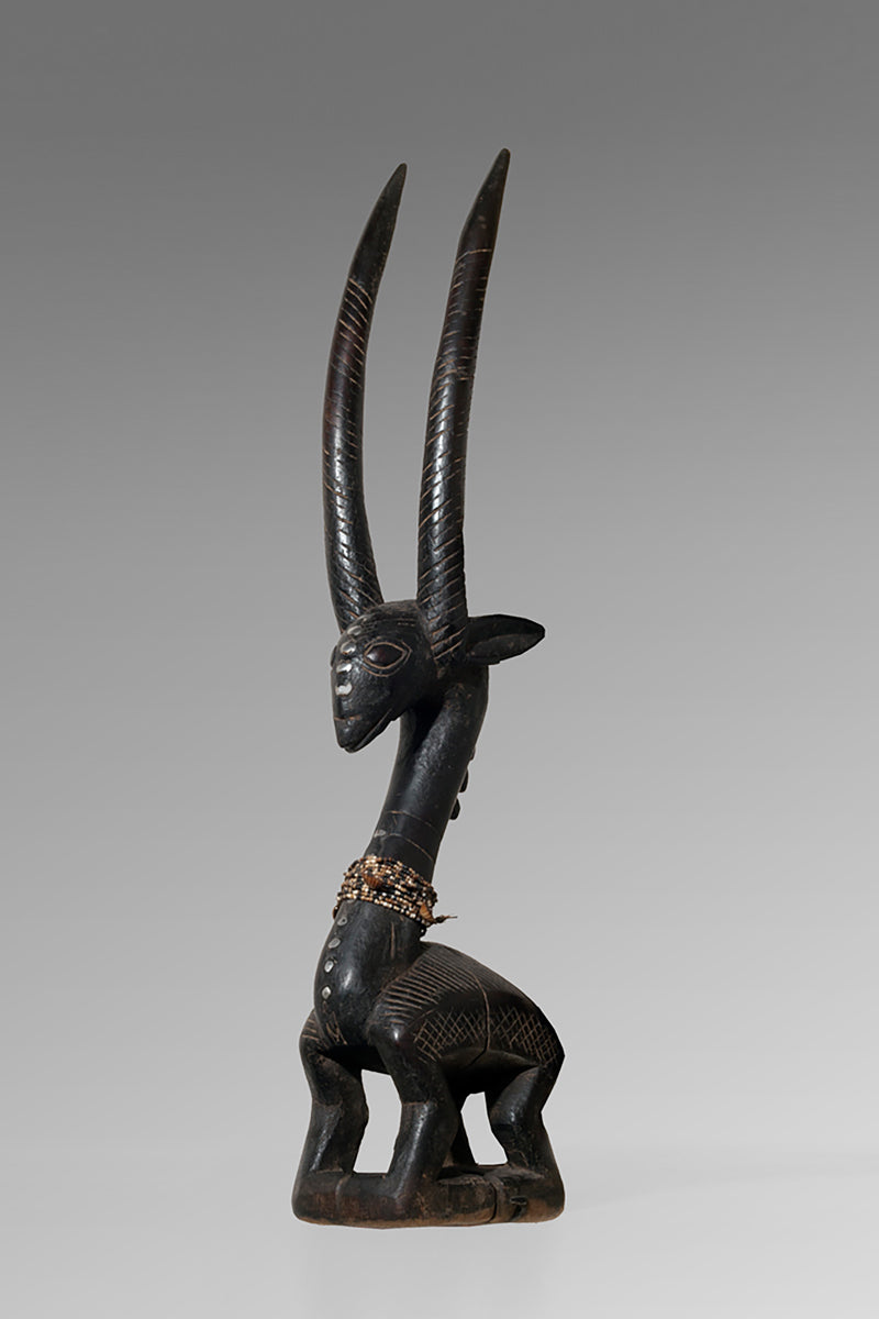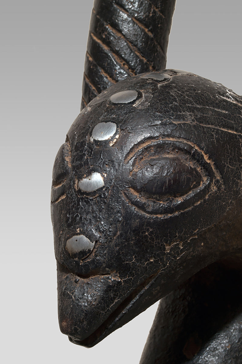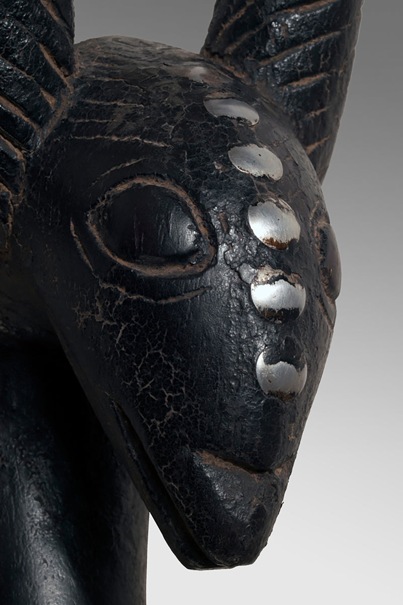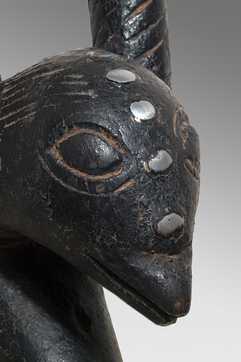 The Ci Wara couple from the Beleko region in southern Mali is generally associated with Bamana communities whose agrarian cosmology emphasises the cooperation of human skill and mythical animal force. In this area, paired figures tend to be conceived as a complementary unity rather than as two independent sculptures. The male element usually displays an elongated, forward-thrusting head crest with sharply rising horns, while the female is characterised by a more compact silhouette in which the antelope head is integrated into a vertical, almost architectural structure supporting a small anthropomorphic figure. This iconographic detail is read as an allusion to nurturance and the transmission of agricultural knowledge within lineages.