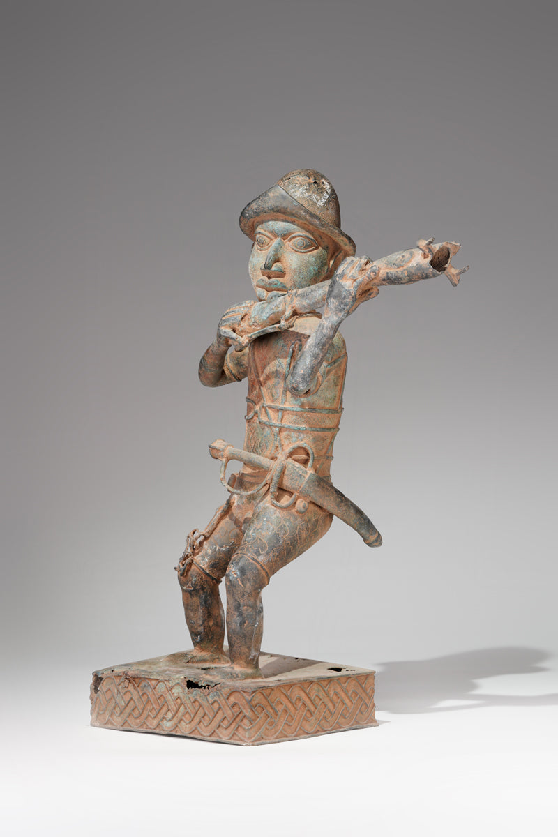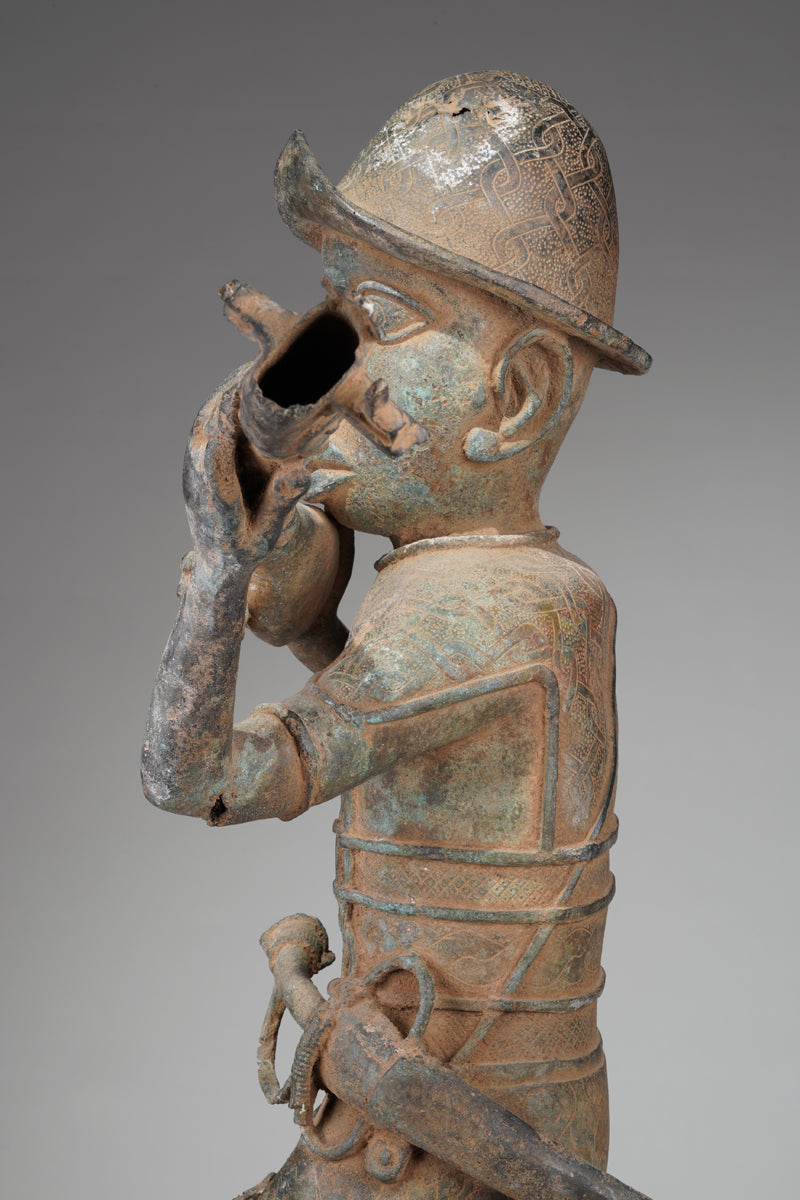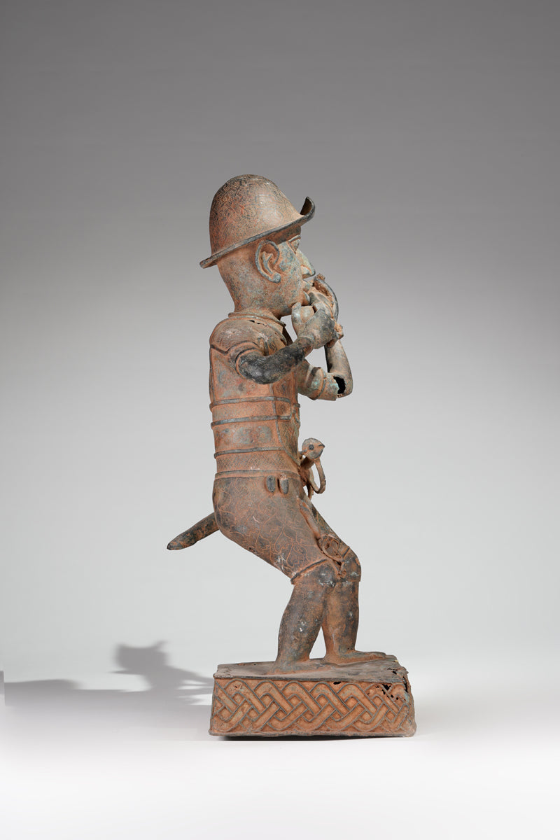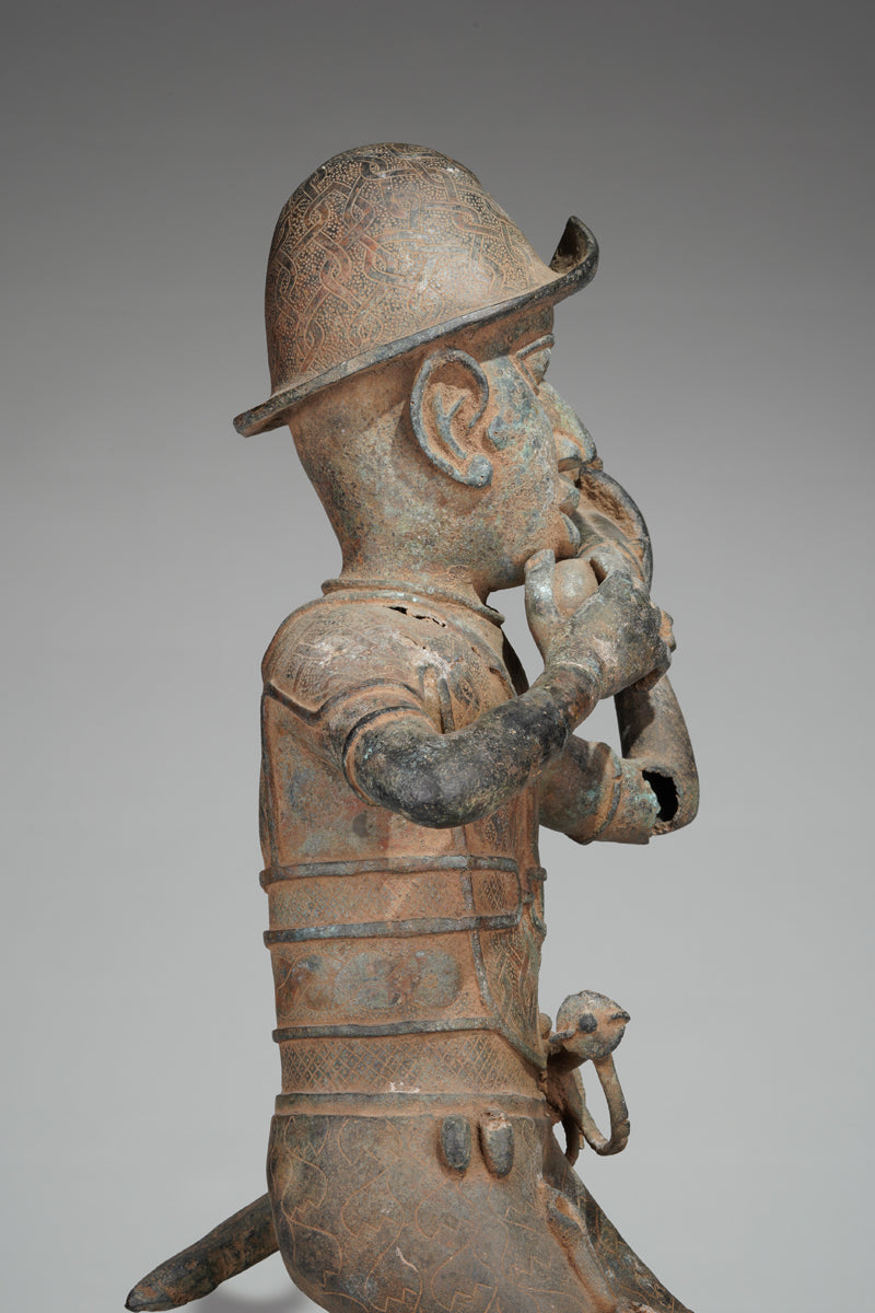 Once the technique of lost-wax casting was mastered by the craftsmen of Benin, bronze heads and figures began to appear on the Oba's shrines. This figure of a court musician playing a side-blown trumpet attests to the technical virtuosity of the Benin bronze casters. The figure's elaborately textured garment depicts the hide of a leopard, an animal associated with the power of the Oba. Similarly, the strands of coral around his neck and chest reaffirm this musician's status in the Benin court, since coral, like bronze and ivory, is a royal prerogative in Benin. "
