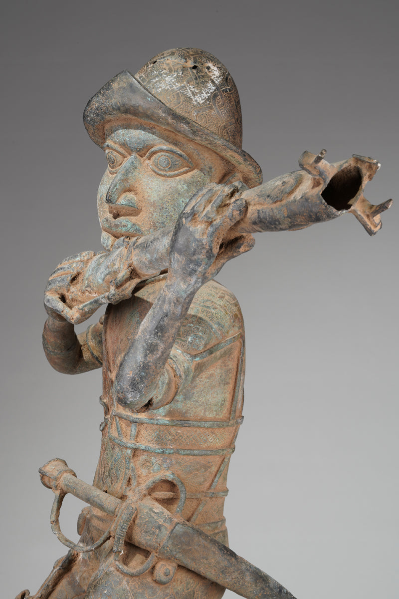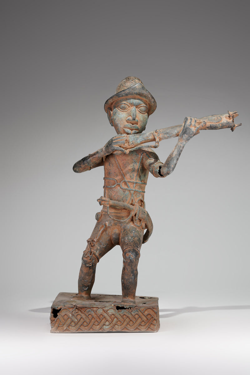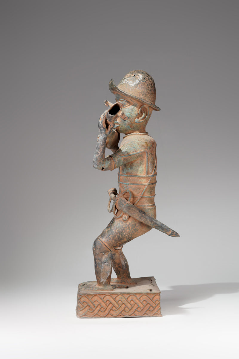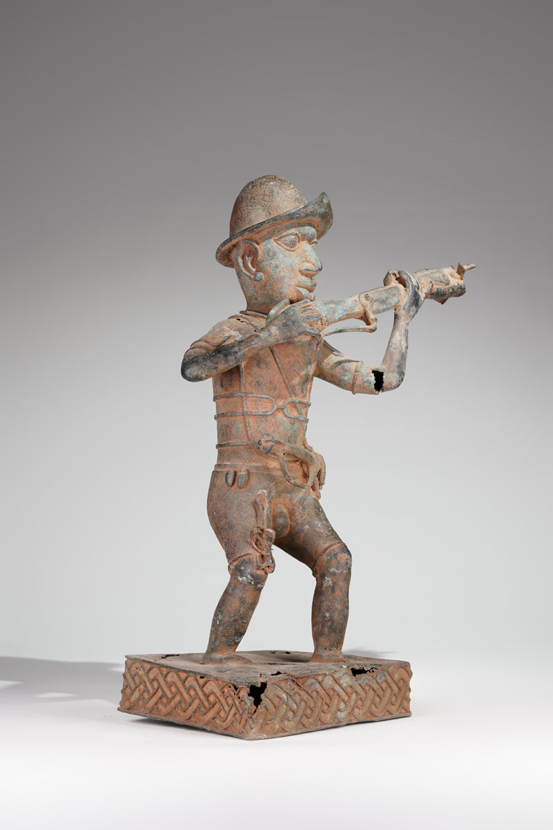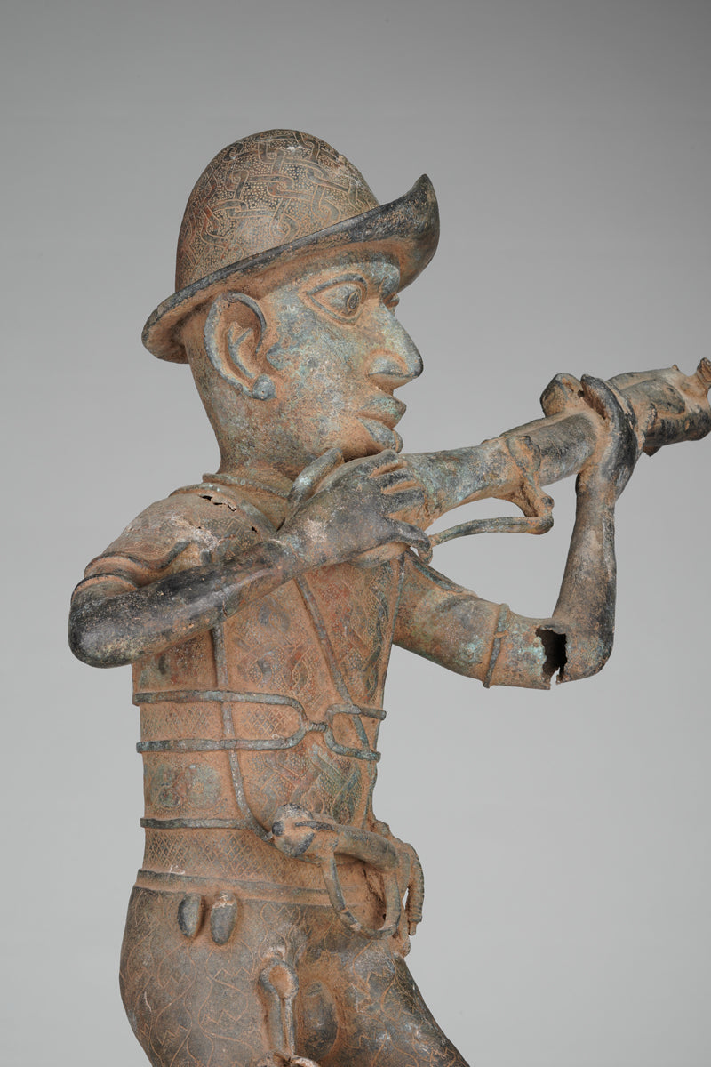Once the technique of lost-wax casting was mastered by the craftsmen of Benin, bronze heads and figures began to appear on the Oba's shrines. This figure of a court musician playing a side-blown trumpet attests to the technical virtuosity of the Benin bronze casters. The figure's elaborately textured garment depicts the hide of a leopard, an animal associated with the power of the Oba. Similarly, the strands of coral around his neck and chest reaffirm this musician's status in the Benin court, since coral, like bronze and ivory, is a royal prerogative in Benin. "