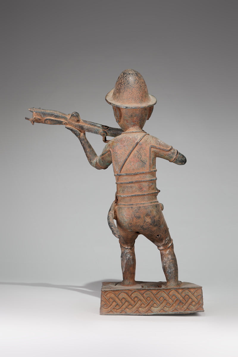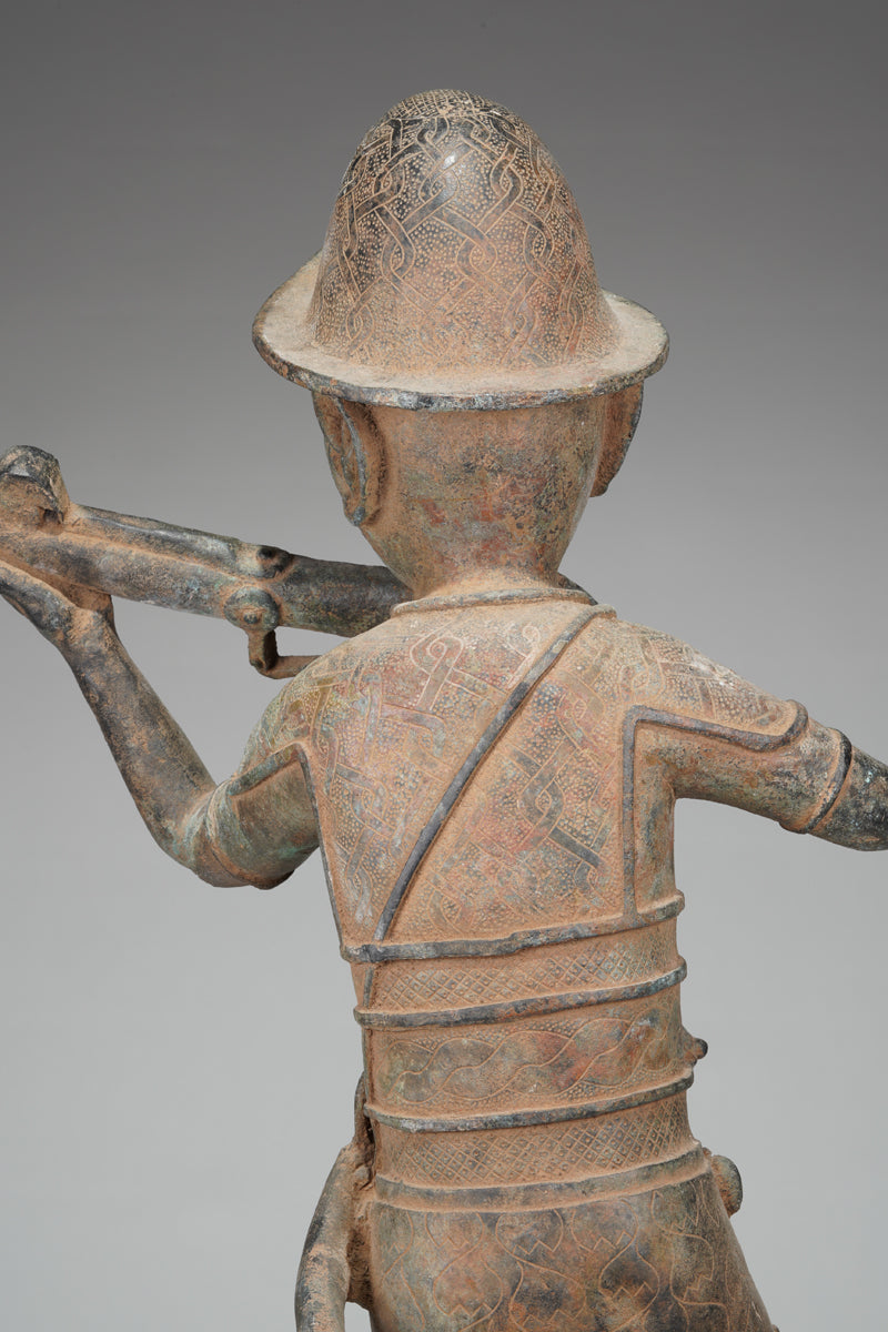 A copy of a sculpture in the Benin style, Okpia, lost wax cast in brass, depicting a soldier, holding a rifle and carrying a sword. He wears a helmet and armguard, he seems to be barefooted, standing on a square pedestal base decorated with interlace.