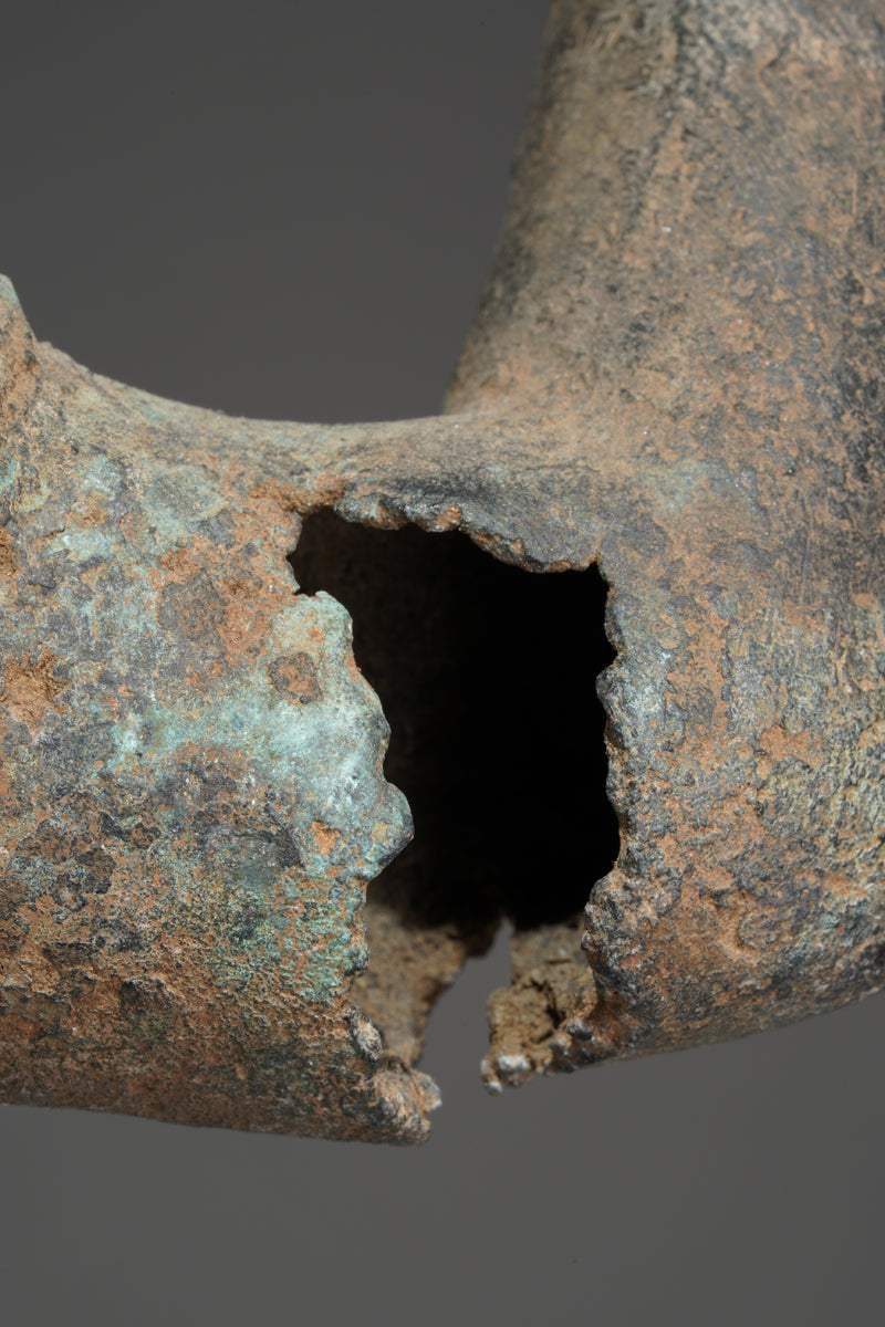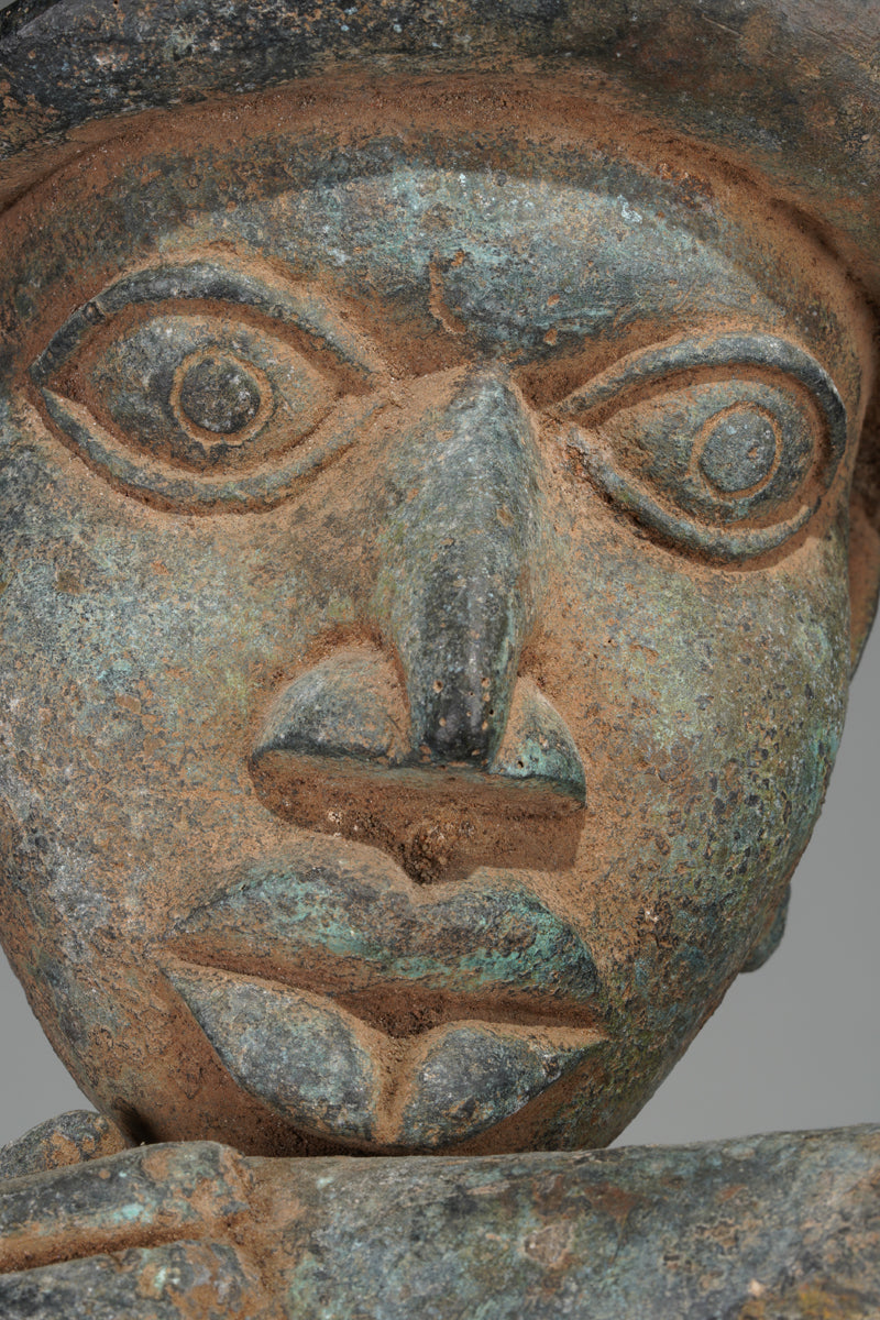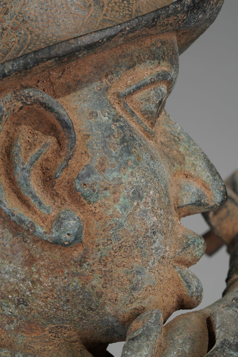 "In the art of Benin, works in bronze can be commissioned only by the Oba, or ruler, or by others with his permission. According to oral traditions, the technique of lost-wax bronze casting was brought to Benin around the end of the fourteenth century from Ife, the ancient kingdom to the north noted for its exquisite cast-bronze commemorative heads. Prior to that time, Benin craftsmen produced hammered and incised, but not cast, bronze ornaments.