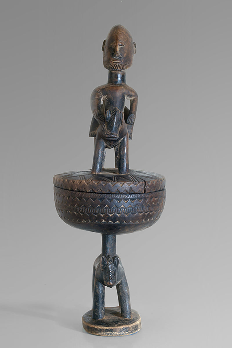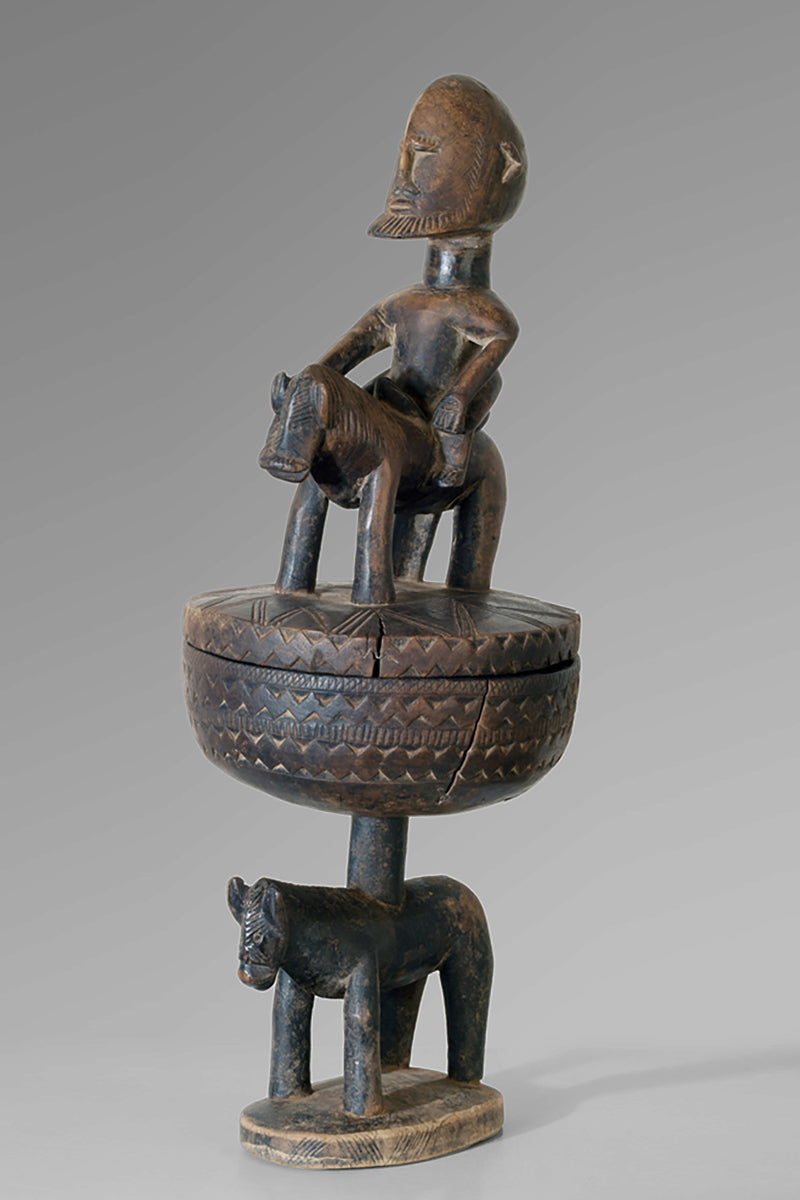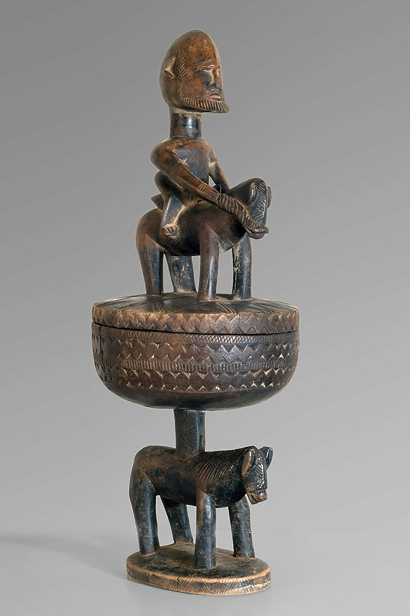 A Dogon Bowlkeeper, based on a rectangular rounded base, an animal supporting a covered bowl with a horseman on top.