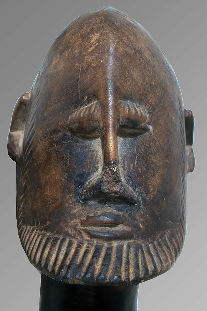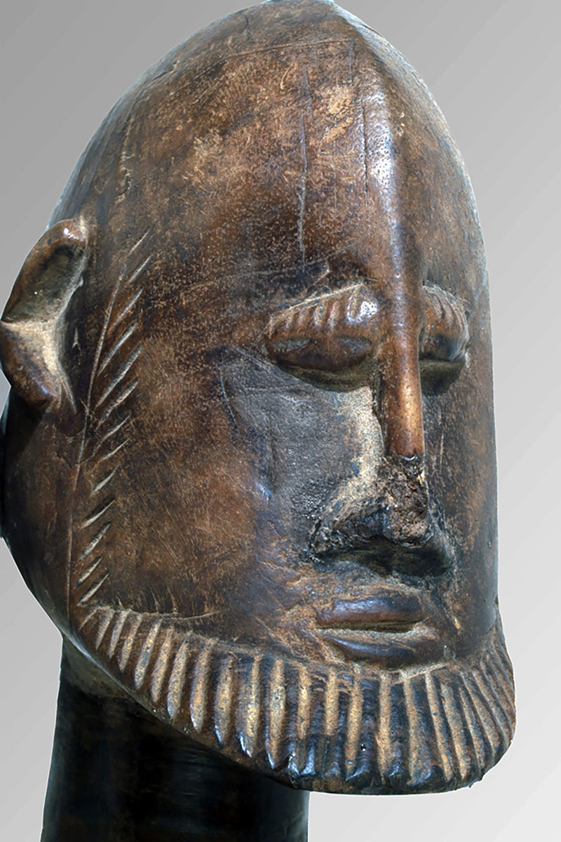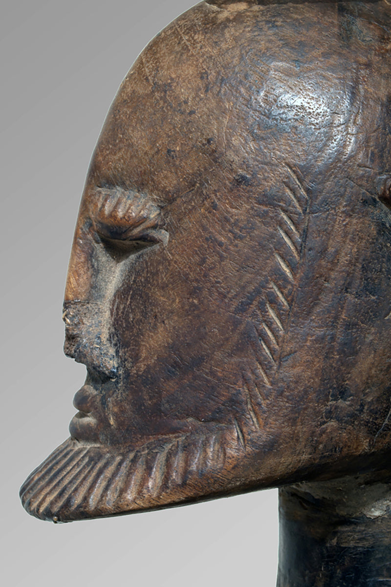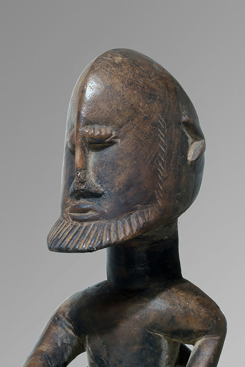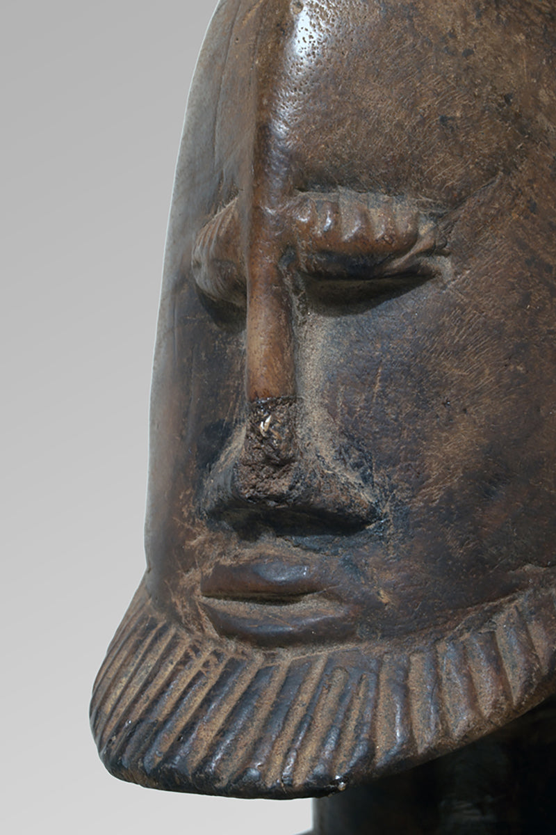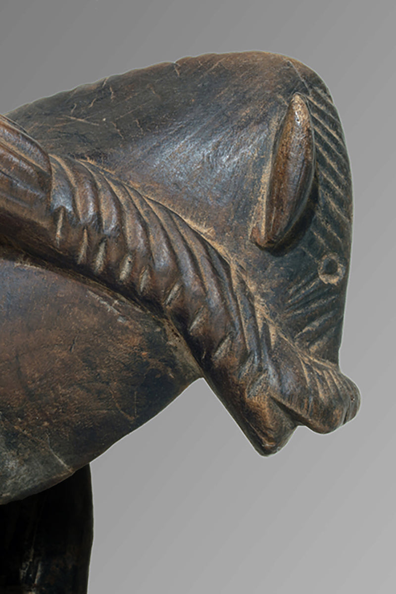 Kate Ezra (Art of the Dogon: New York, 1988, p. 40), writes of a similar equestrian figure: "Dogon figures depicting horses and riders reflect the prestige and power surrounding an animal that has been associated with royalty since horses were introduced to West Africa more than a thousand years ago...Dogon equestrian figures are most often identified as images of hogon, since in Dogon society horses are a luxury generally reserved for rich and powerfull people. Because horses occur in Dogon beliefs about the creation of the world, the hogon as rider is seen as a symbol of mythical personage. Thus, the equestrian hogon has been interpreted both as blacksmith, a mythical character who himself stands for Nommo, a being that represents order in the universe, and as Lebe, a primordial ancestor, whose cult, over which the hogon presides, is concerned with fertility and regeneration of the earth.