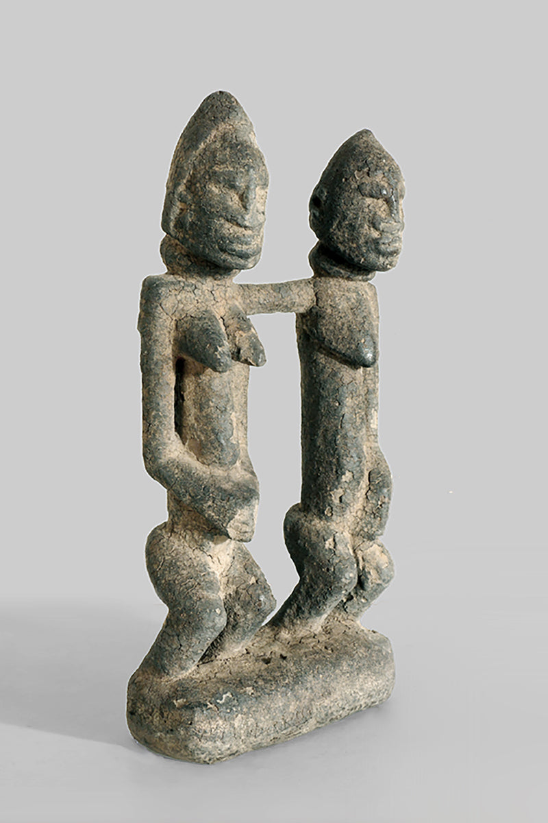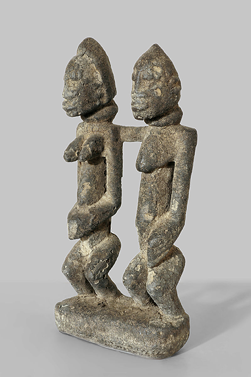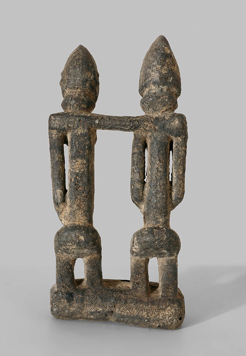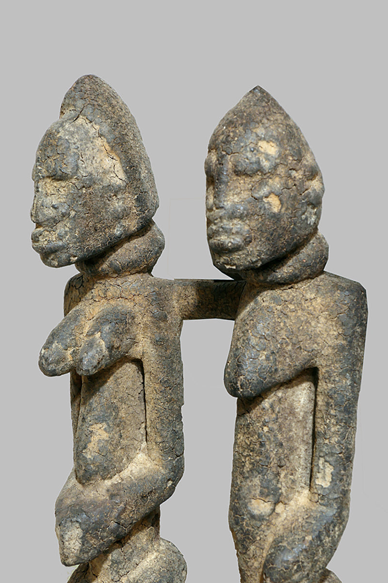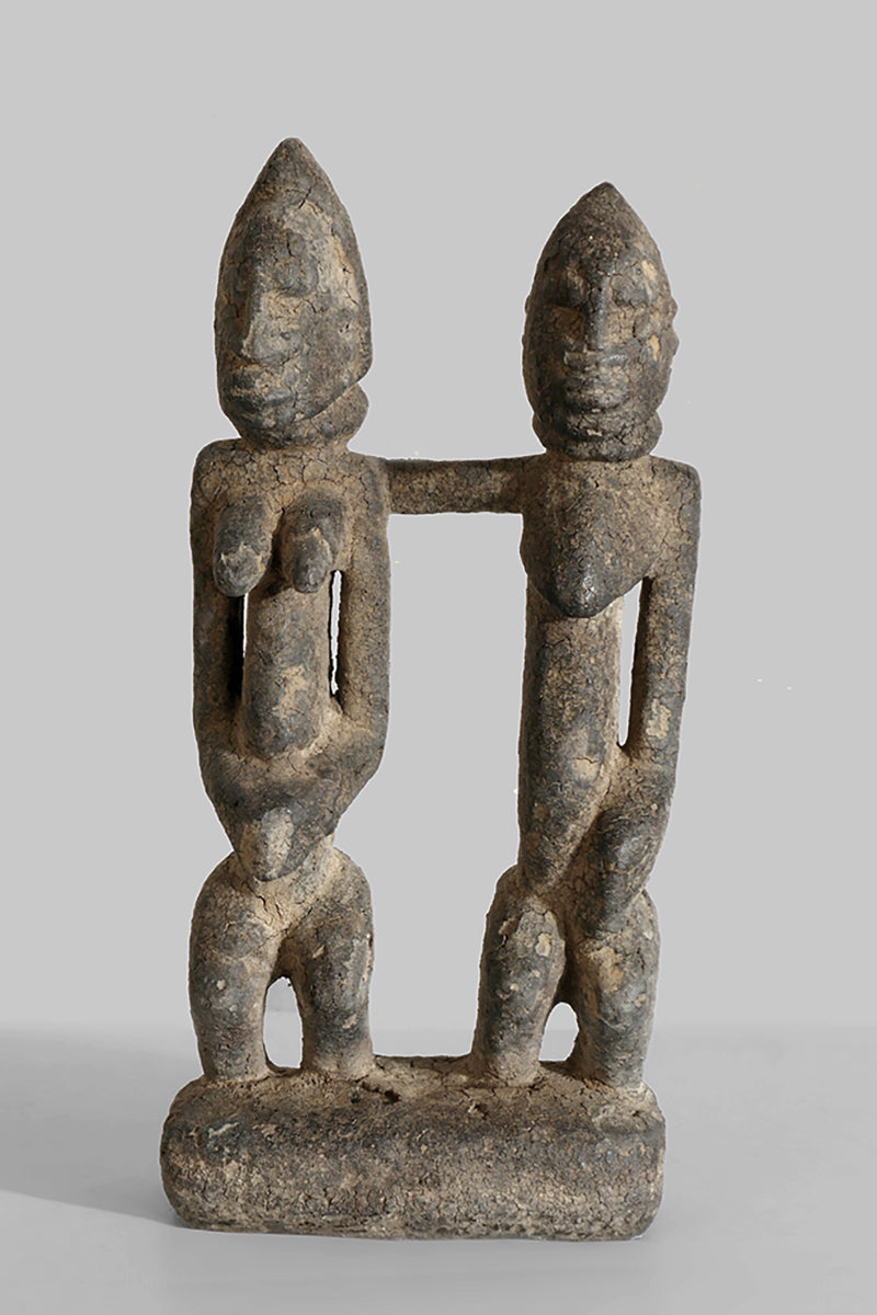 A Dogon couple, heavy encrusted, standing on a rectangular, rounded base.