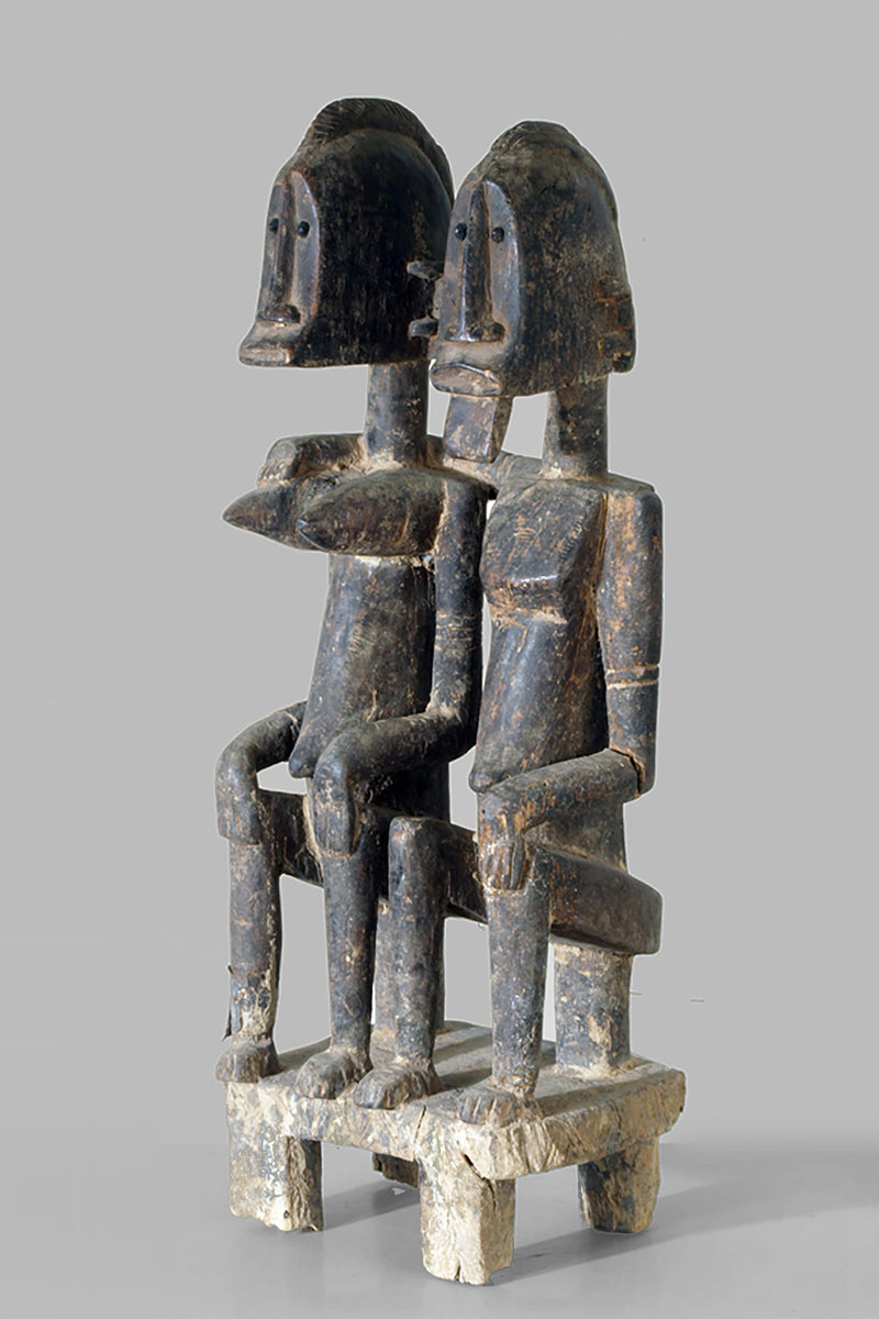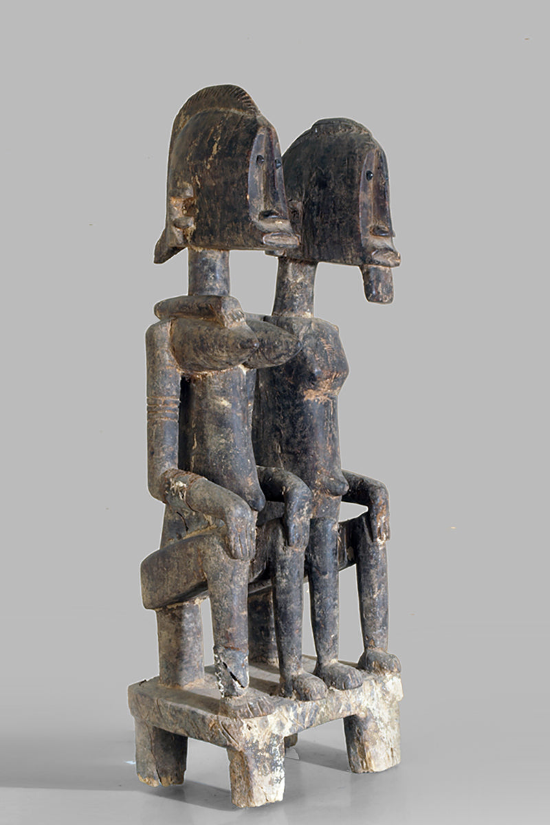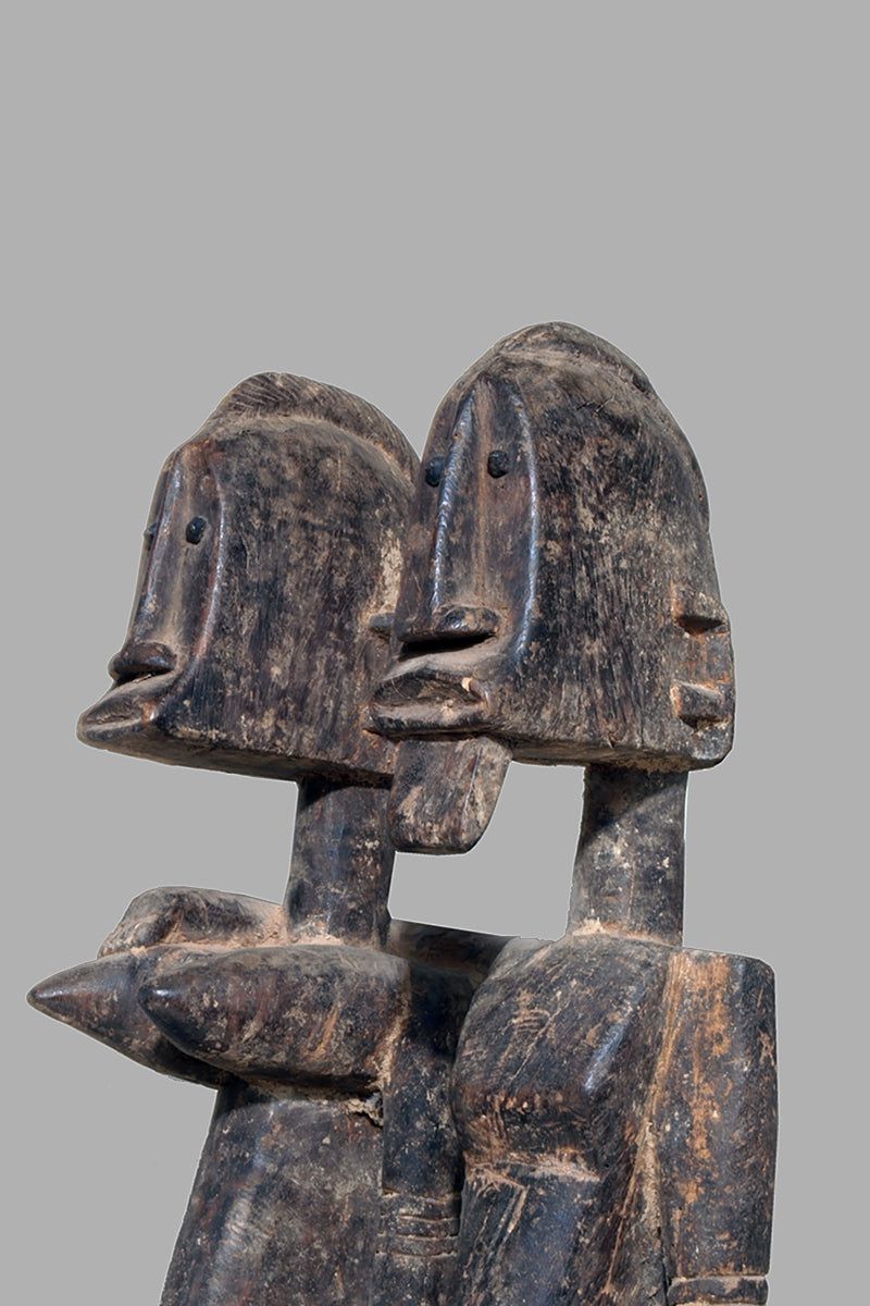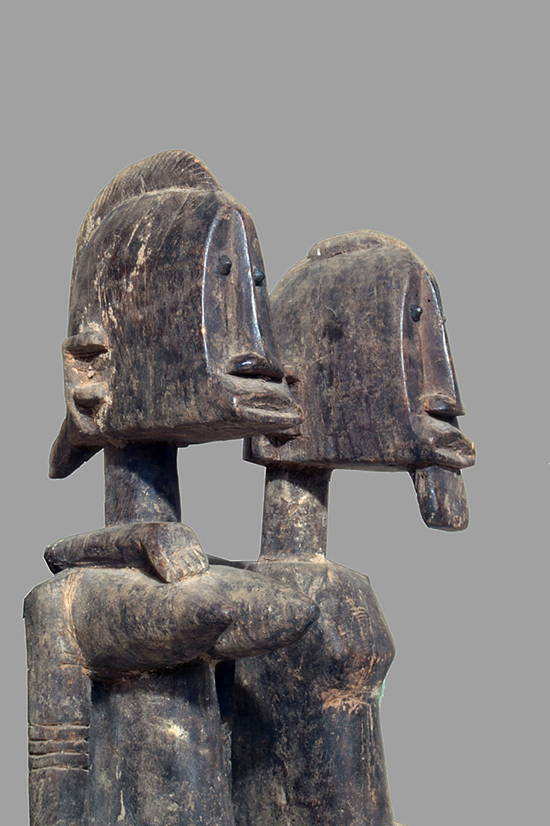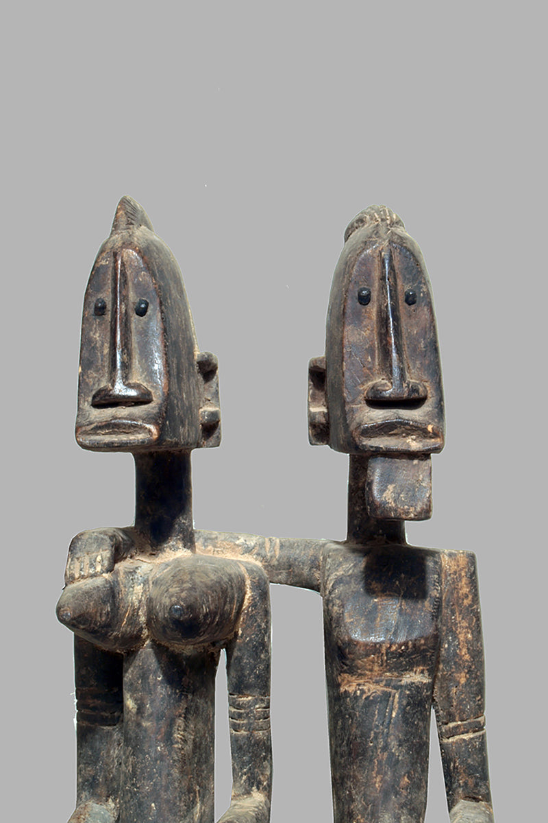 "This sculpture gives eloquent expression to the shared and symmetrical responsibilities of men and women in Dogon society. The virtually identical forms of the male and female protagonists in this visual commentary accentuate the parity of their subtly distinctive roles. The two figures share lucid, graphic, and repeated elongated vertical elements with only infrequent differences. For example, on the male figure, a beard extends the chin while the female figure wears a labret, an ornament in the lip. Additionally, where he has a smooth torso, she has elongated breasts that droop from the suckling of multiple children. On the reverse side, the female figure carries a baby on her back, the male a quiver. She is responsible for child care, he for providing sustenance. He has one hand on his genitals and the other protectively draped across her shoulders and resting on her breast. This emphasizes their mutual roles in procreation and nurturing. Male and female are connected to one another by his gesture, but additionally are articulated as discrete units. This approach reflects Dogon attitudes toward marriage as a partnership of independent equals. This balanced duality is also a central tenet of Dogon mythology. The small, crudely depicted figures at the base of the stool may represent the supportive role the ancestors play in the lives of the living. Their rough angularity contrasts with the elegance and stature of the elongated figures above. The particularly high level of finish of the work as a whole, its smooth surfaces, intricate detailing in the face and hair, and lack of sacrificial material indicate that this sculpture was not intended for an ancestral shrine, but rather was displayed at funerals. This interpretation is supported by the presence of iron ornamentation in the hair, ears, and on the wrists of the figures, since iron adornment is historically worn or placed next to the dead during Dogon funerals" Source Metropolitan Museum of the couple on the cover of the book about "The Dogon Couple"