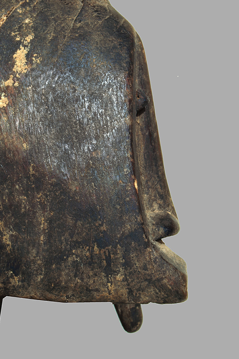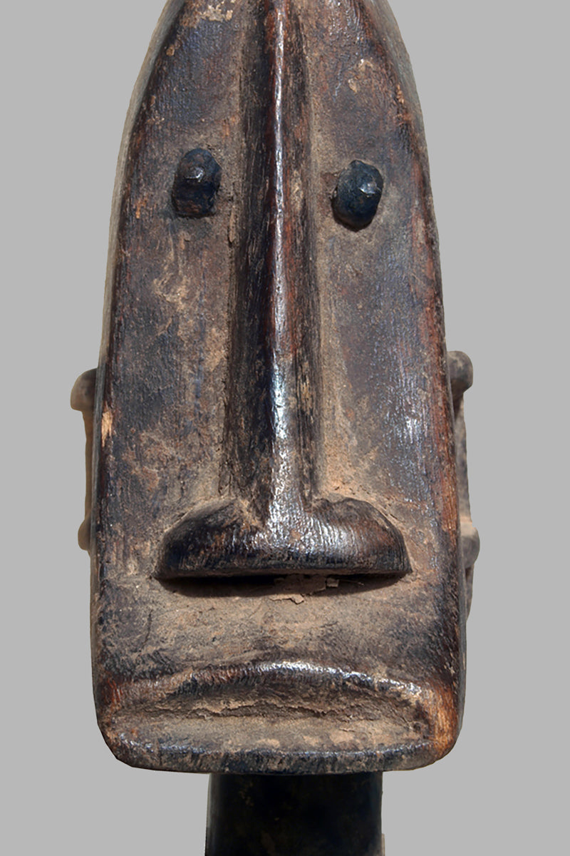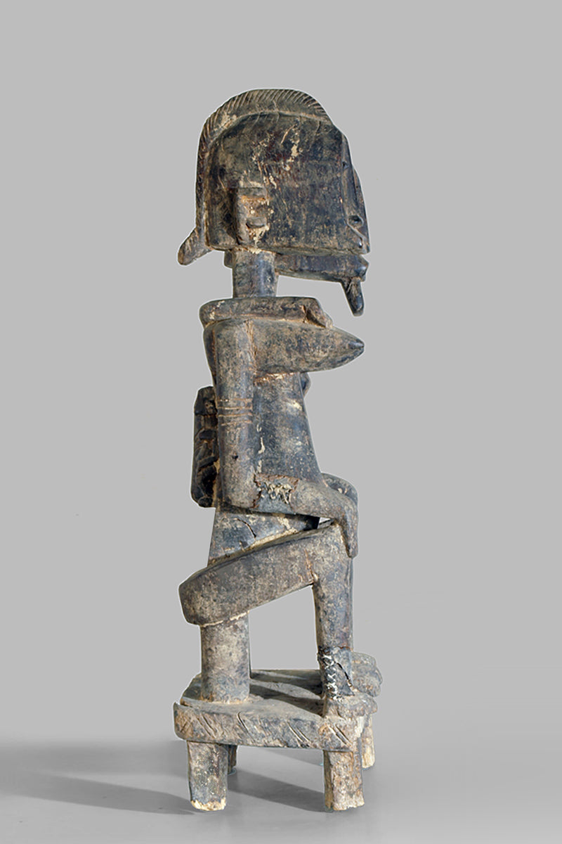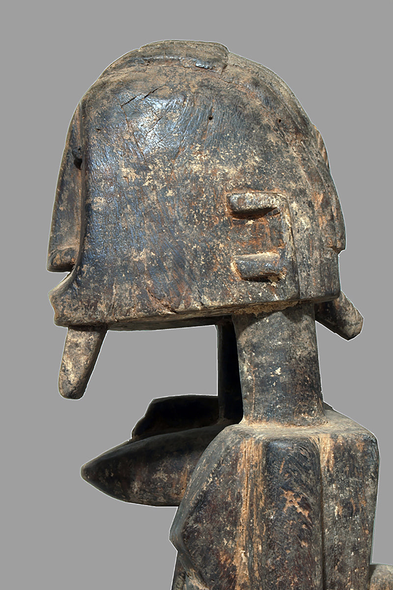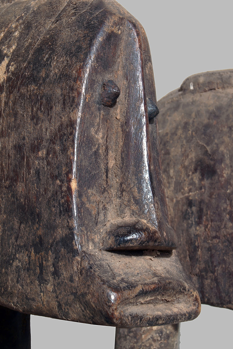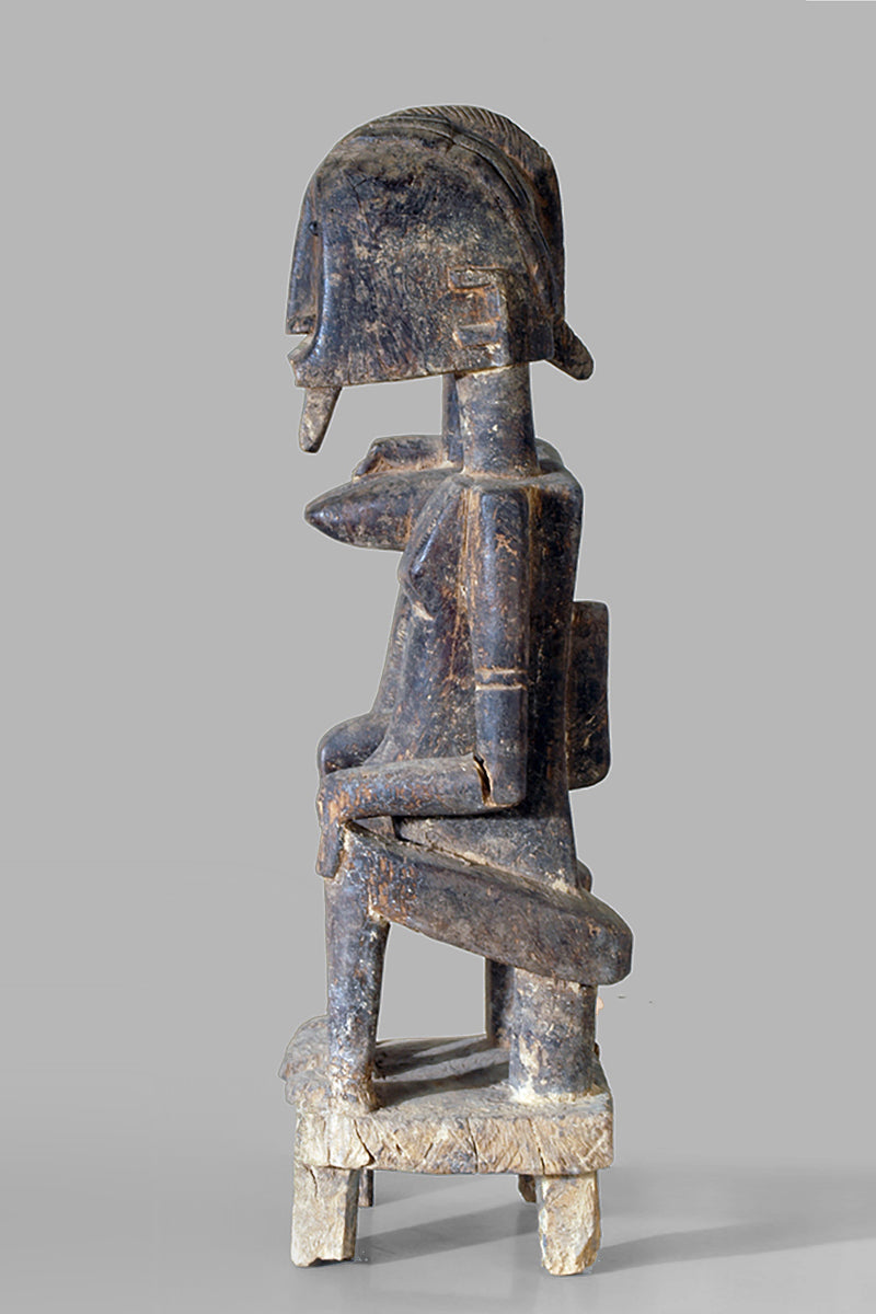 "This sculpture gives eloquent expression to the shared and symmetrical responsibilities of men and women in Dogon society. The virtually identical forms of the male and female protagonists in this visual commentary accentuate the parity of their subtly distinctive roles. The two figures share lucid, graphic, and repeated elongated vertical elements with only infrequent differences. For example, on the male figure, a beard extends the chin while the female figure wears a labret, an ornament in the lip. Additionally, where he has a smooth torso, she has elongated breasts that droop from the suckling of multiple children. On the reverse side, the female figure carries a baby on her back, the male a quiver. She is responsible for child care, he for providing sustenance. He has one hand on his genitals and the other protectively draped across her shoulders and resting on her breast. This emphasizes their mutual roles in procreation and nurturing. Male and female are connected to one another by his gesture, but additionally are articulated as discrete units. This approach reflects Dogon attitudes toward marriage as a partnership of independent equals. This balanced duality is also a central tenet of Dogon mythology. The small, crudely depicted figures at the base of the stool may represent the supportive role the ancestors play in the lives of the living. Their rough angularity contrasts with the elegance and stature of the elongated figures above. The particularly high level of finish of the work as a whole, its smooth surfaces, intricate detailing in the face and hair, and lack of sacrificial material indicate that this sculpture was not intended for an ancestral shrine, but rather was displayed at funerals. This interpretation is supported by the presence of iron ornamentation in the hair, ears, and on the wrists of the figures, since iron adornment is historically worn or placed next to the dead during Dogon funerals" Source Metropolitan Museum of the couple on the cover of the book about "The Dogon Couple"