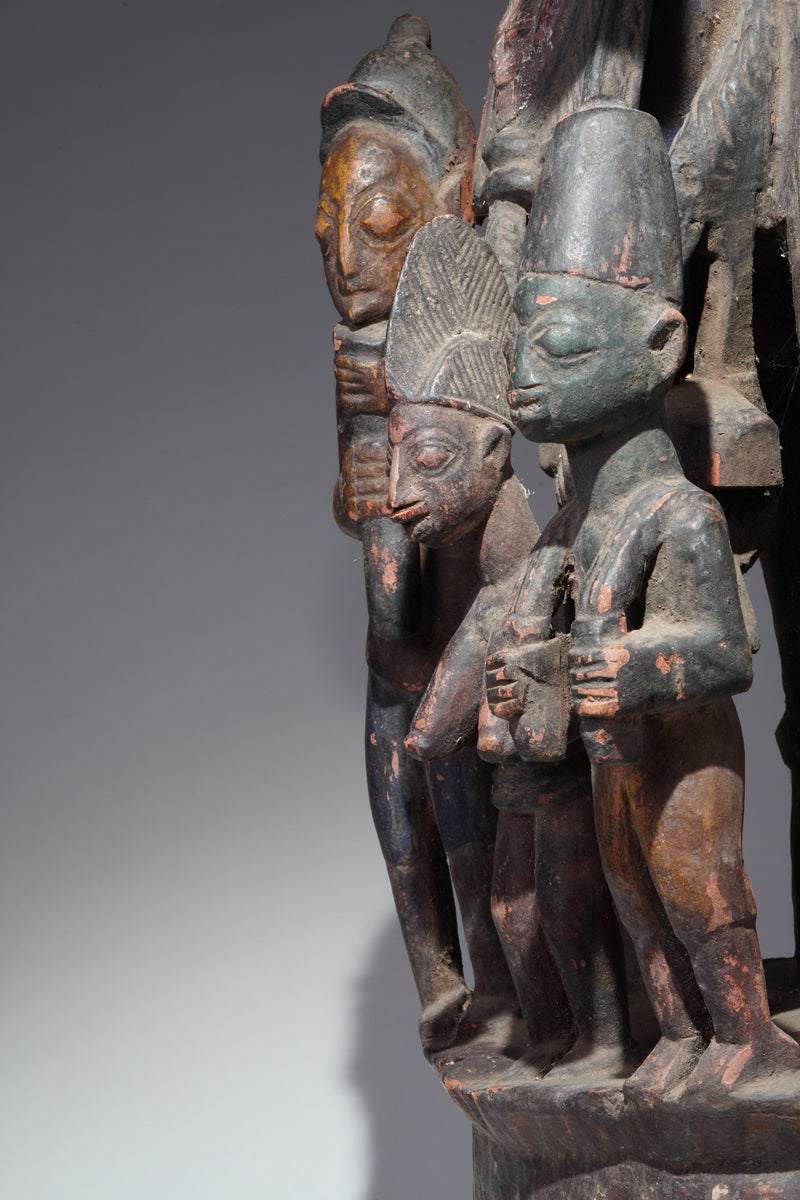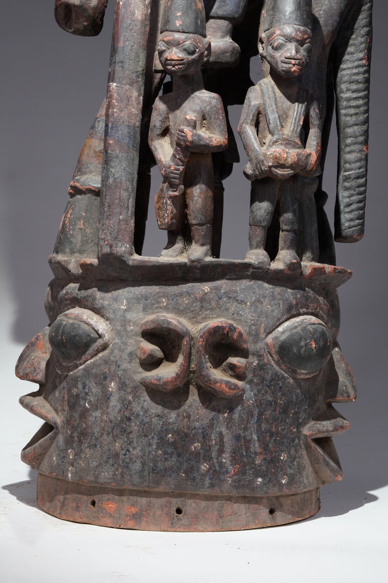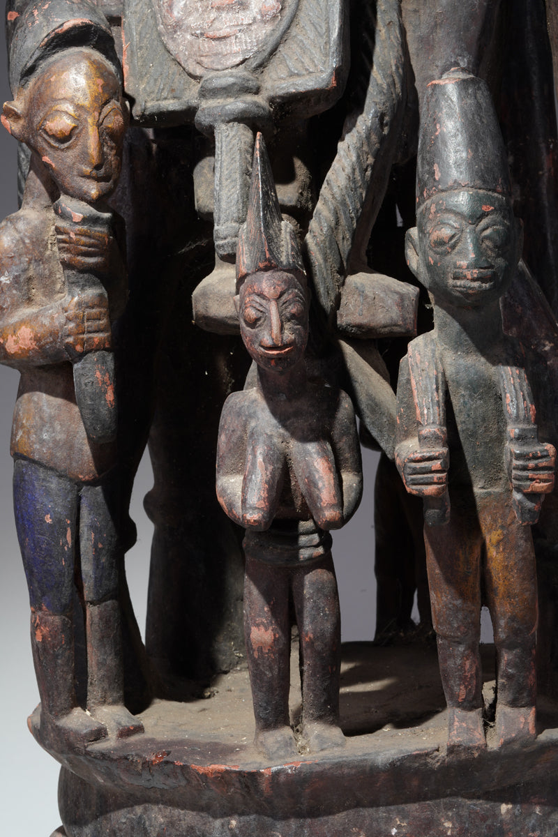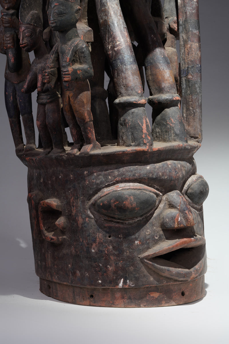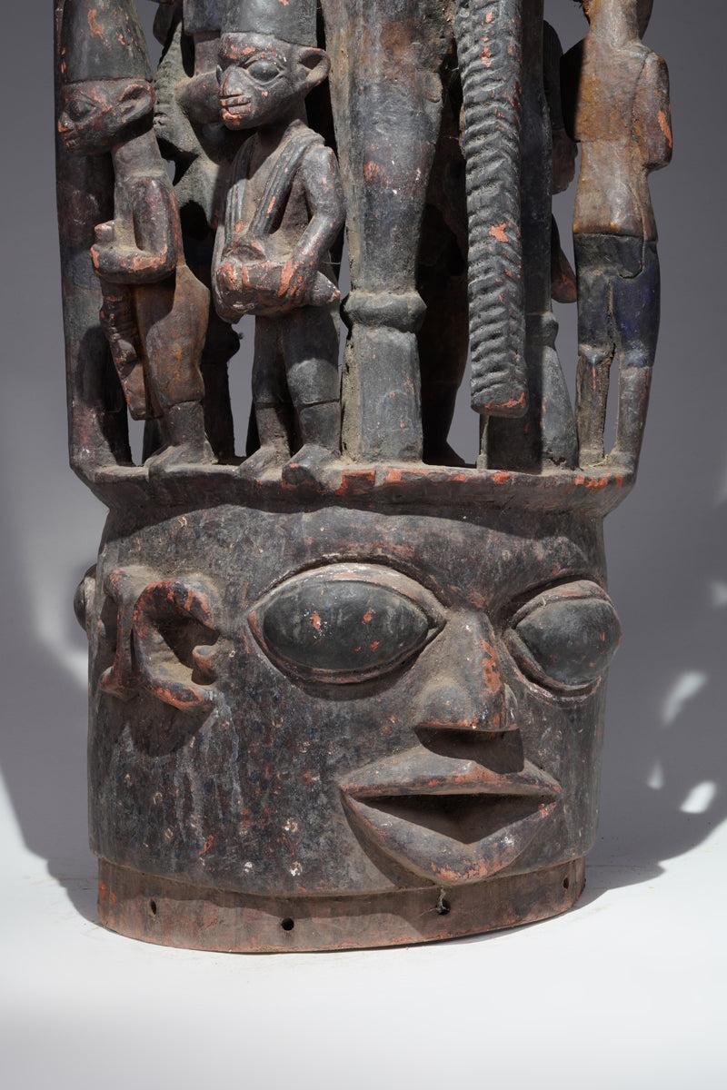Attribution to Olowe of Ise situates the mask within a corpus renowned for dynamism, compositional complexity, and technical refinement. Active in the early decades of the twentieth century in Ise-Ekiti, Olowe developed a sculptural language distinguished by elongated proportions, animated surface rhythms, and a sophisticated orchestration of positive and negative space. His figures frequently engage in interlocking gestures, creating a sense of narrative momentum even in static wood. When applied to an Epa helmet, these traits result in an architecture of forms that rises dramatically above the wearer’s head: superstructures populated by equestrian figures, attendants, or emblematic motifs, all carved in high relief and integrated into a coherent vertical thrust.
