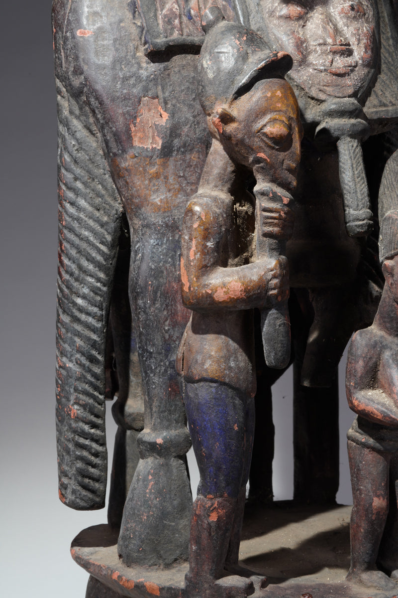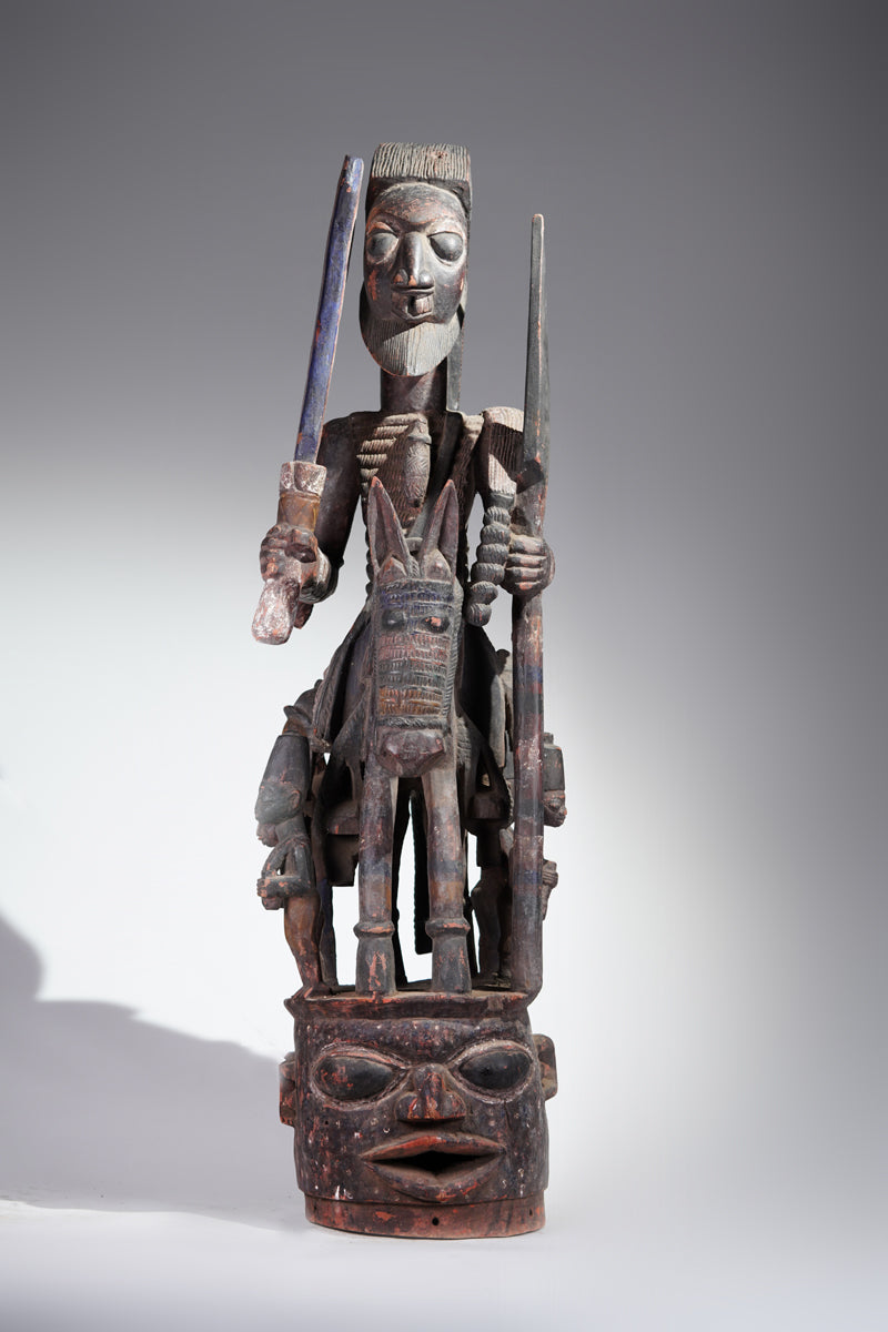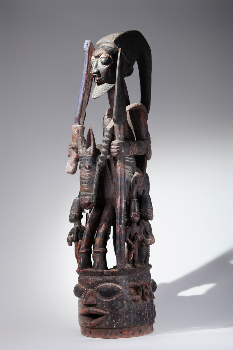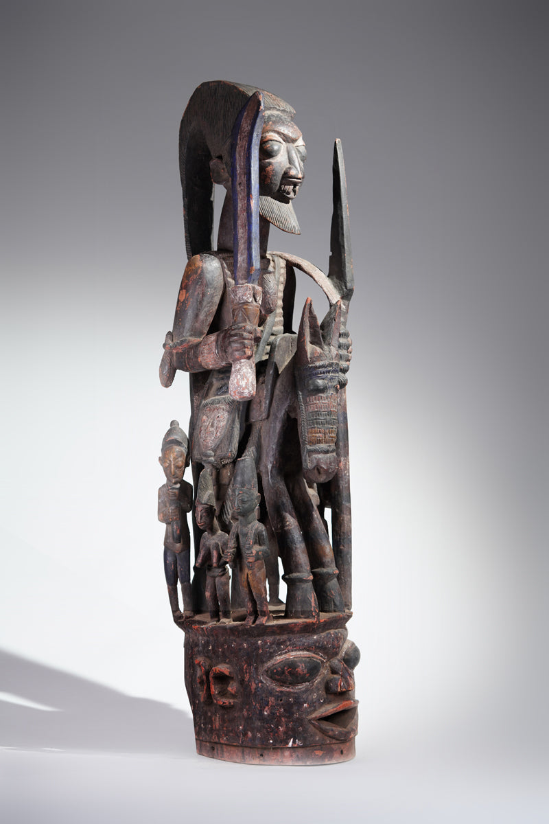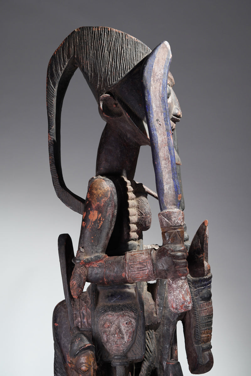 Attribution to Olowe of Ise situates the mask within a corpus renowned for dynamism, compositional complexity, and technical refinement. Active in the early decades of the twentieth century in Ise-Ekiti, Olowe developed a sculptural language distinguished by elongated proportions, animated surface rhythms, and a sophisticated orchestration of positive and negative space. His figures frequently engage in interlocking gestures, creating a sense of narrative momentum even in static wood. When applied to an Epa helmet, these traits result in an architecture of forms that rises dramatically above the wearer’s head: superstructures populated by equestrian figures, attendants, or emblematic motifs, all carved in high relief and integrated into a coherent vertical thrust.