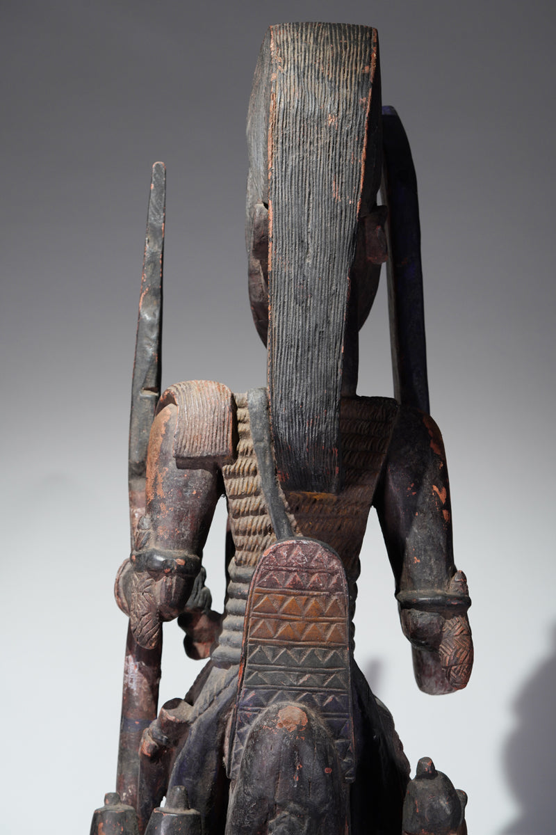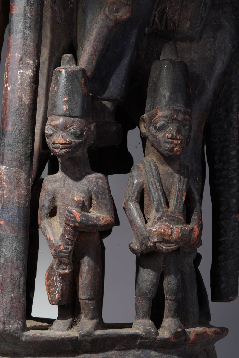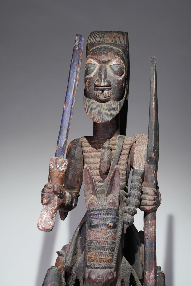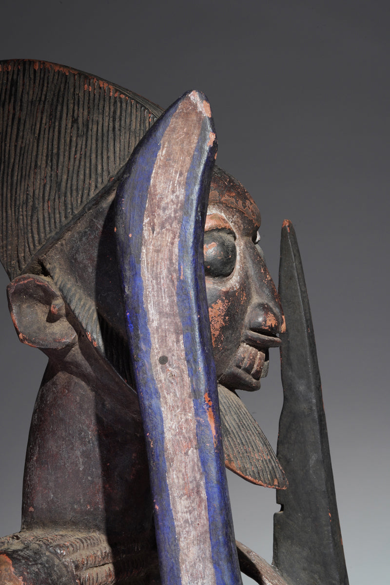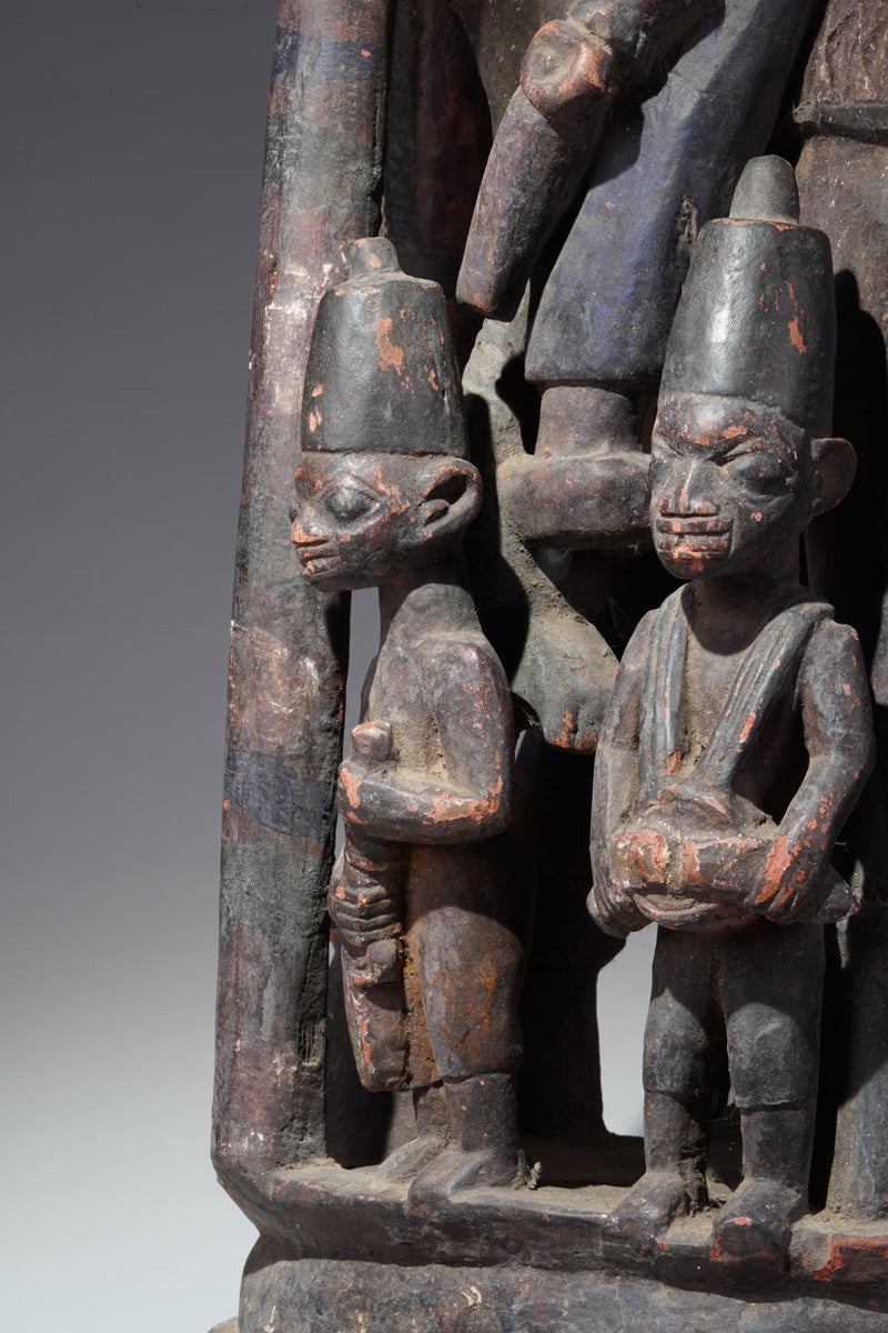 Attribution to Olowe of Ise situates the mask within a corpus renowned for dynamism, compositional complexity, and technical refinement. Active in the early decades of the twentieth century in Ise-Ekiti, Olowe developed a sculptural language distinguished by elongated proportions, animated surface rhythms, and a sophisticated orchestration of positive and negative space. His figures frequently engage in interlocking gestures, creating a sense of narrative momentum even in static wood. When applied to an Epa helmet, these traits result in an architecture of forms that rises dramatically above the wearer’s head: superstructures populated by equestrian figures, attendants, or emblematic motifs, all carved in high relief and integrated into a coherent vertical thrust.