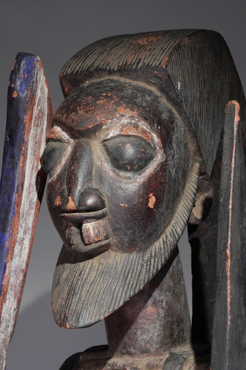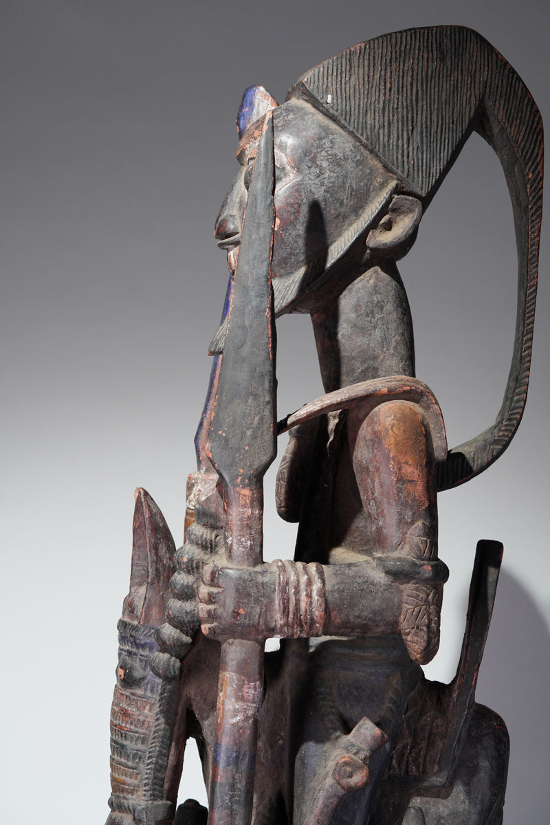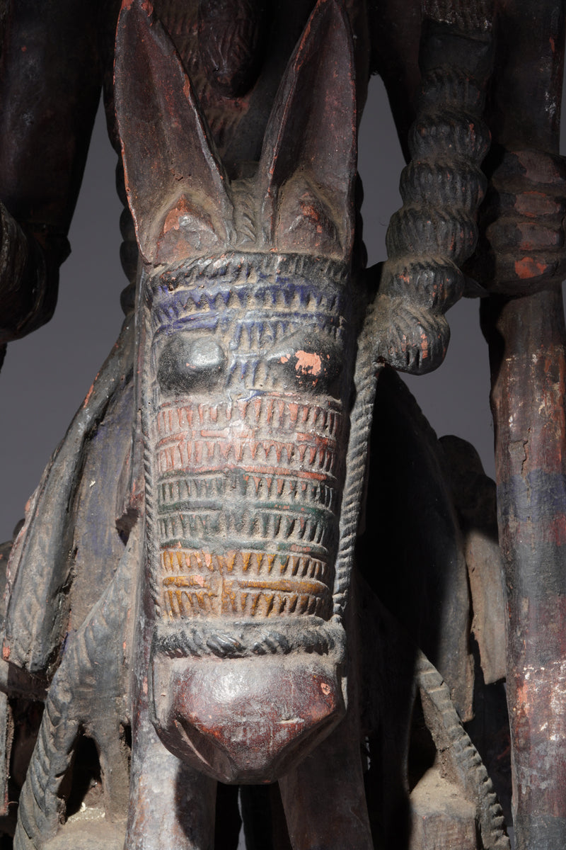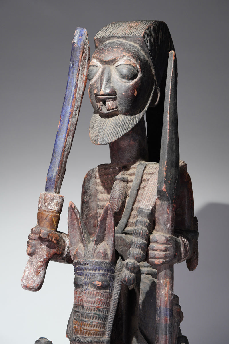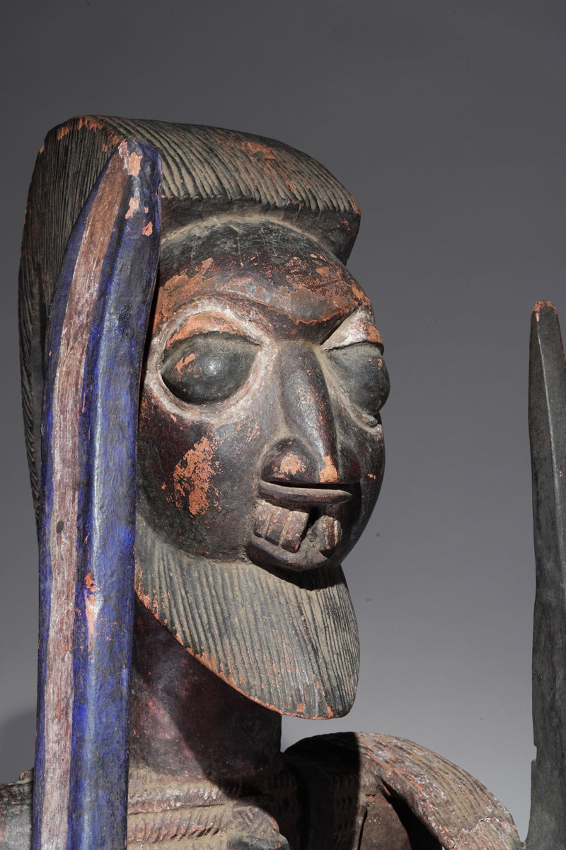 Attribution to Olowe of Ise situates the mask within a corpus renowned for dynamism, compositional complexity, and technical refinement. Active in the early decades of the twentieth century in Ise-Ekiti, Olowe developed a sculptural language distinguished by elongated proportions, animated surface rhythms, and a sophisticated orchestration of positive and negative space. His figures frequently engage in interlocking gestures, creating a sense of narrative momentum even in static wood. When applied to an Epa helmet, these traits result in an architecture of forms that rises dramatically above the wearer’s head: superstructures populated by equestrian figures, attendants, or emblematic motifs, all carved in high relief and integrated into a coherent vertical thrust.