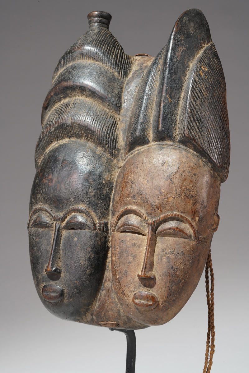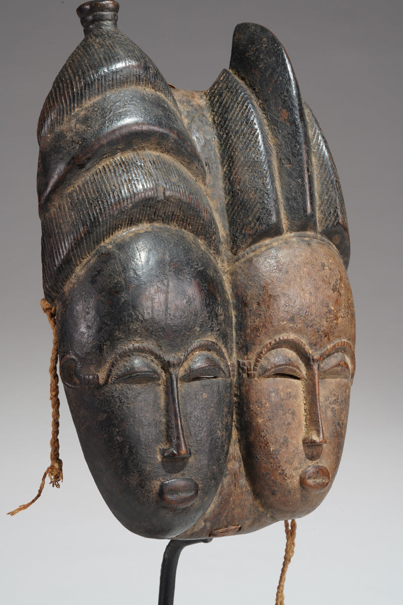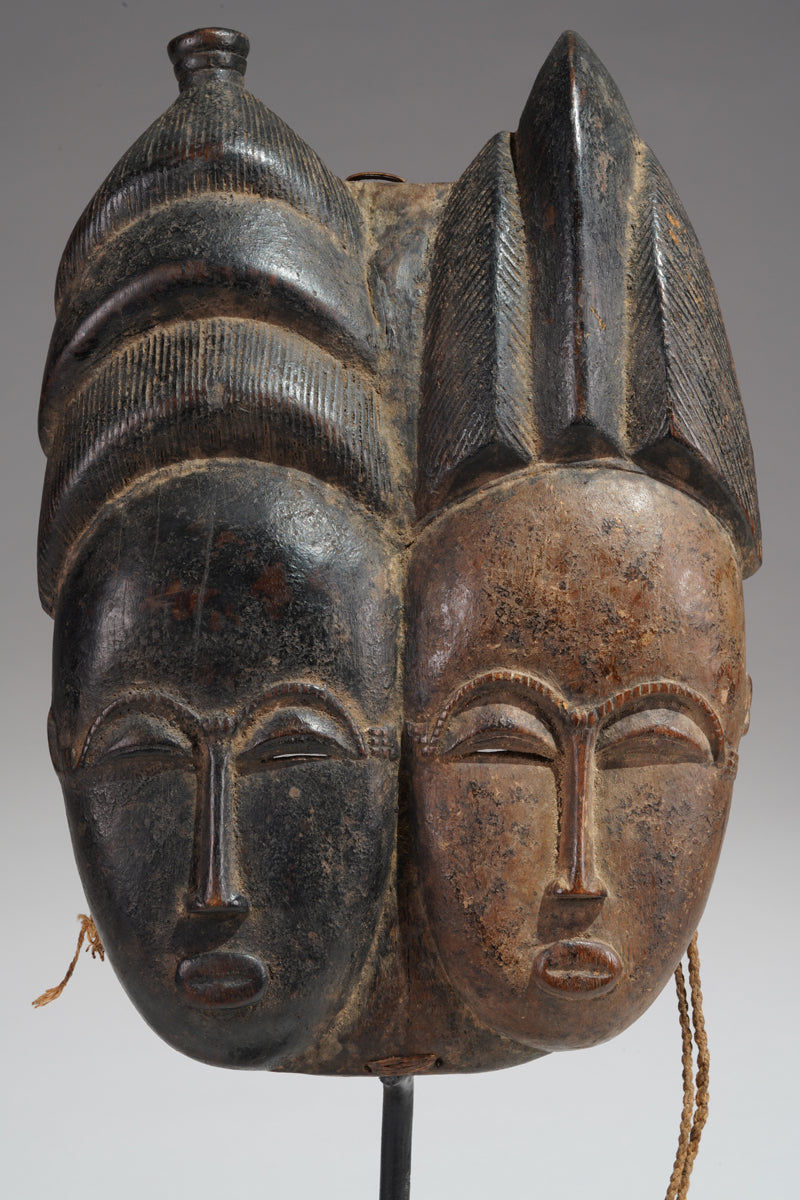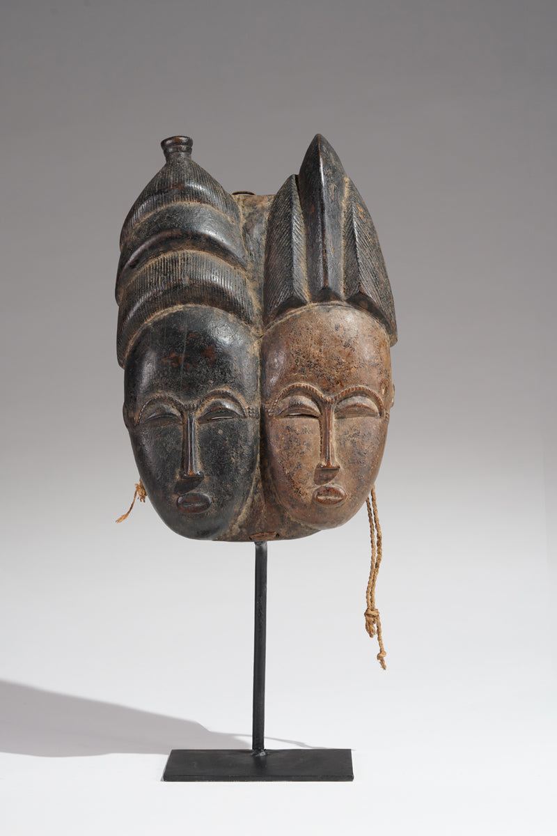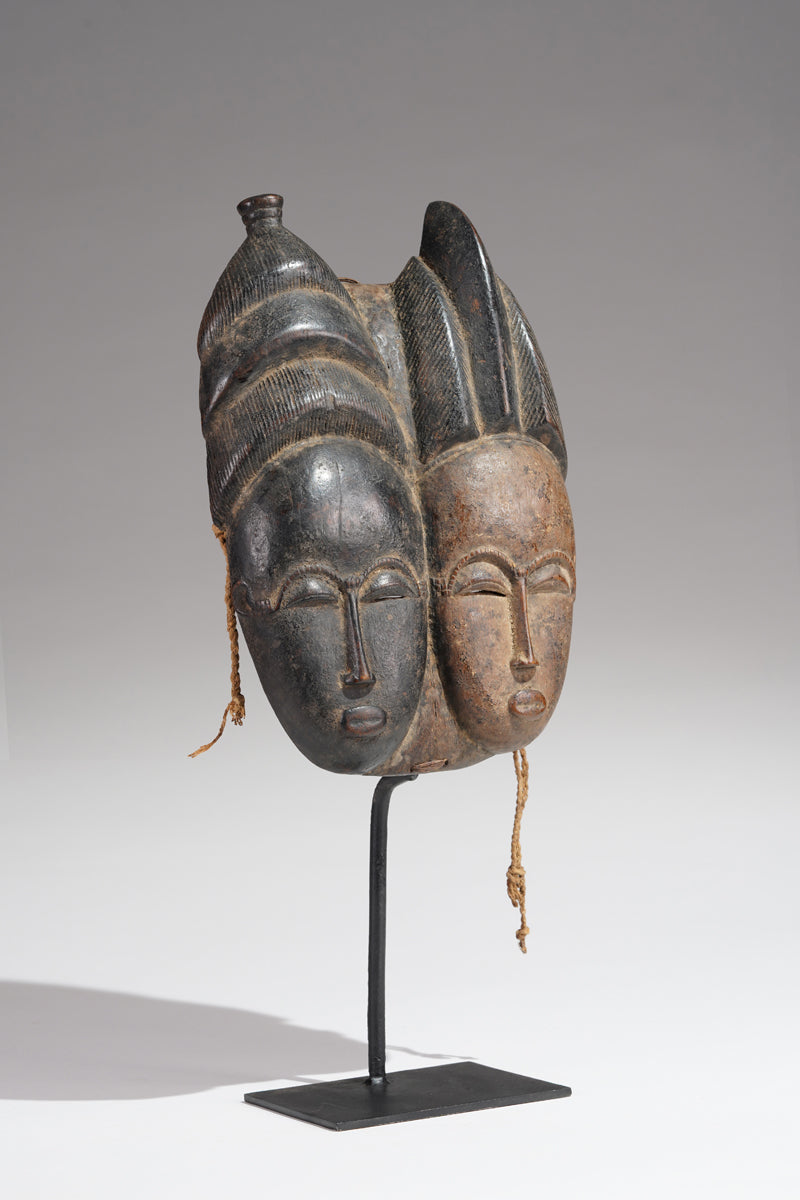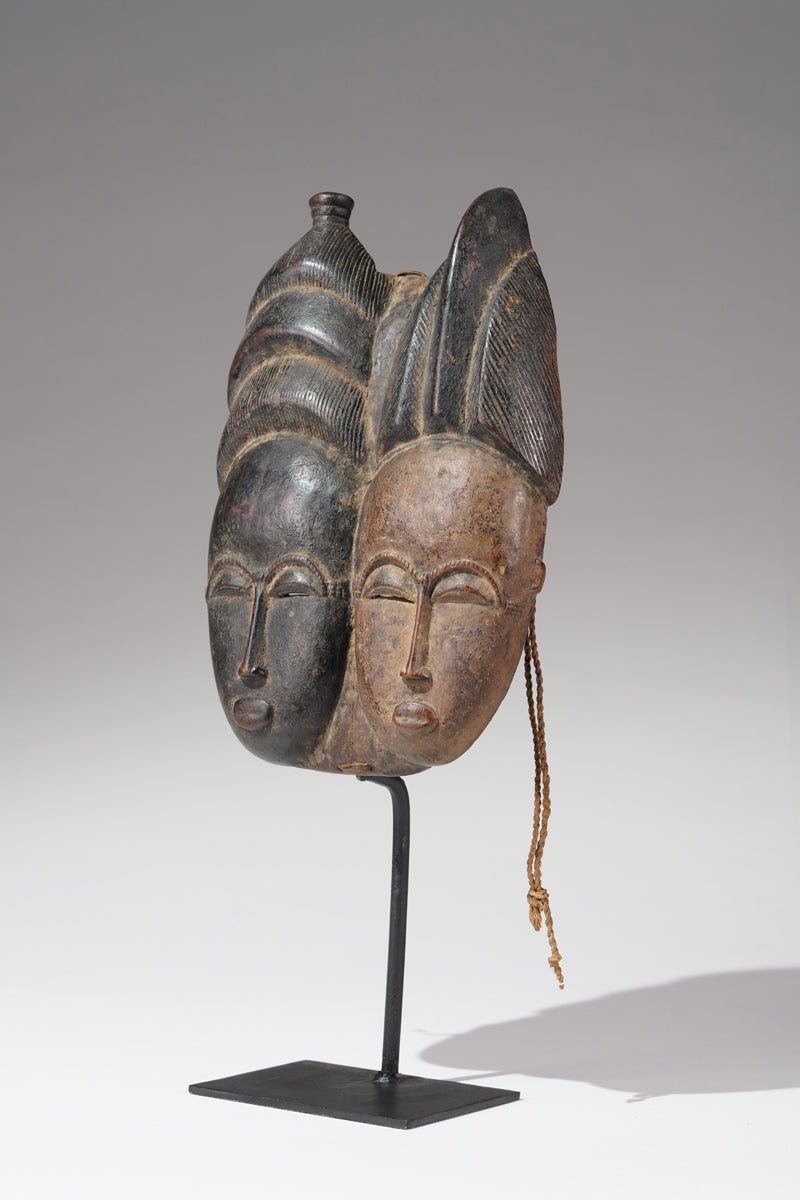 A double-head Baule mask, Cote d'Ivoire. collected in the Sakassou region, provenance Bakari Bouaflé, textured patina, signs of ritual use and age. Certificate of origin and provenance.