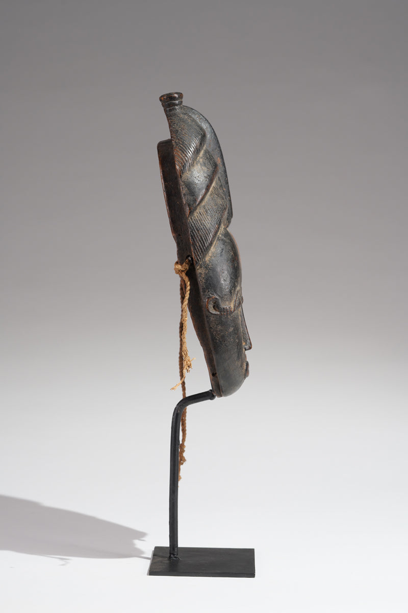 In this mask, formerly in the collection of the Parisian gallerist Paul Guillaume, delicate oval red and black faces whose features are mirror images of one another are juxtaposed side by side. The red face on the proper right side is slightly higher and the crowning element of the vertical coiffure is narrower and taller than that which surmounts the black face. Highly stylized, each face is circumscribed by bands of incised abstract design. The facial features are carved in relief so that the double arc of the brows is bisected by the narrow ridge of the nose above a raised circular mouth. The elements of asymmetry are subtly introduced to energize the composition."
