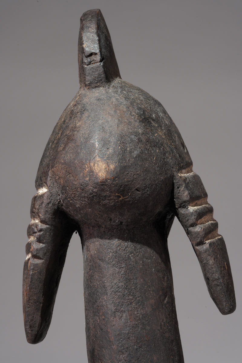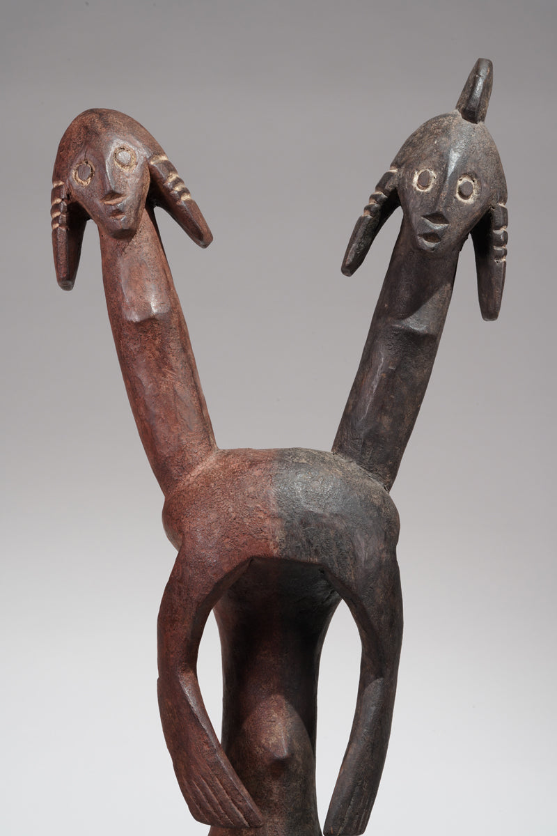 The presence of two heads in these figures is not merely a formal choice but carries significant symbolic meaning. Dual-headed forms are commonly interpreted as representing duality or complementarity—such as male and female, past and future, or the earthly and the spiritual [2]. In the Mumuye cosmology, such polarities are often viewed as interconnected and interdependent, and figures with two heads may serve as mediators between these opposing forces. Some interpretations suggest that the two heads allow the figure to “see” in multiple directions, reinforcing a protective or watchful function within a community context [3].