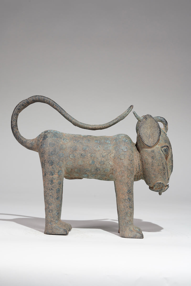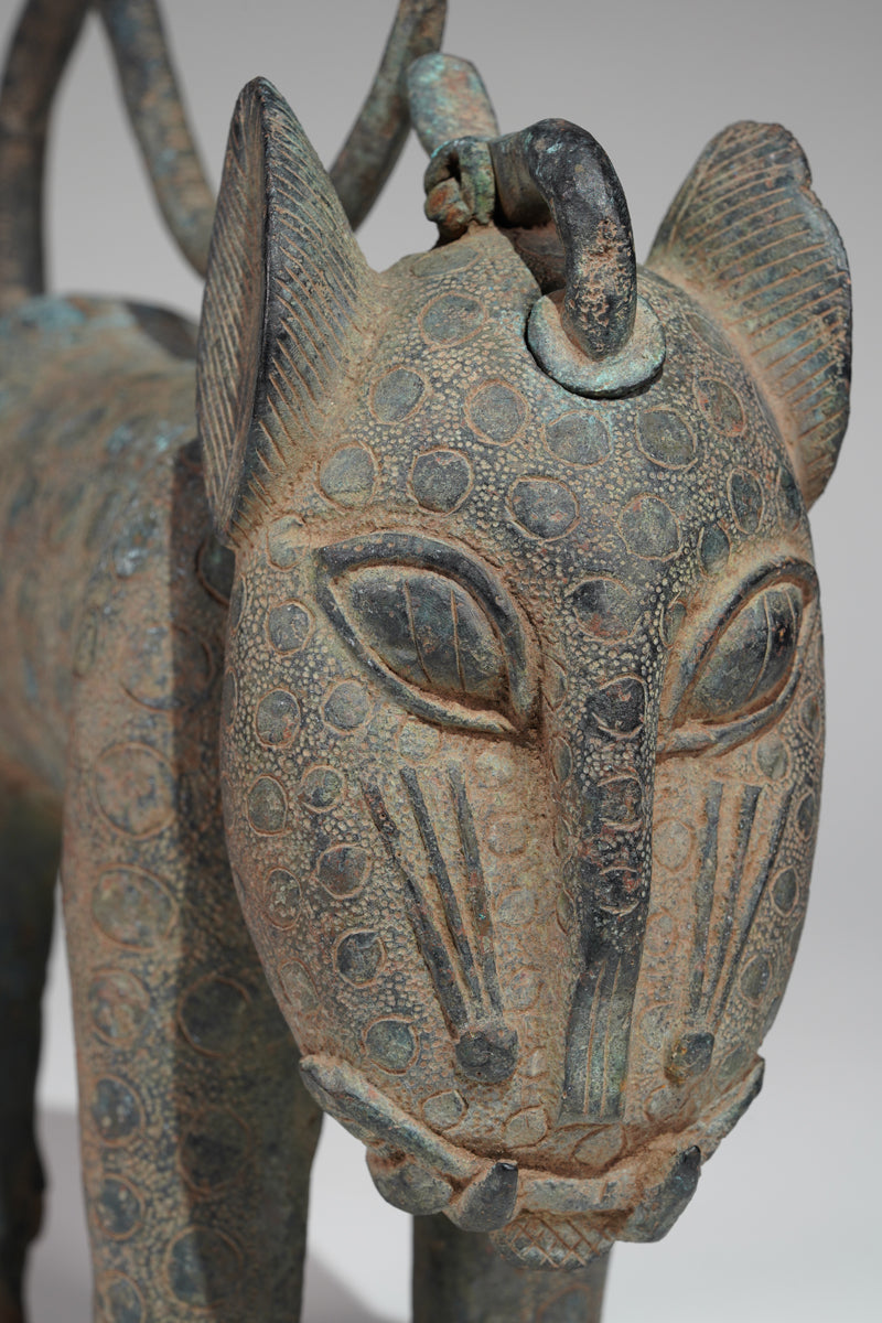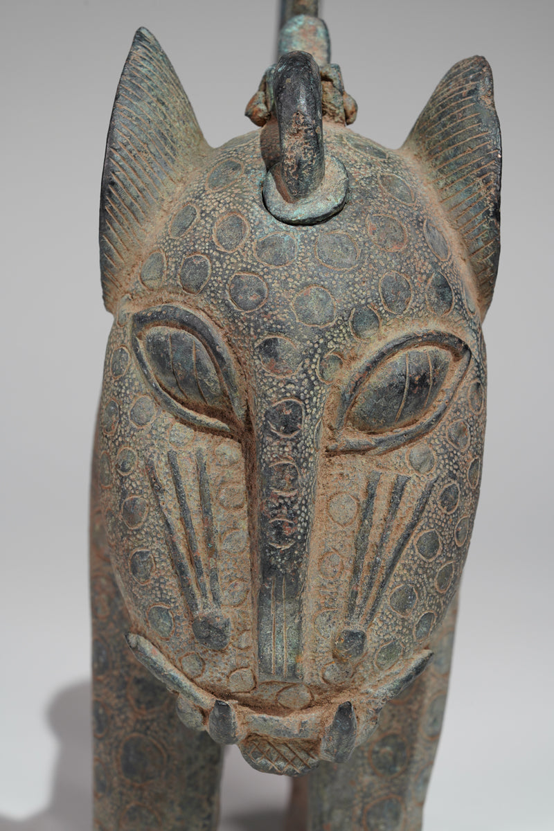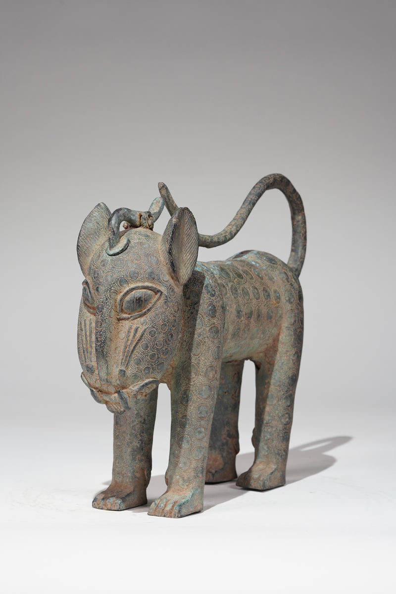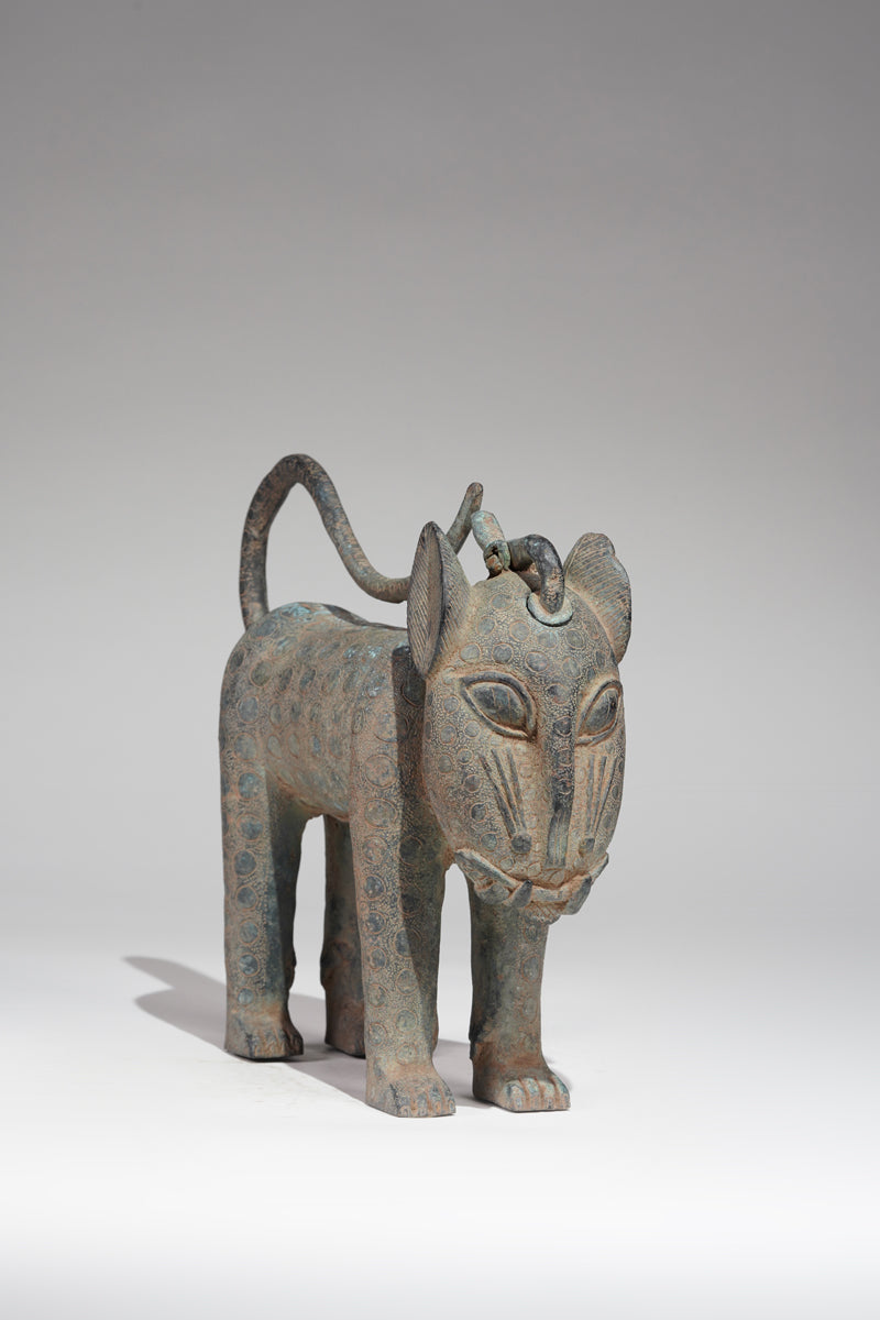 After dressing for Ugie Erha Oba, the ceremony that honors his paternal ancestors, the Oba washes his hands with water poured from an aquamanile in the form of a leopard, such as this one. It has a small, round, hinged opening at the top of the head through which is can be filled with water, which is then poured out through the pierced nostrils. The tail, arching over the back, serves as a handle."