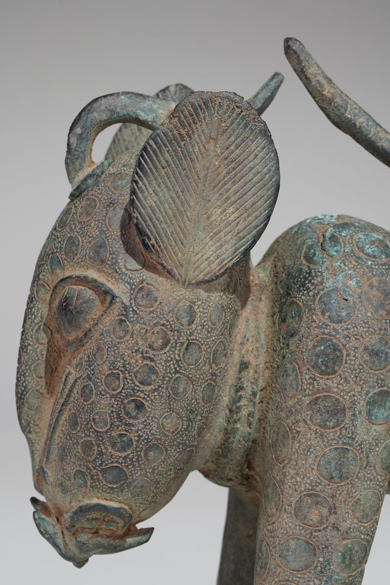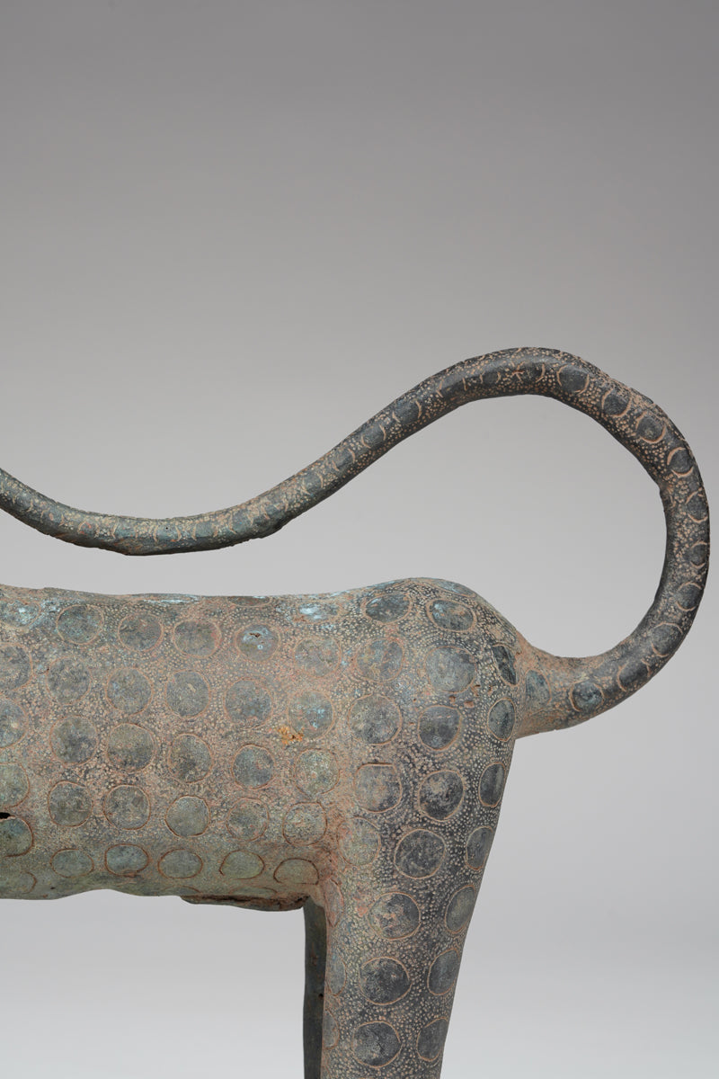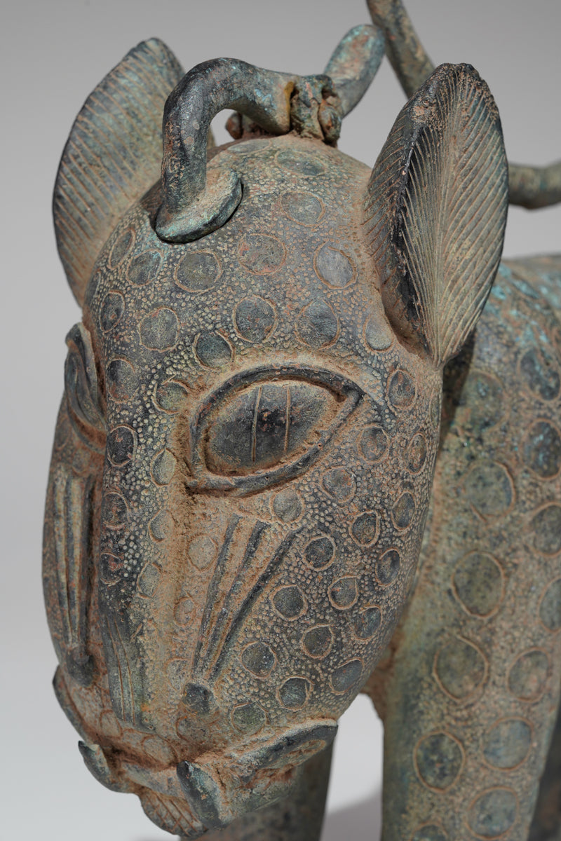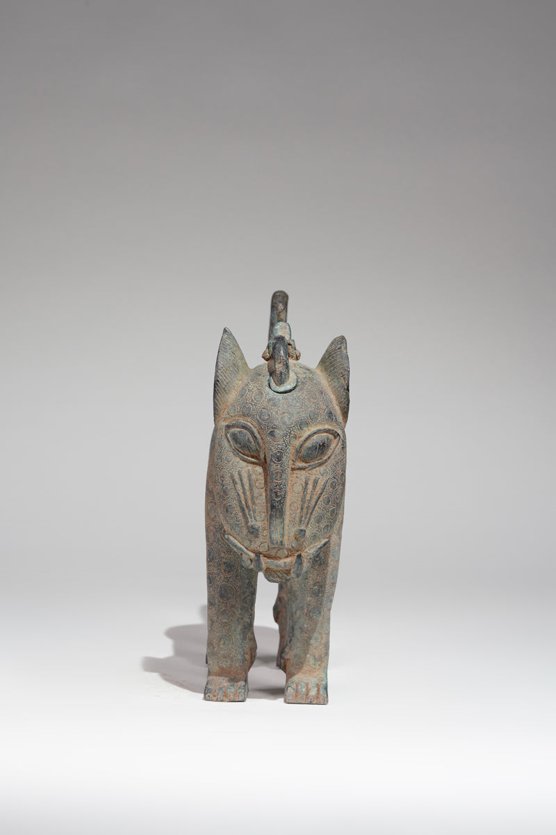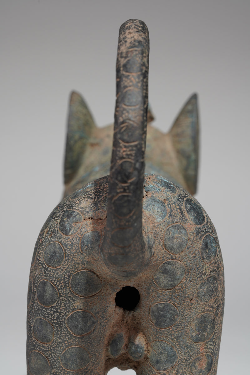 After dressing for Ugie Erha Oba, the ceremony that honors his paternal ancestors, the Oba washes his hands with water poured from an aquamanile in the form of a leopard, such as this one. It has a small, round, hinged opening at the top of the head through which is can be filled with water, which is then poured out through the pierced nostrils. The tail, arching over the back, serves as a handle."