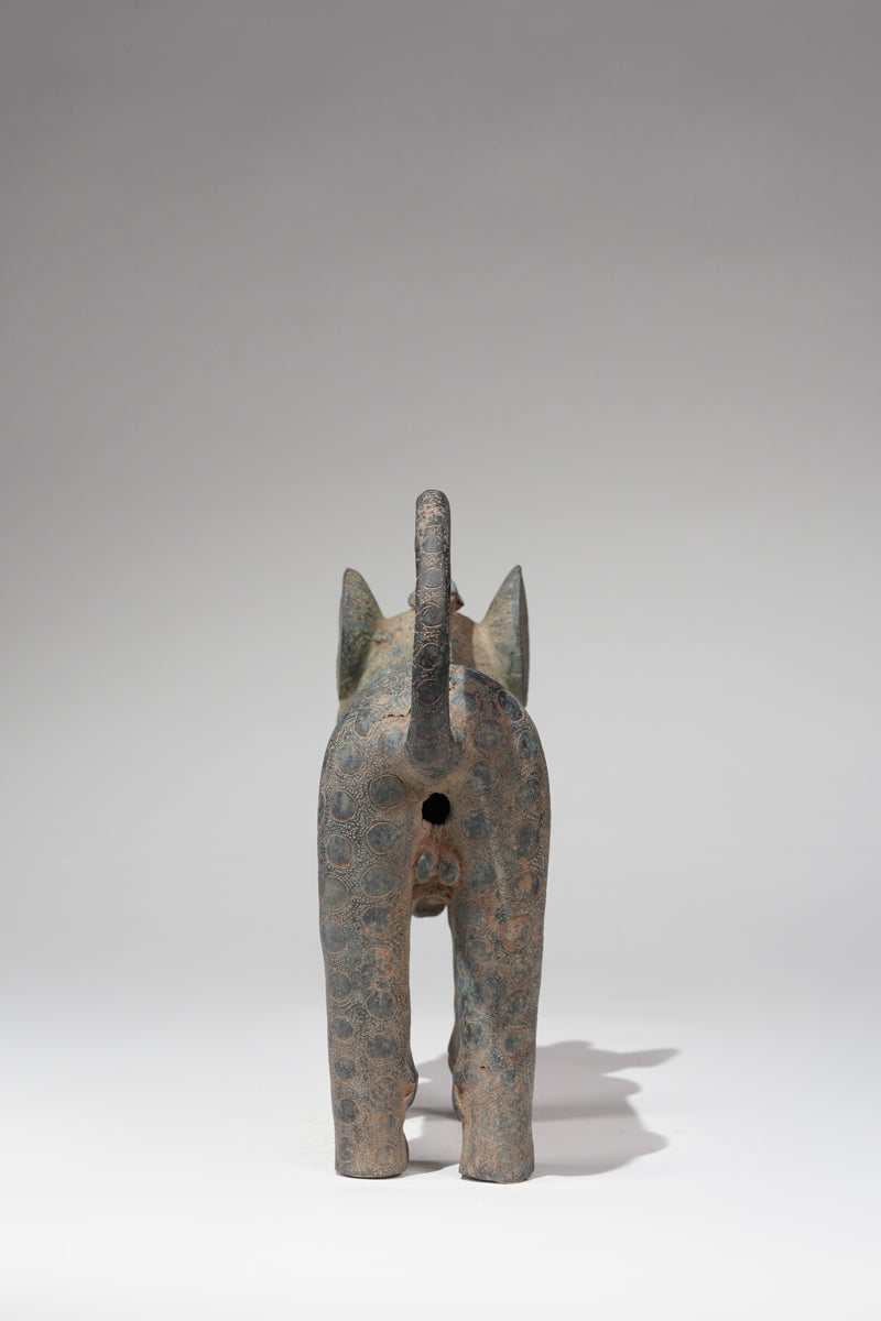 An opening at the top of the leopard’s head suggests a place for filling the vessel with water; however, no spout is present, and any liquid would immediately escape through the legs. This functional deficiency indicates that the piece was not intended for practical use as a water vessel.