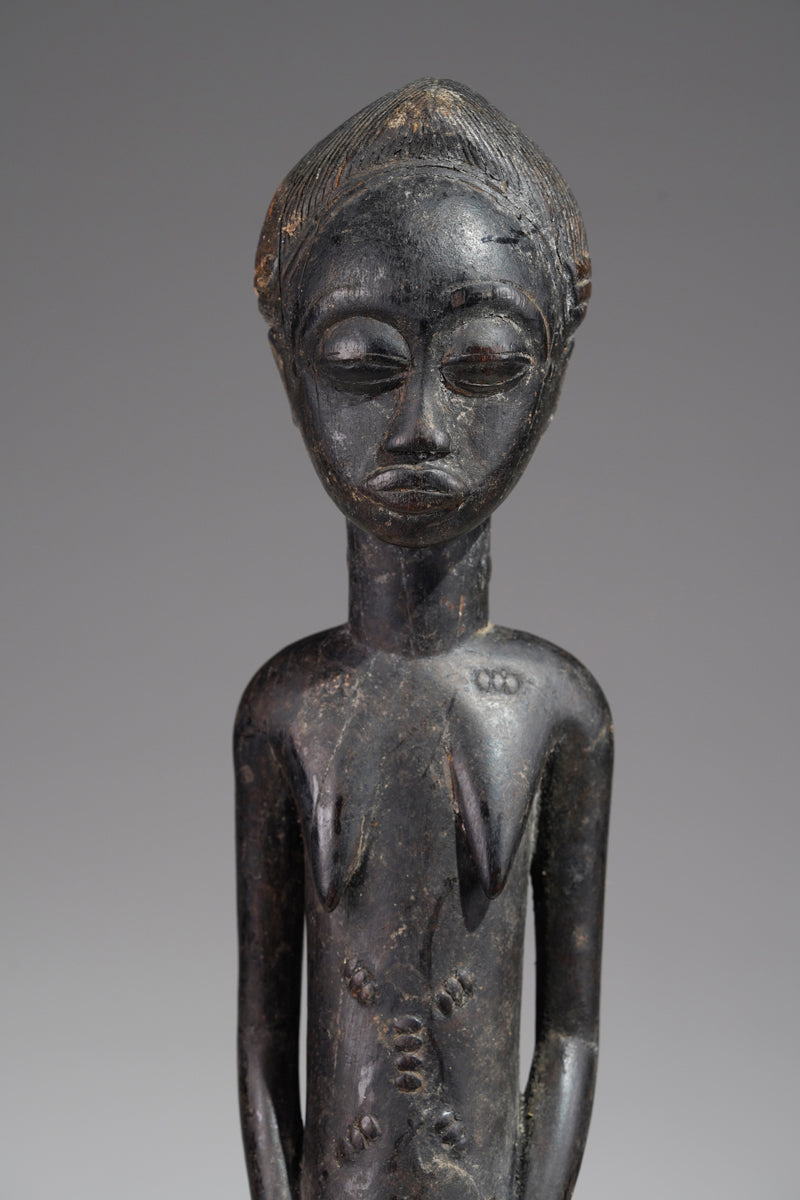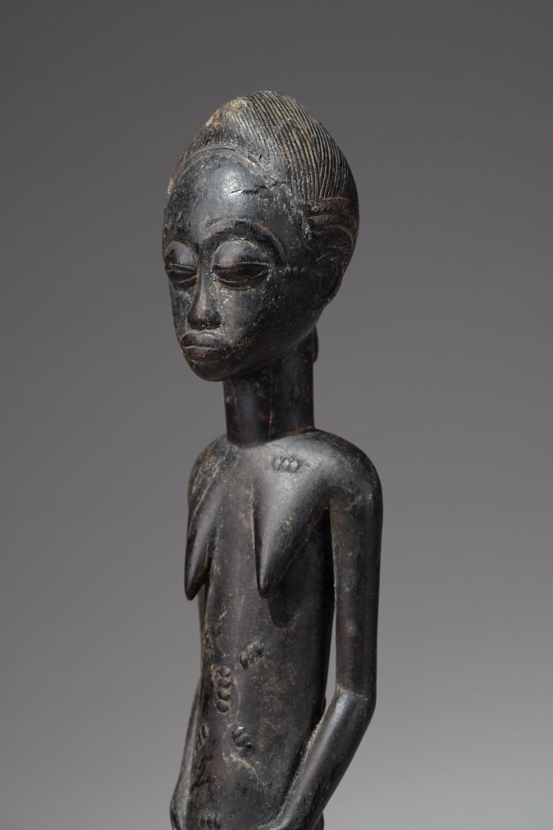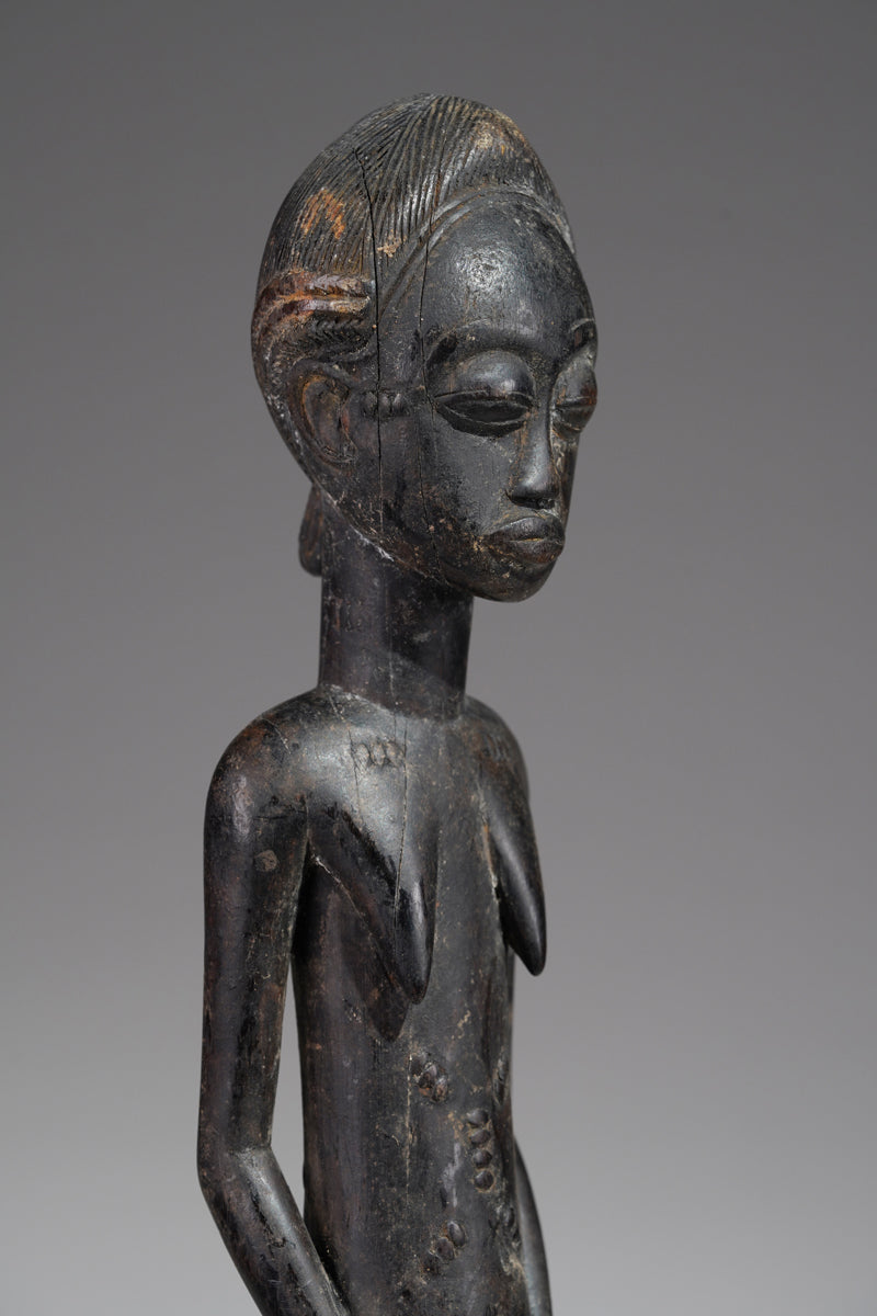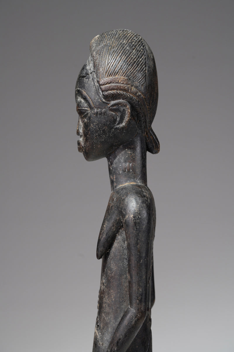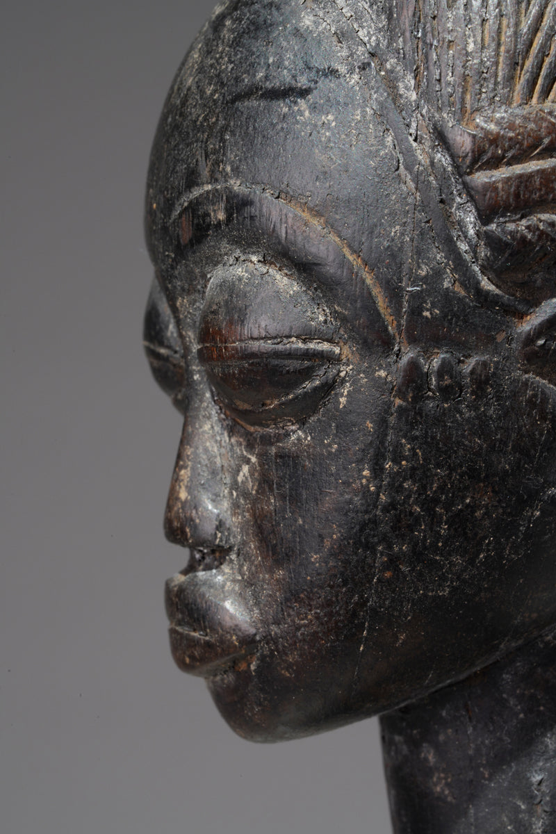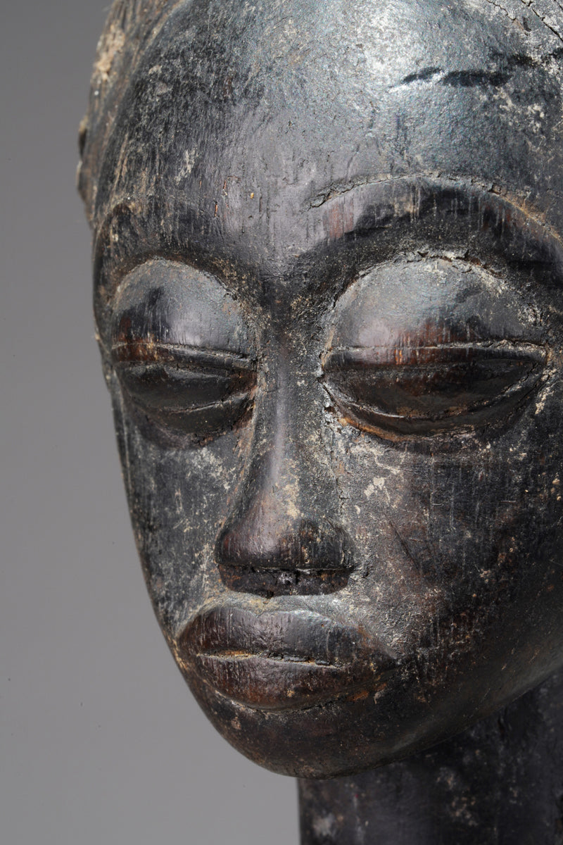 “To articulate historians, the most consistent features of Baule art is a kind of peaceful containment. Faces tend to have downcast eyes and figures most often hold their ams against the body. […] Among their abundant art forms, the Baule people continue to place the greatest value on masks and figure sculptures, which remain the only sculptural art still widely used in Baule villages. While there is a difference between the Baule view of their objects and that of Western connoisseurs, there are points of agreement. Aesthetic appreciation is one: Baule artist, and individual owners of objects, certainly sometimes enjoy the beauty of these objects and the skill it took coproduce them. […]