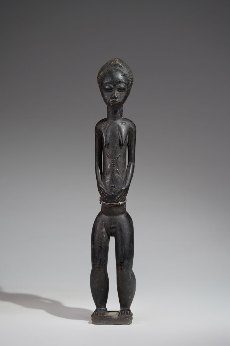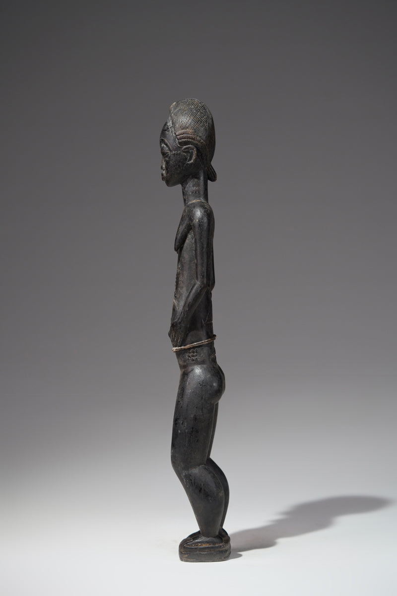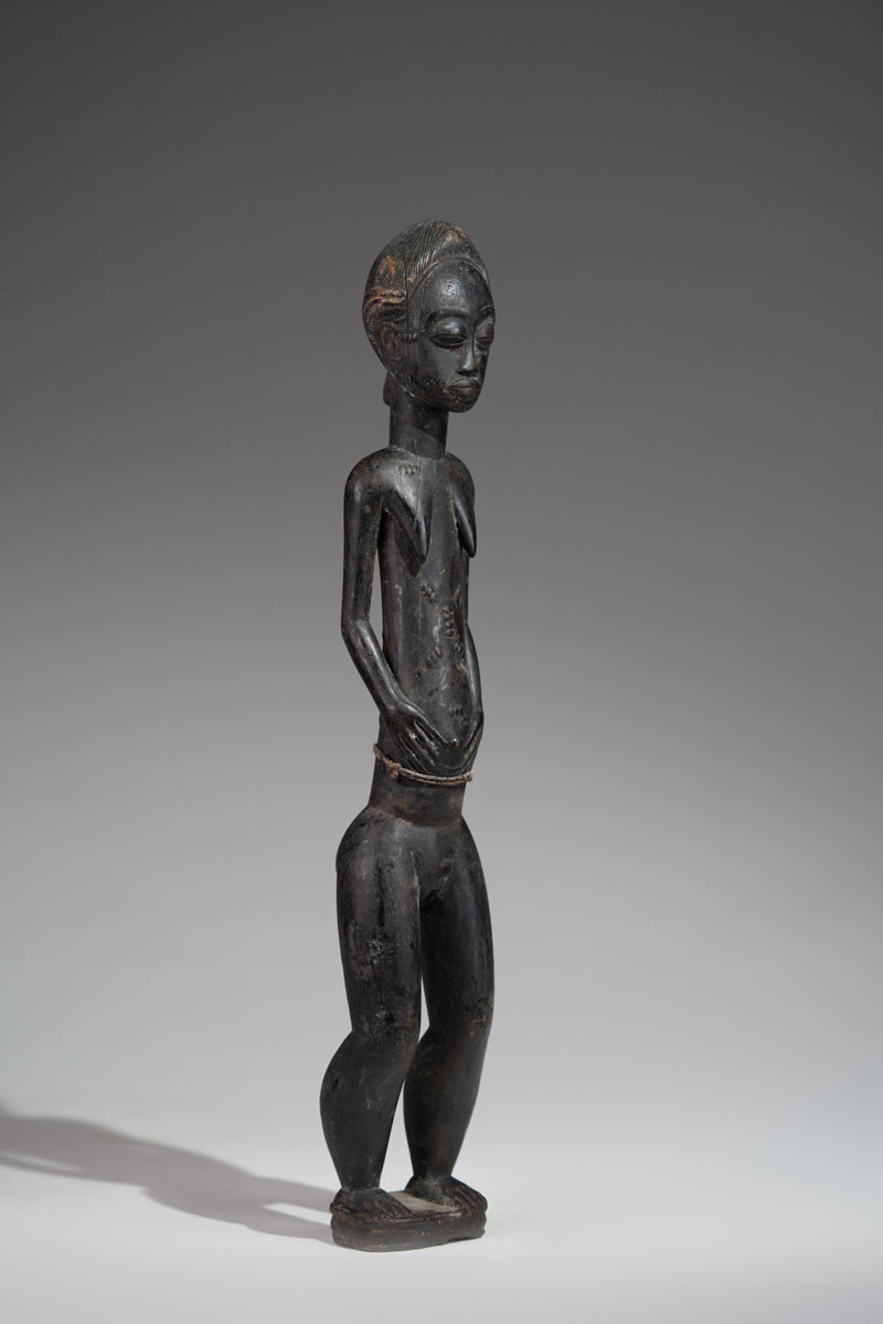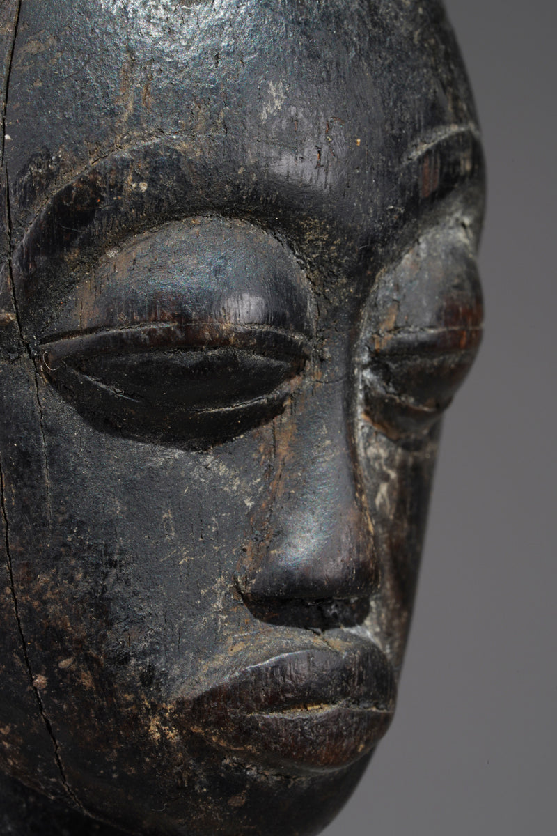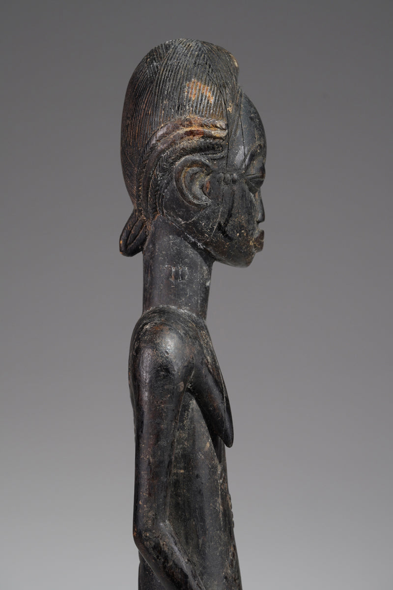 “To articulate historians, the most consistent features of Baule art is a kind of peaceful containment. Faces tend to have downcast eyes and figures most often hold their ams against the body. […] Among their abundant art forms, the Baule people continue to place the greatest value on masks and figure sculptures, which remain the only sculptural art still widely used in Baule villages. While there is a difference between the Baule view of their objects and that of Western connoisseurs, there are points of agreement. Aesthetic appreciation is one: Baule artist, and individual owners of objects, certainly sometimes enjoy the beauty of these objects and the skill it took coproduce them. […]