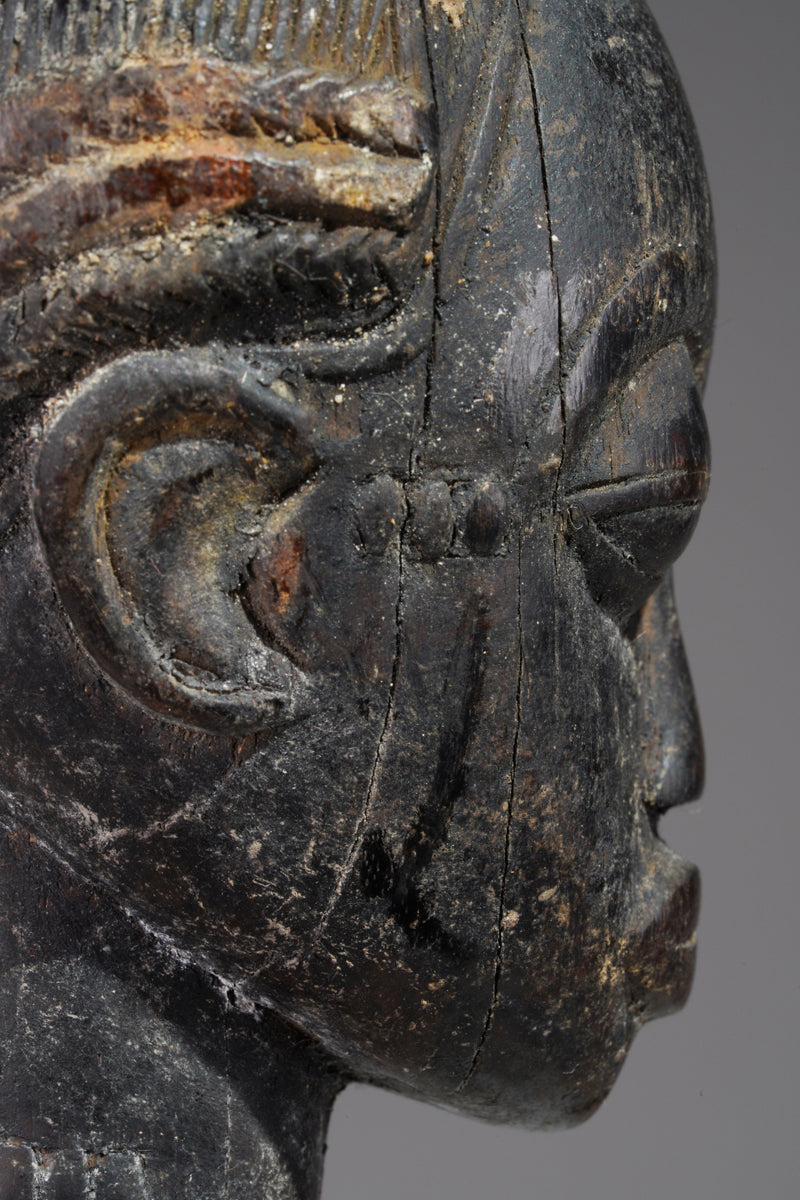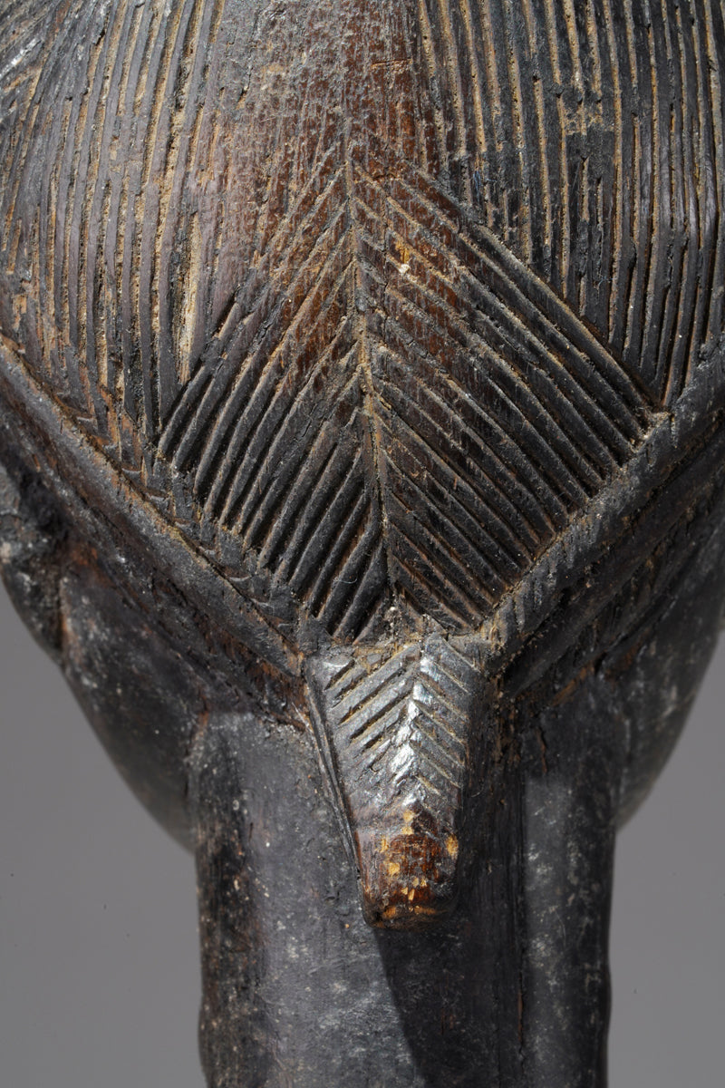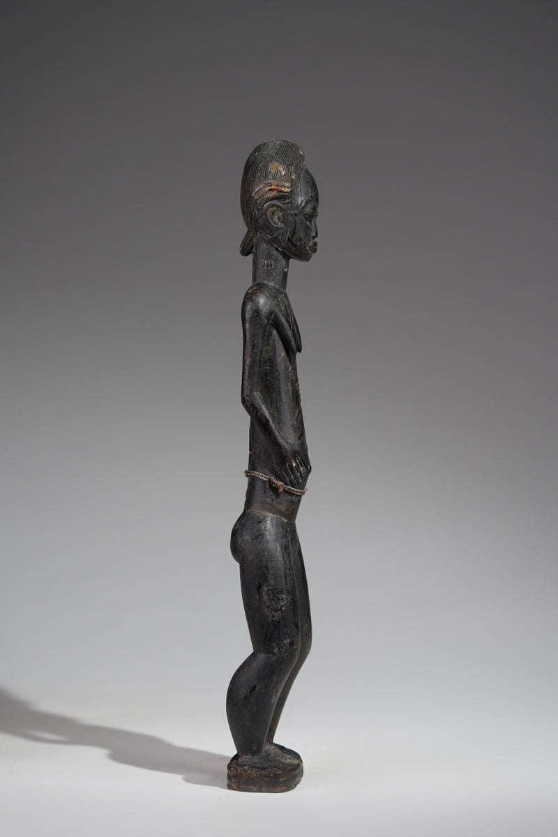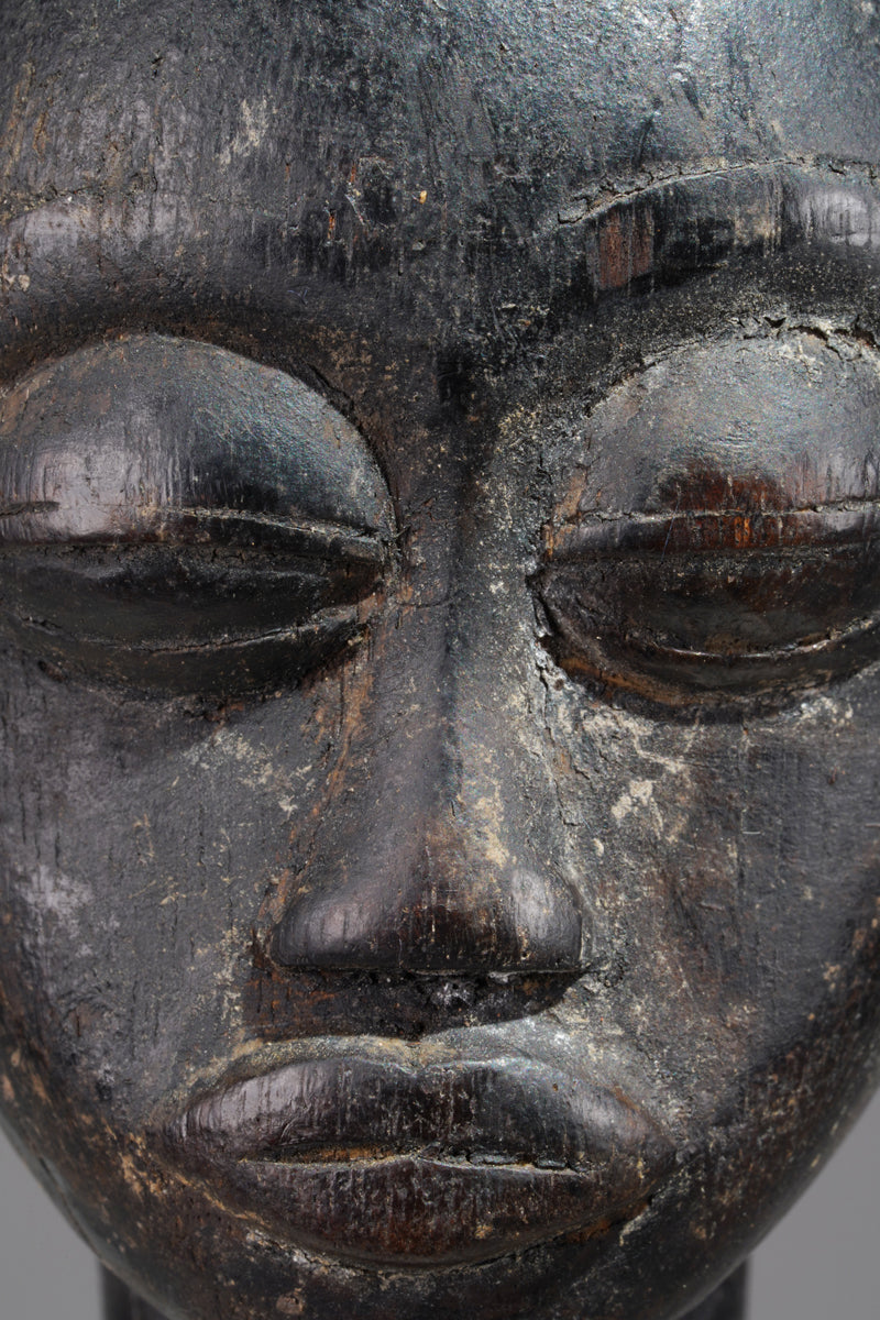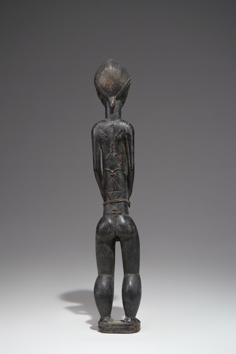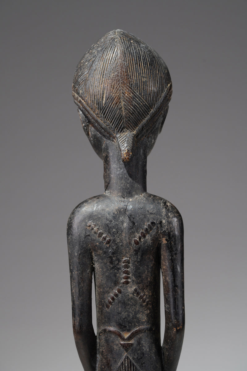 “To articulate historians, the most consistent features of Baule art is a kind of peaceful containment. Faces tend to have downcast eyes and figures most often hold their ams against the body. […] Among their abundant art forms, the Baule people continue to place the greatest value on masks and figure sculptures, which remain the only sculptural art still widely used in Baule villages. While there is a difference between the Baule view of their objects and that of Western connoisseurs, there are points of agreement. Aesthetic appreciation is one: Baule artist, and individual owners of objects, certainly sometimes enjoy the beauty of these objects and the skill it took coproduce them. […]