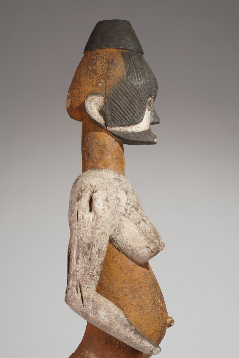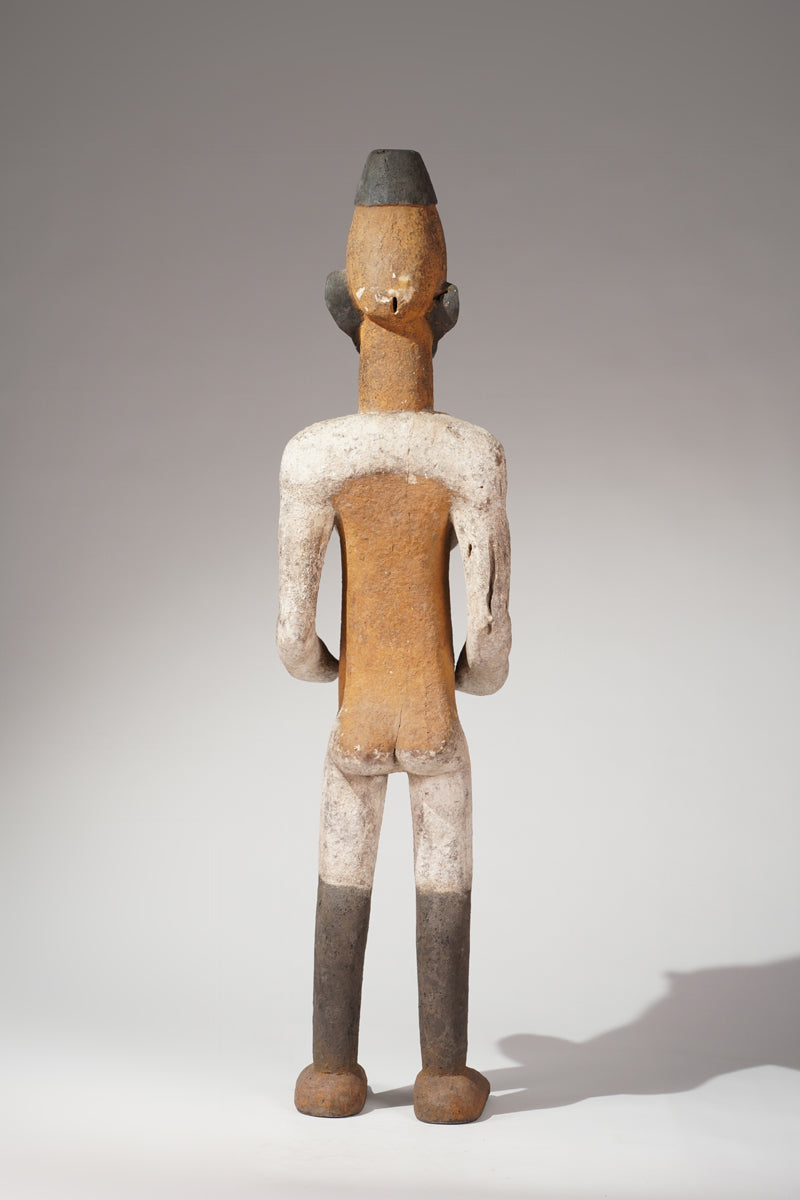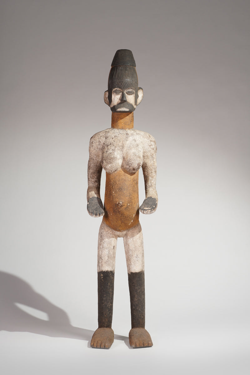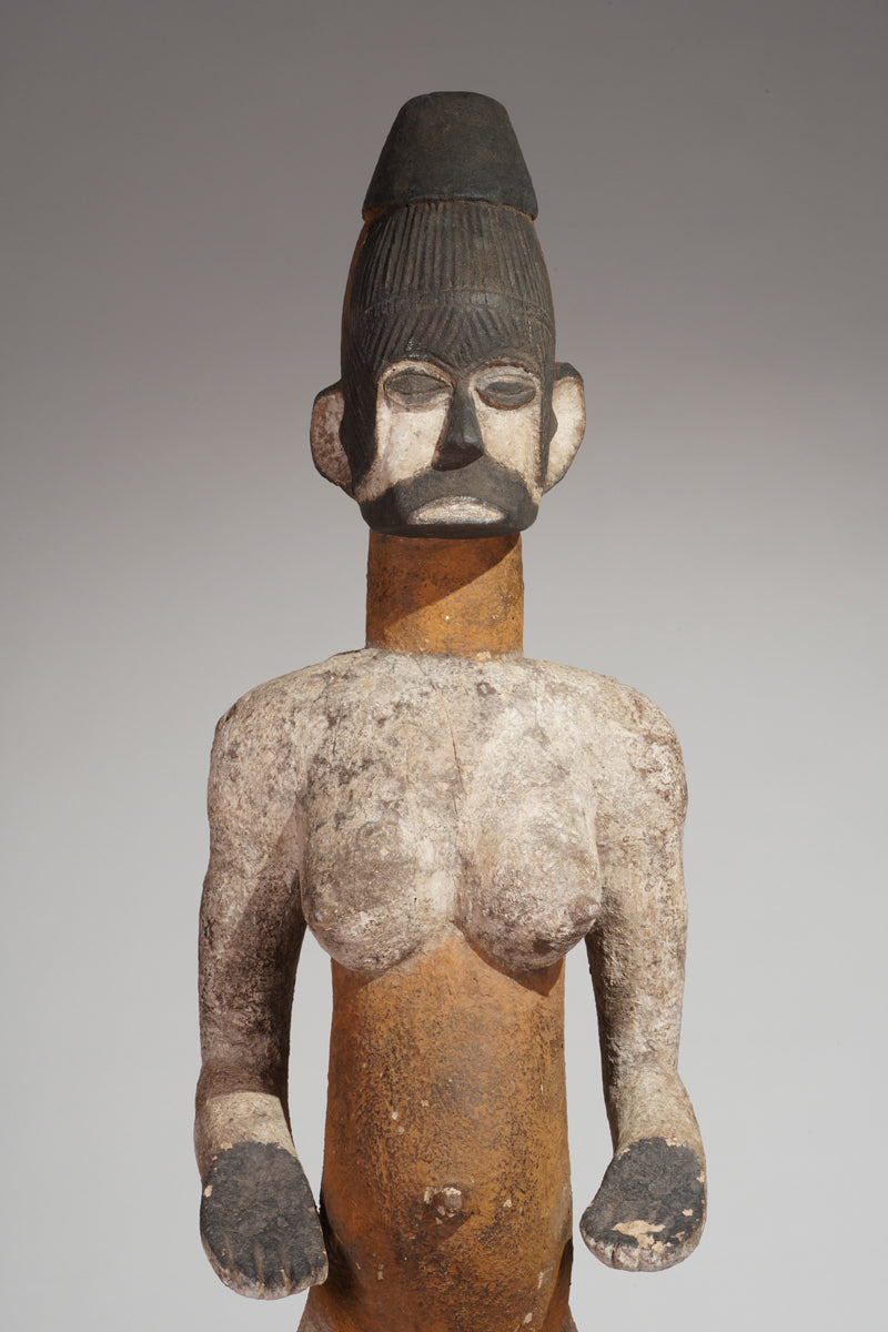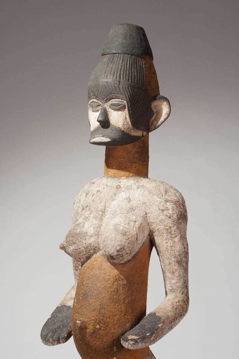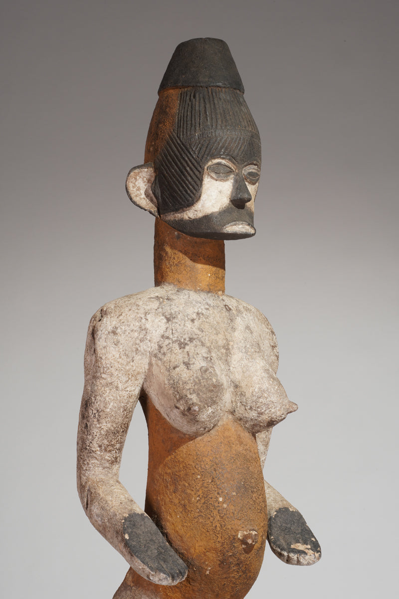 "These imposing figures, from eastern Nigeria, are at the heart of Igbo belief systems, associated with tributary deities known as Alusi. Kept in shrines as a group sometimes as large as twelve, the figures were thought of as family members of the Alusi ... A priest was responsible for their care as they interceded in cases of infertility and other social disorders. While the face and torso show a high level of detailed carving, the hands and feet are defined in a schematic manner as is customary in Alusi figures from the Onitsha region. Especially characteristic are the upturned hands, as a sign of openhandedness and generosity of the deities, as well as willingness to receive offerings." Source: The Met Museum, NY