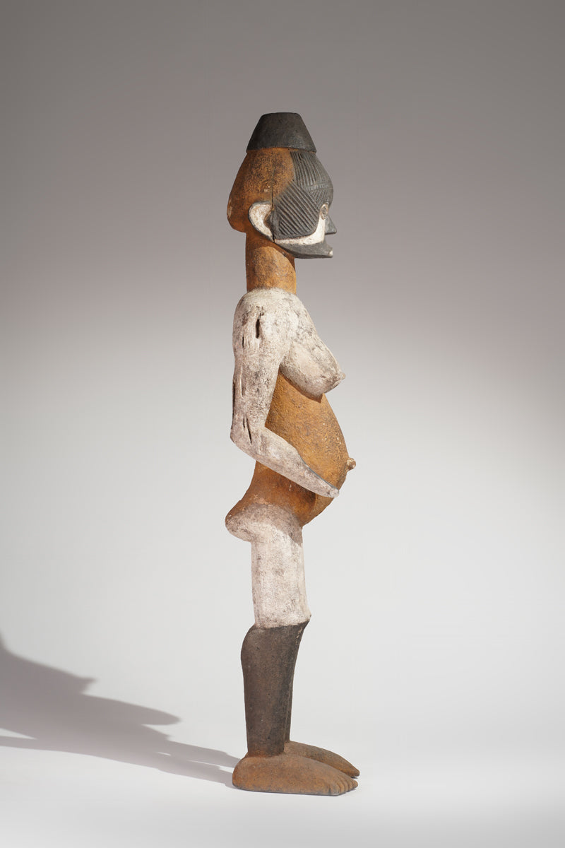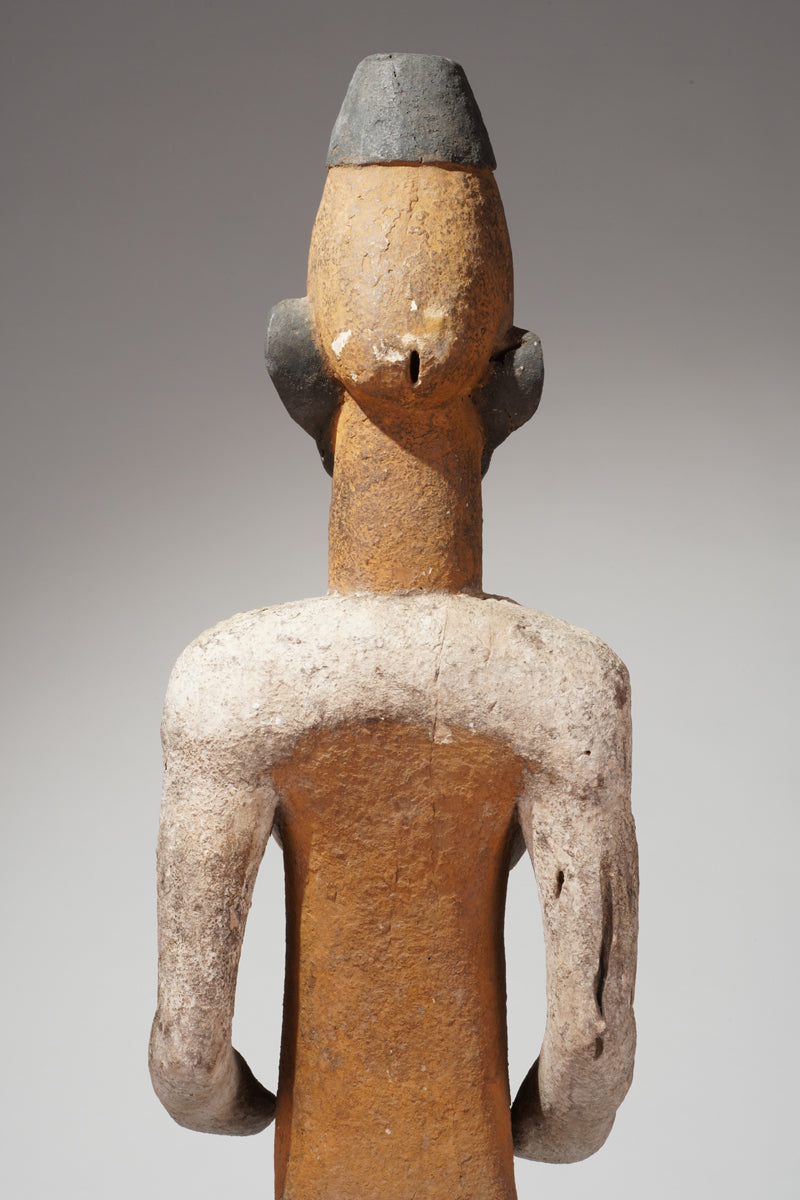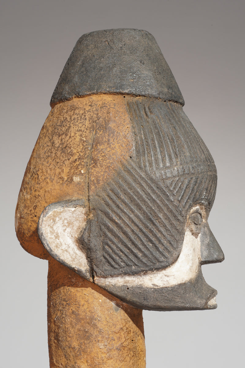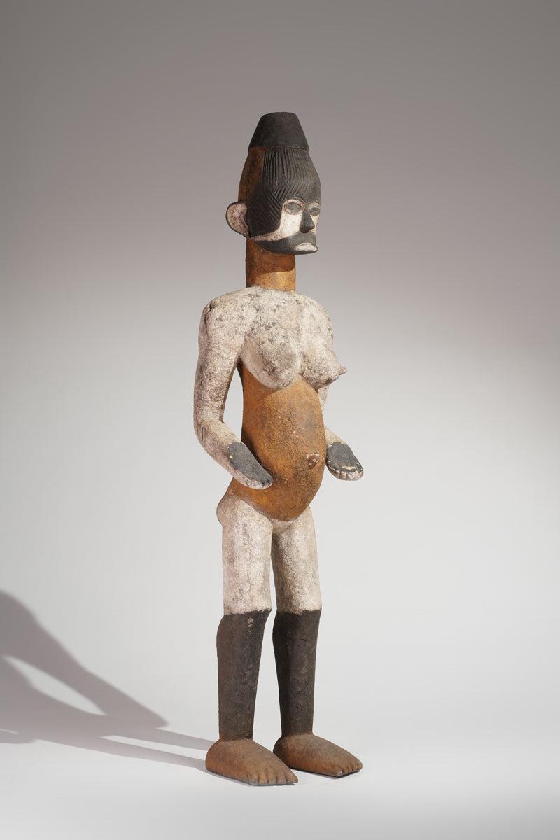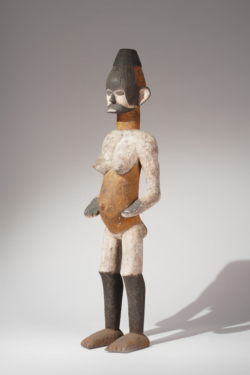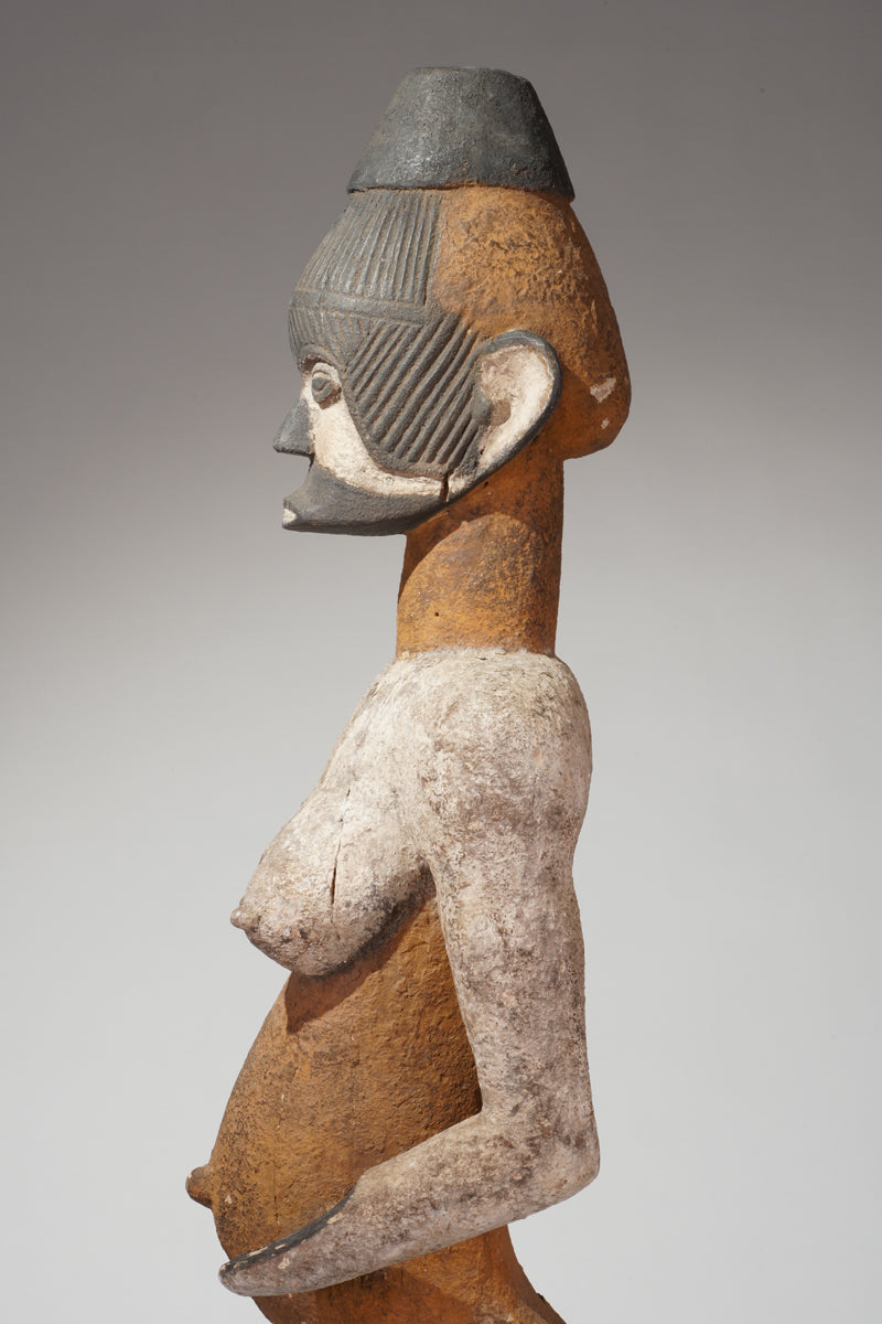 "These imposing figures, from eastern Nigeria, are at the heart of Igbo belief systems, associated with tributary deities known as Alusi. Kept in shrines as a group sometimes as large as twelve, the figures were thought of as family members of the Alusi ... A priest was responsible for their care as they interceded in cases of infertility and other social disorders. While the face and torso show a high level of detailed carving, the hands and feet are defined in a schematic manner as is customary in Alusi figures from the Onitsha region. Especially characteristic are the upturned hands, as a sign of openhandedness and generosity of the deities, as well as willingness to receive offerings." Source: The Met Museum, NY