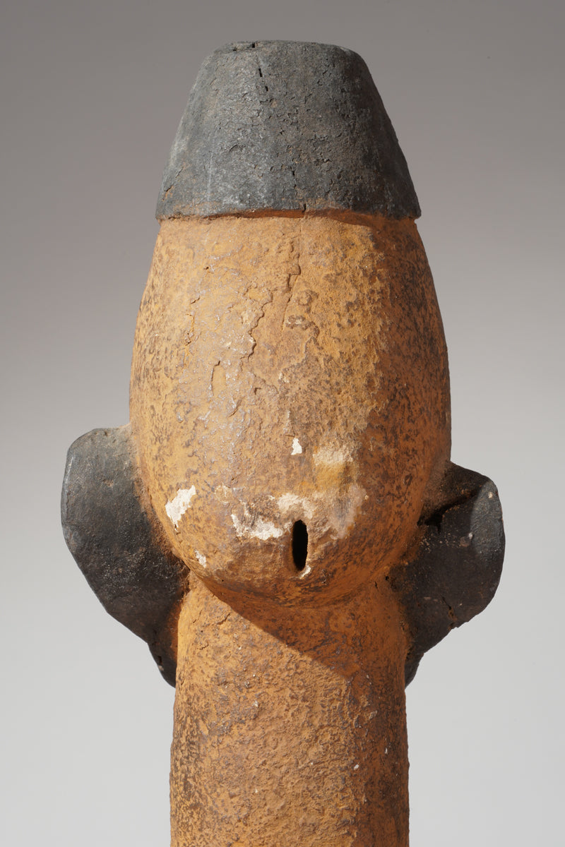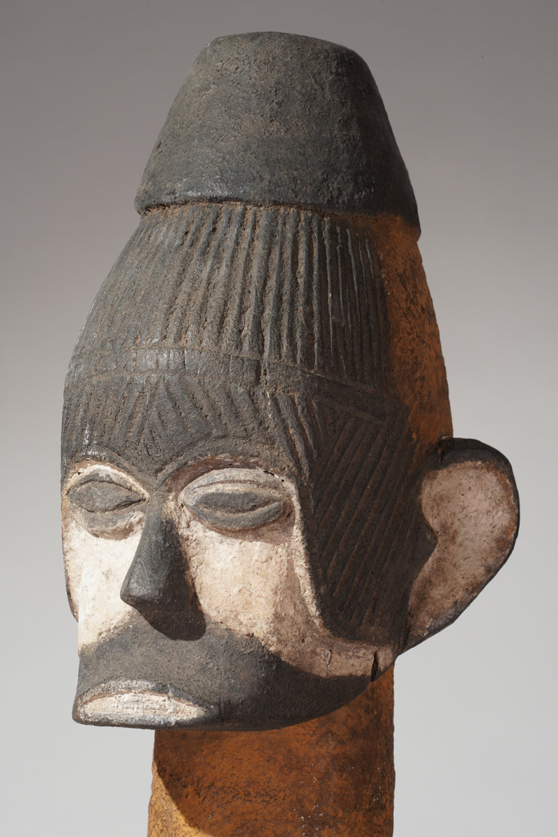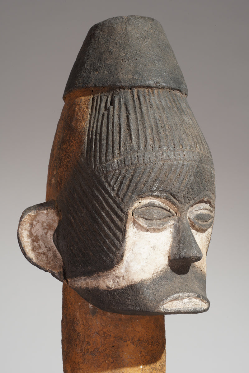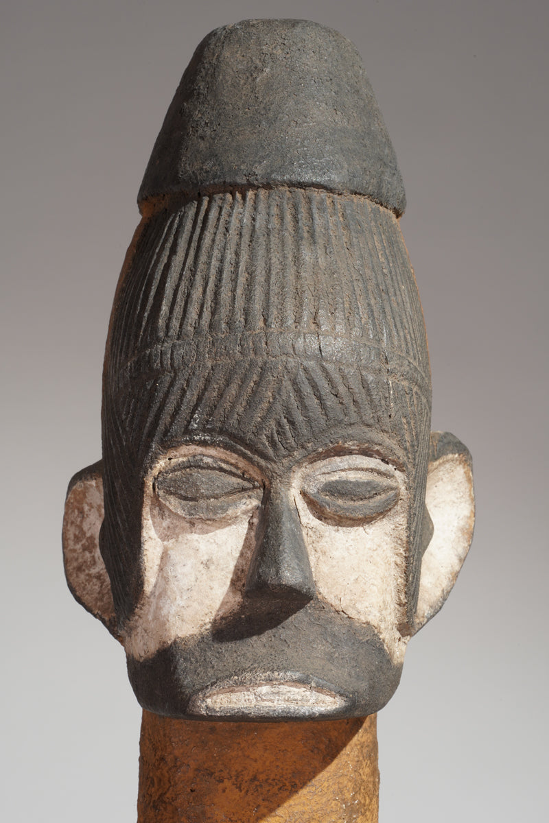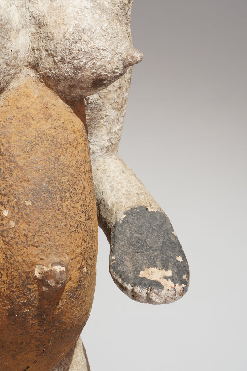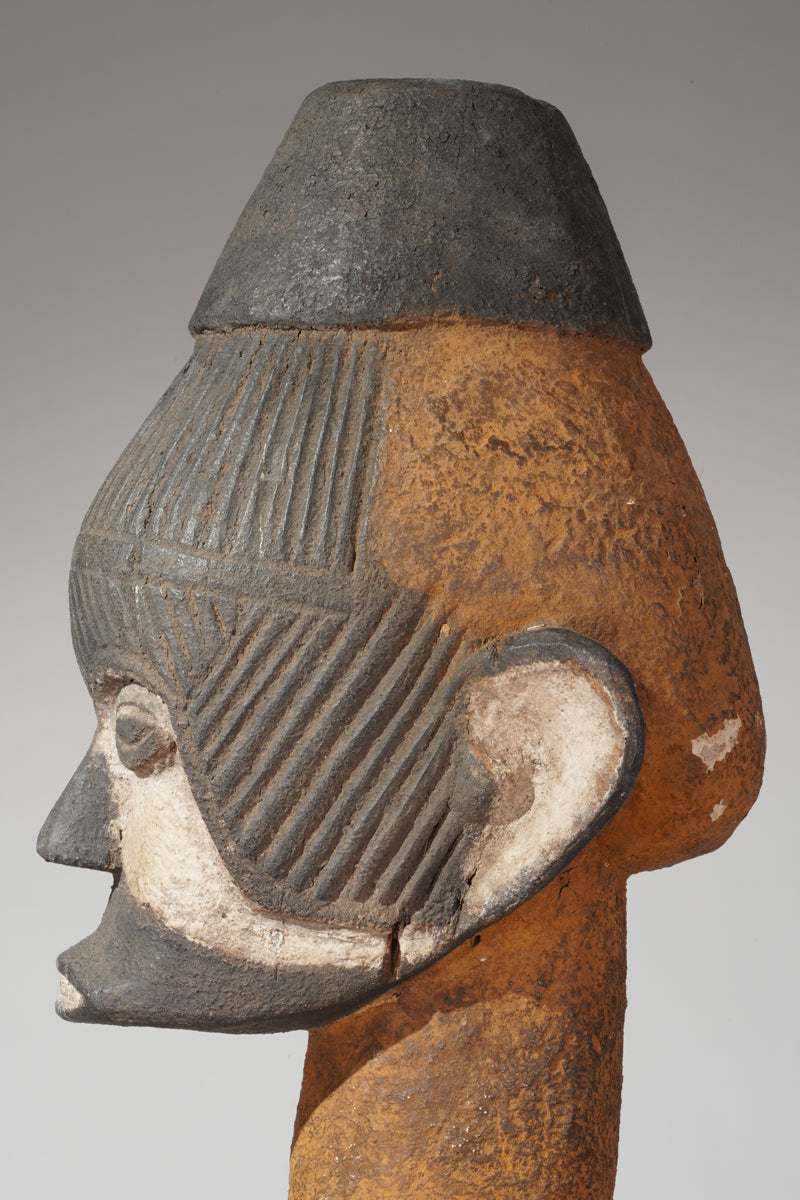 "These imposing figures, from eastern Nigeria, are at the heart of Igbo belief systems, associated with tributary deities known as Alusi. Kept in shrines as a group sometimes as large as twelve, the figures were thought of as family members of the Alusi ... A priest was responsible for their care as they interceded in cases of infertility and other social disorders. While the face and torso show a high level of detailed carving, the hands and feet are defined in a schematic manner as is customary in Alusi figures from the Onitsha region. Especially characteristic are the upturned hands, as a sign of openhandedness and generosity of the deities, as well as willingness to receive offerings." Source: The Met Museum, NY
