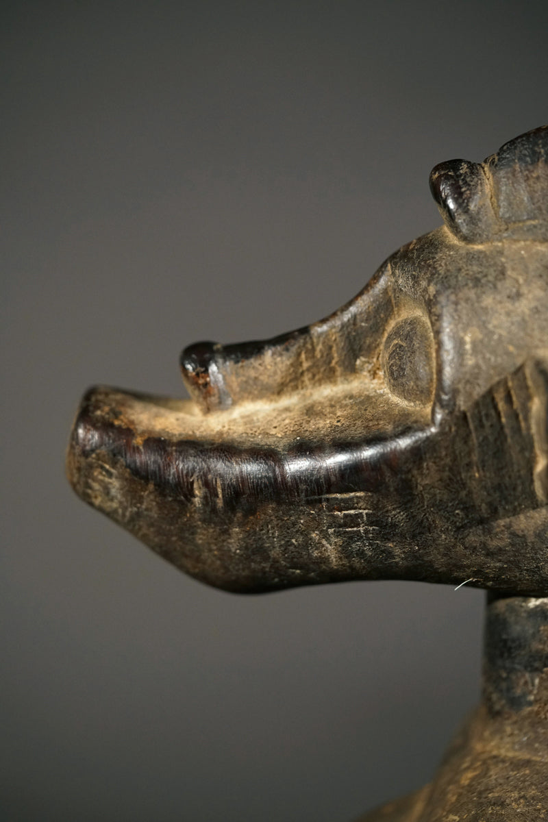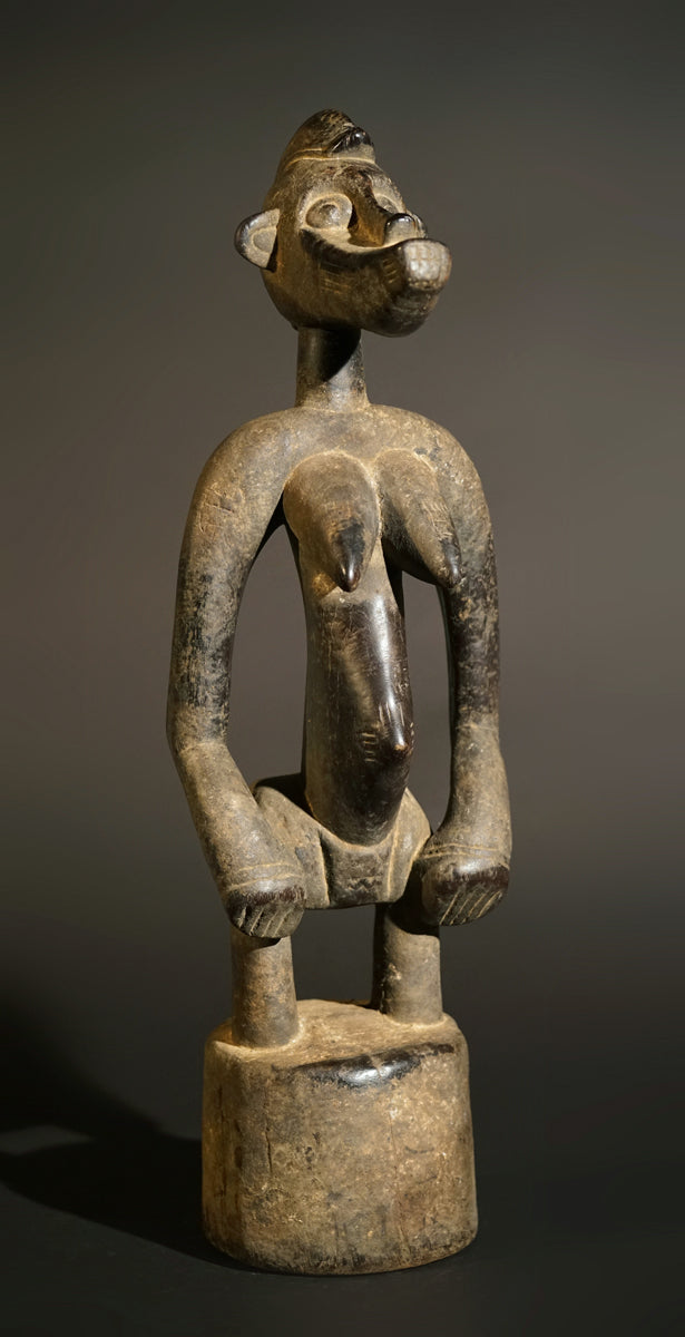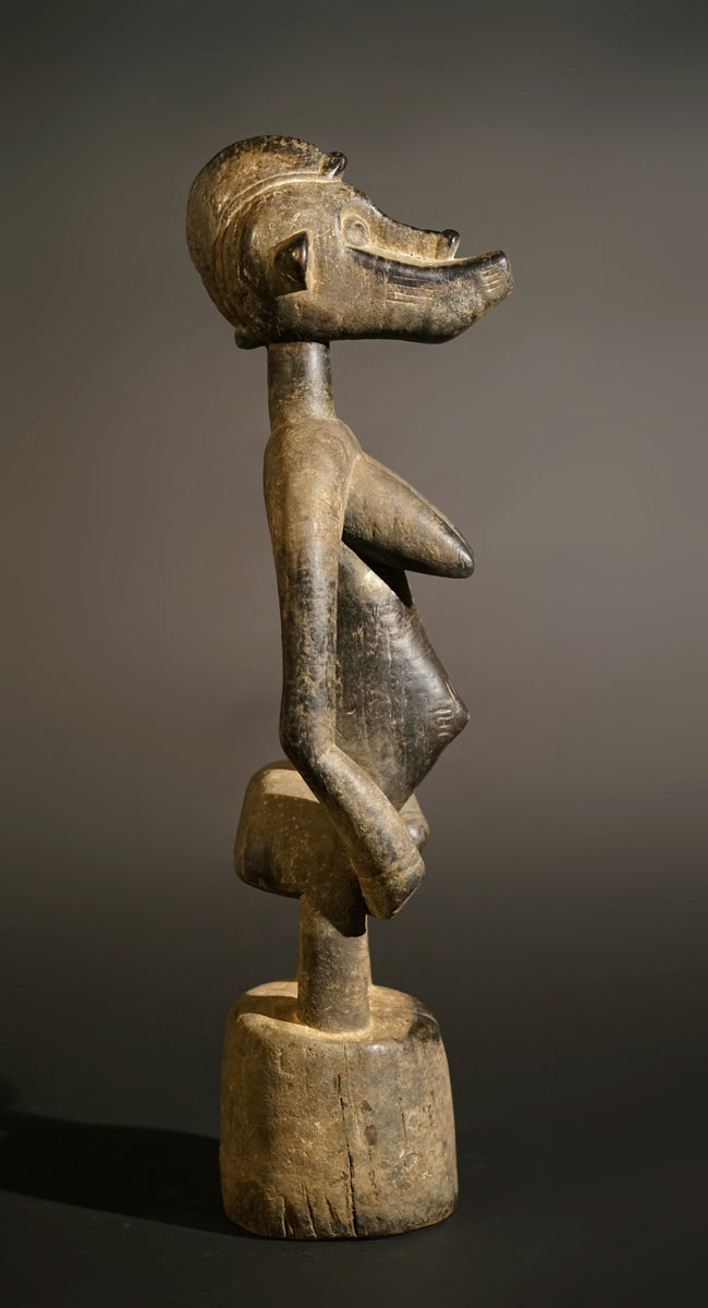 A female Senufo Rhytmpounder, called Deblé, of the border district of Ivory Coast and Burkina Faso, extremely heavy hardwood, a sacrfification patina on most parts of the sculpture, the rest showing a blackened, shiny surface.