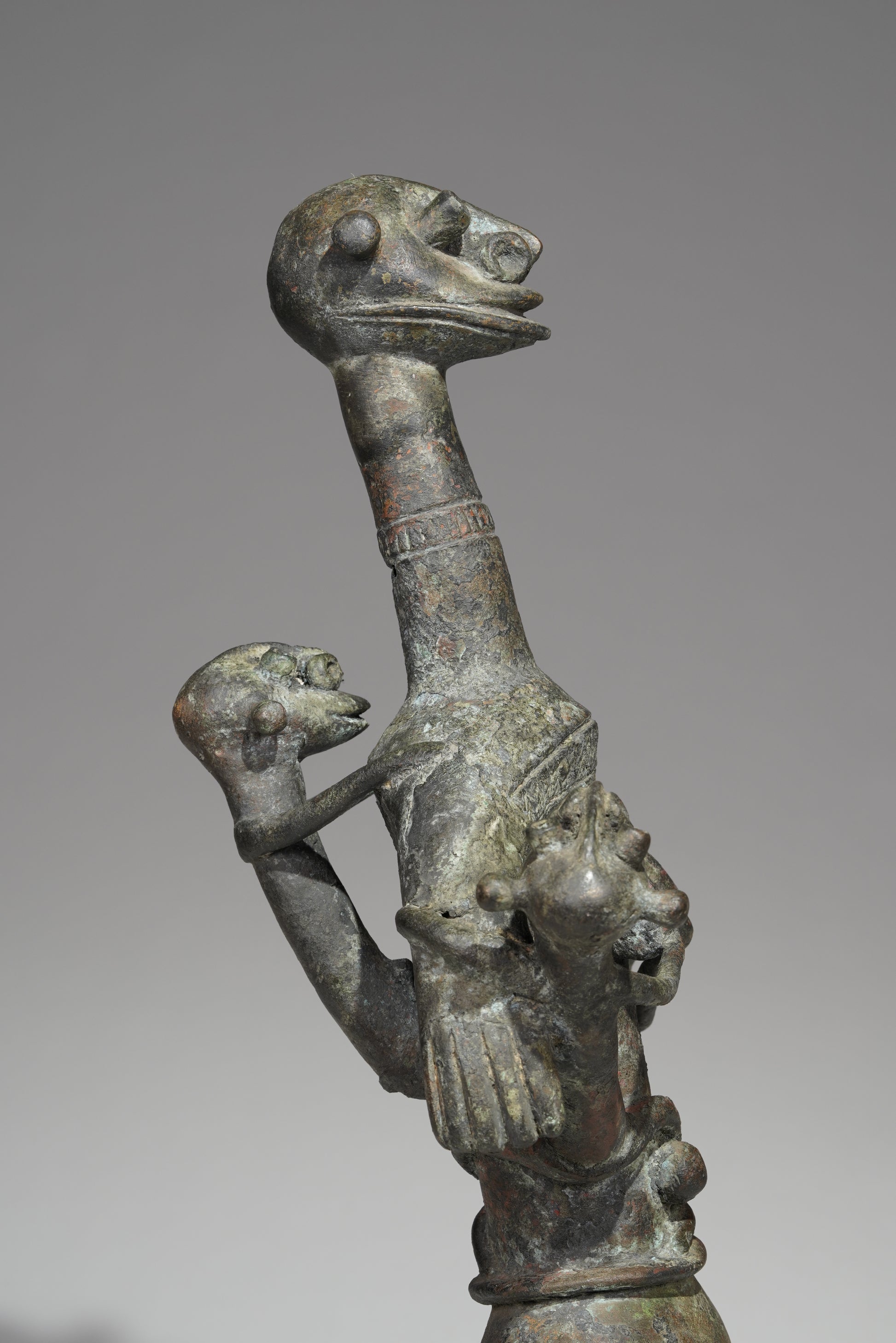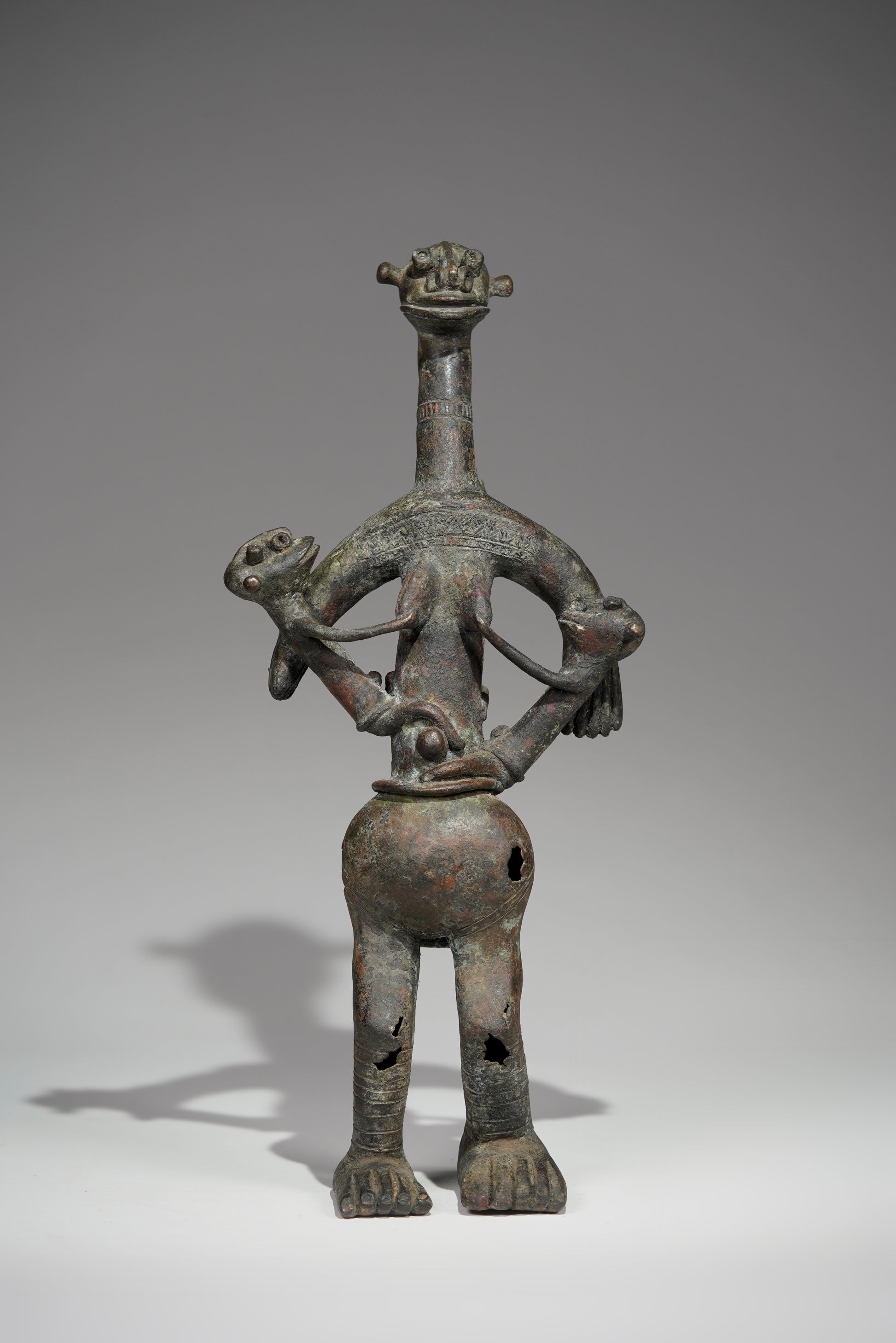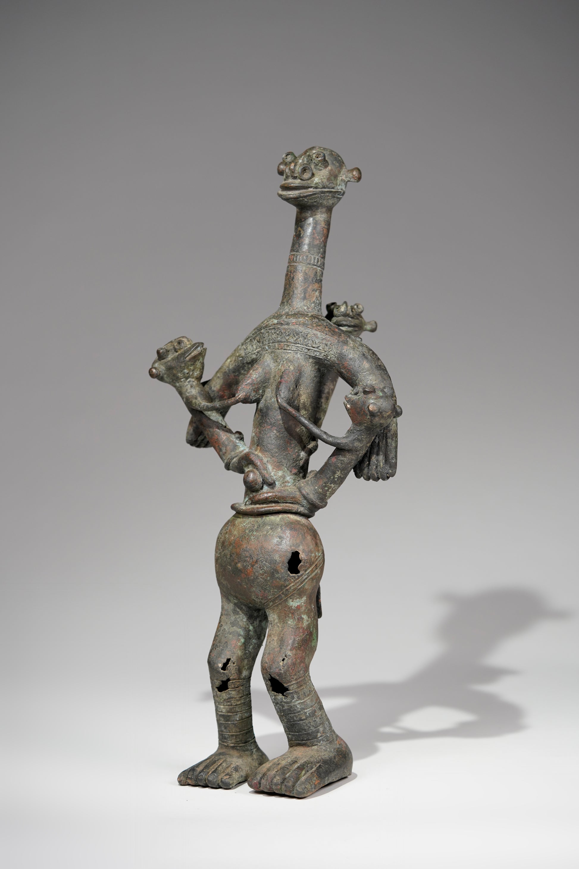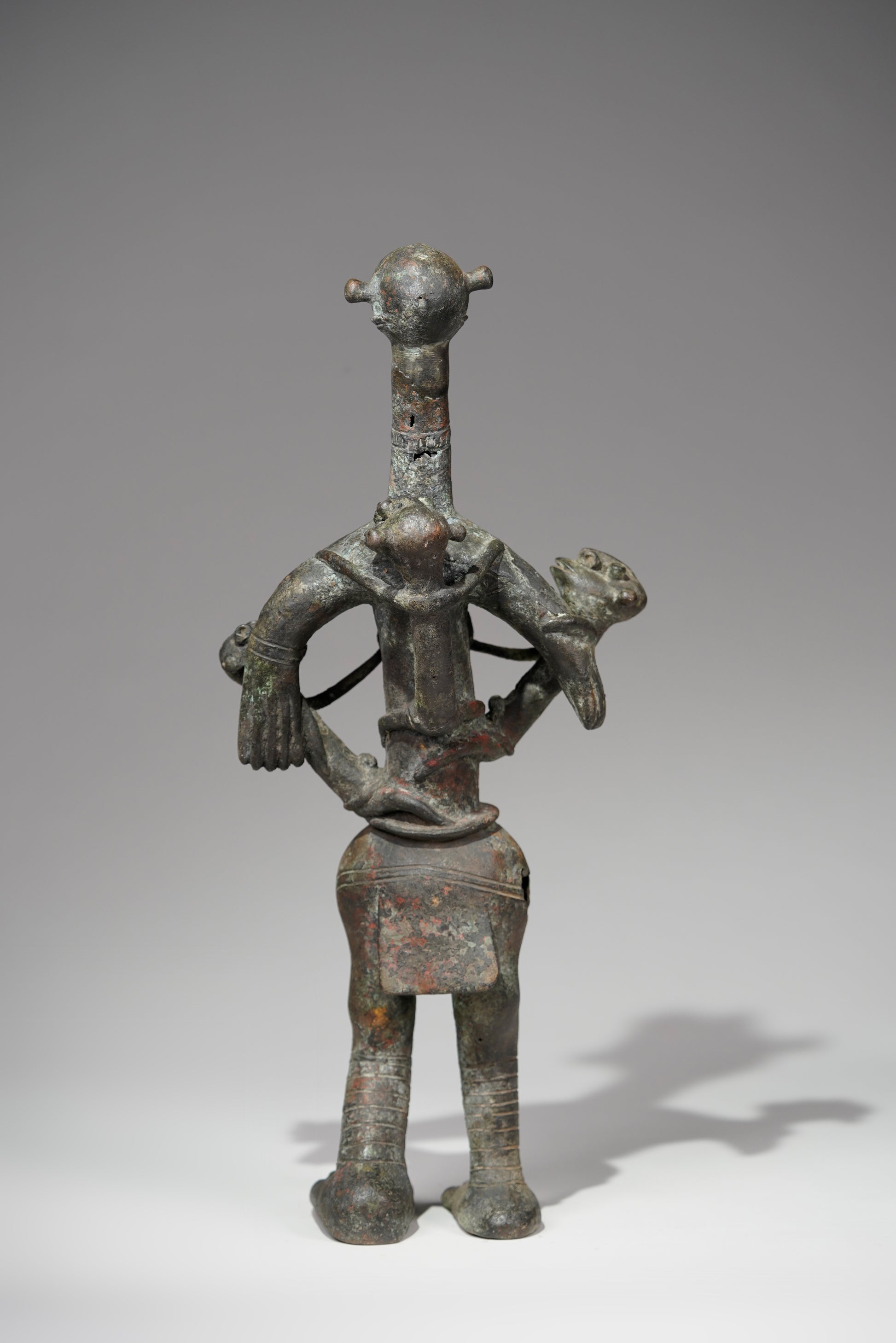 A female Tikar bronze sculpture, east Cameroun, standing on her two large feet, knees slightly bent, large rounded hips, and a thin elongated torso with a protruding navel, she holds the head of two children that grasp her breasts and are sitting on both sides of her hips, the third child is hitting on her back grasping her shoulders. Her arms are thick compared to theirs which are very thin, her cylindric neck is long and holds a small rounded head at its extremity, which has interesting features, a large mouth, flared nose and bulbous eyes, the children have the same features; hols in the knees, hips and neck, signs of use.