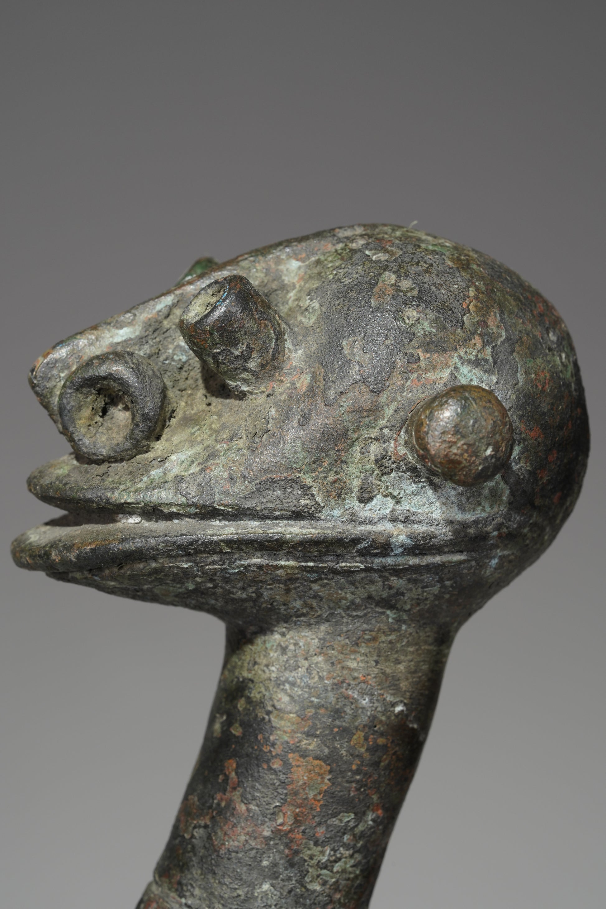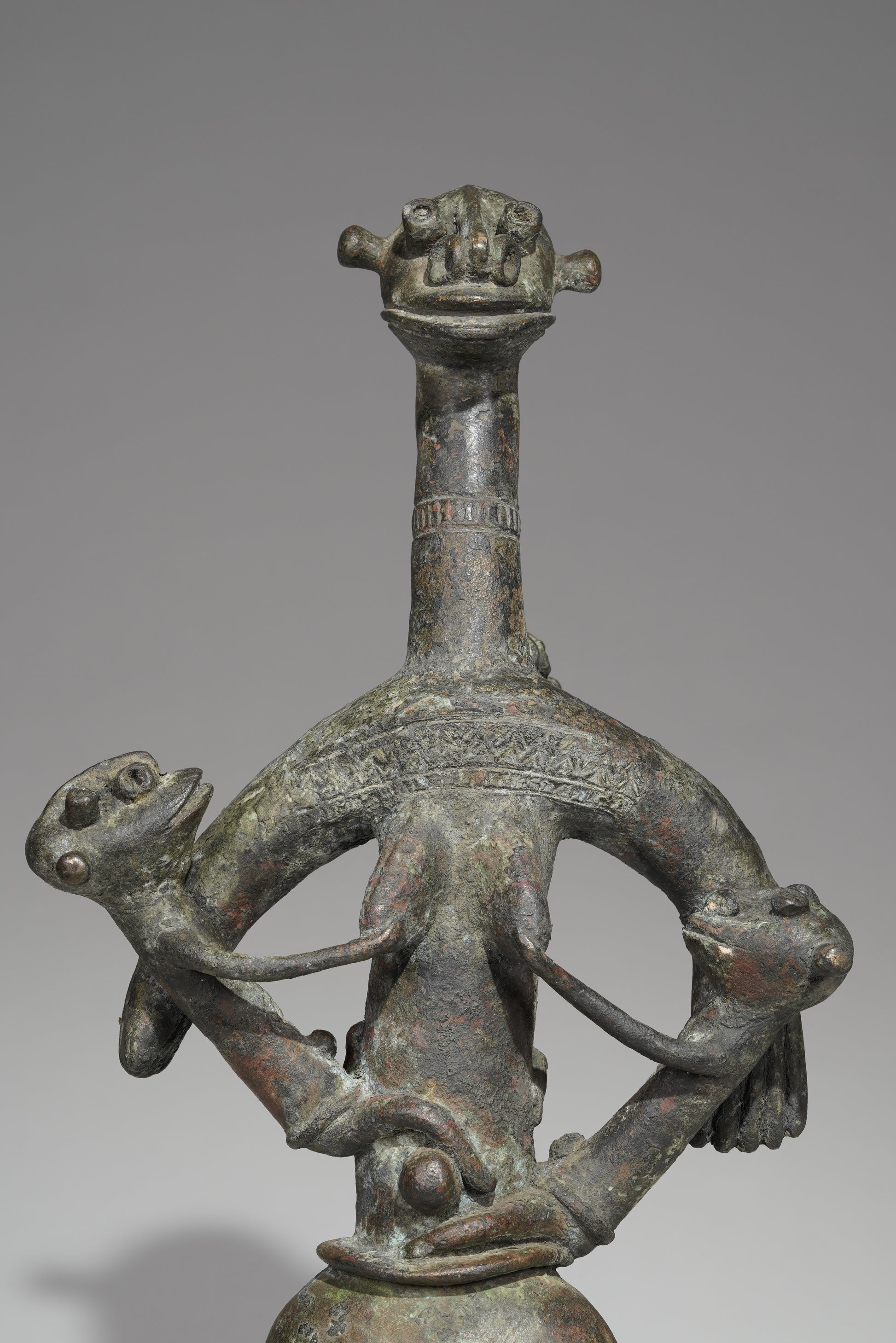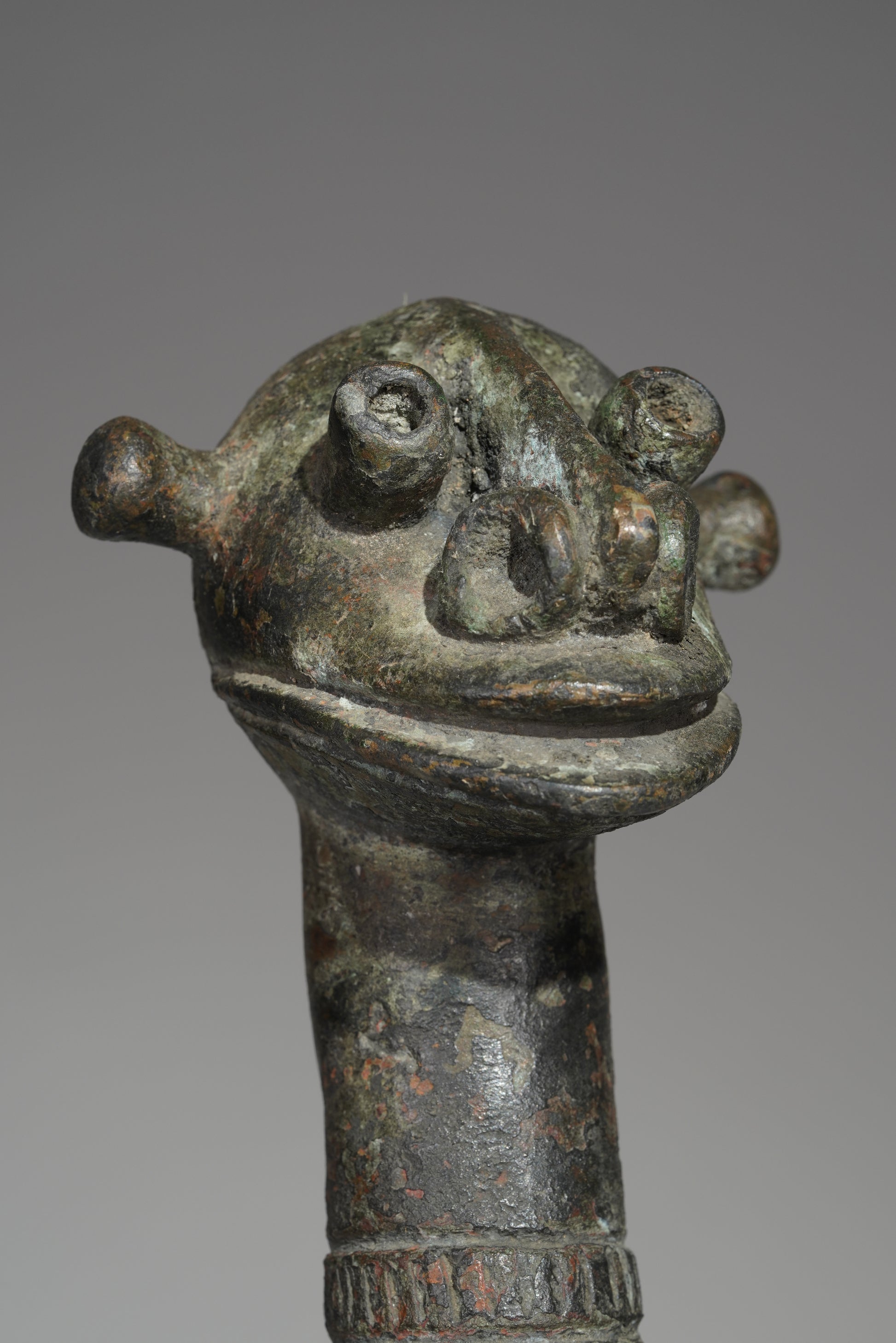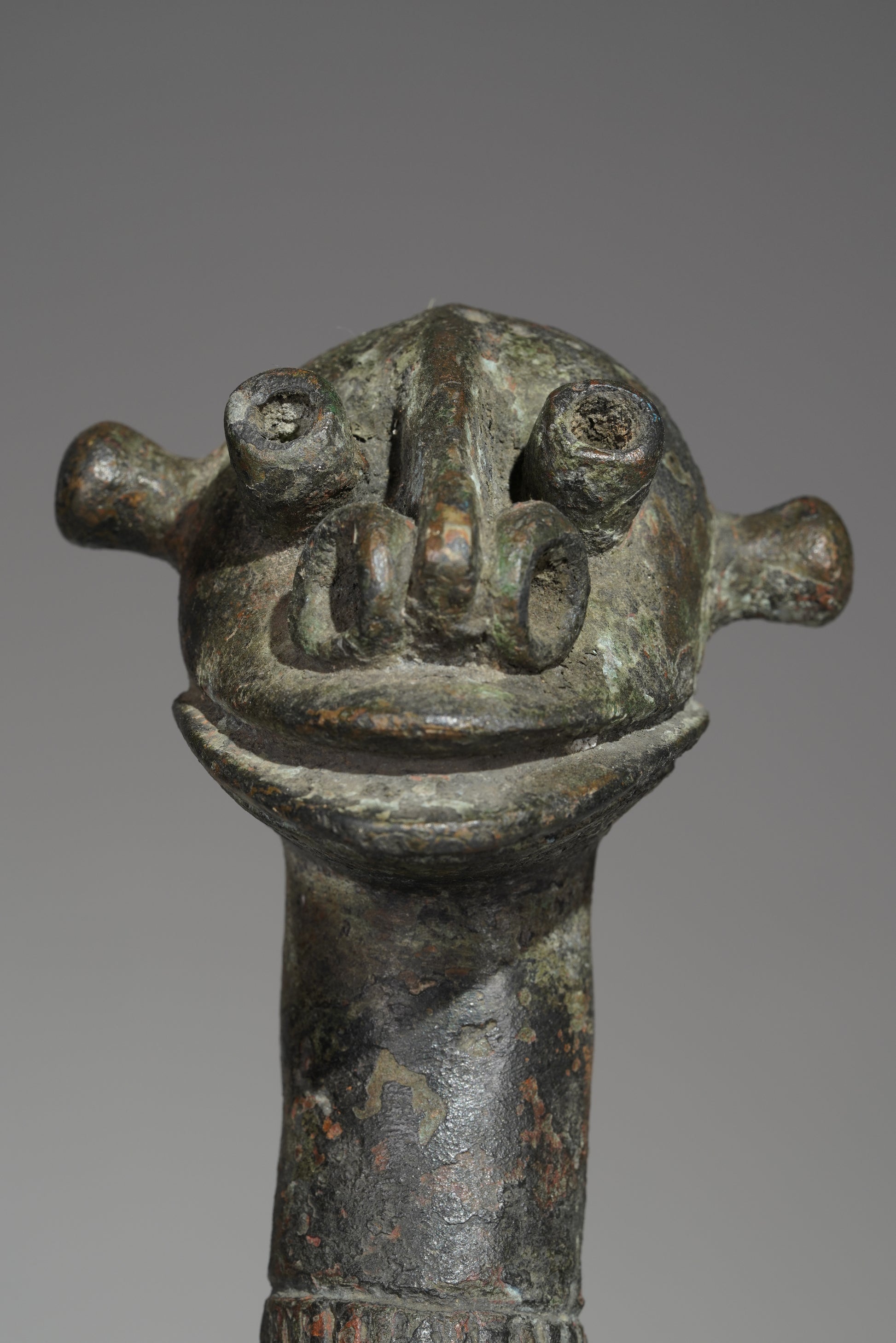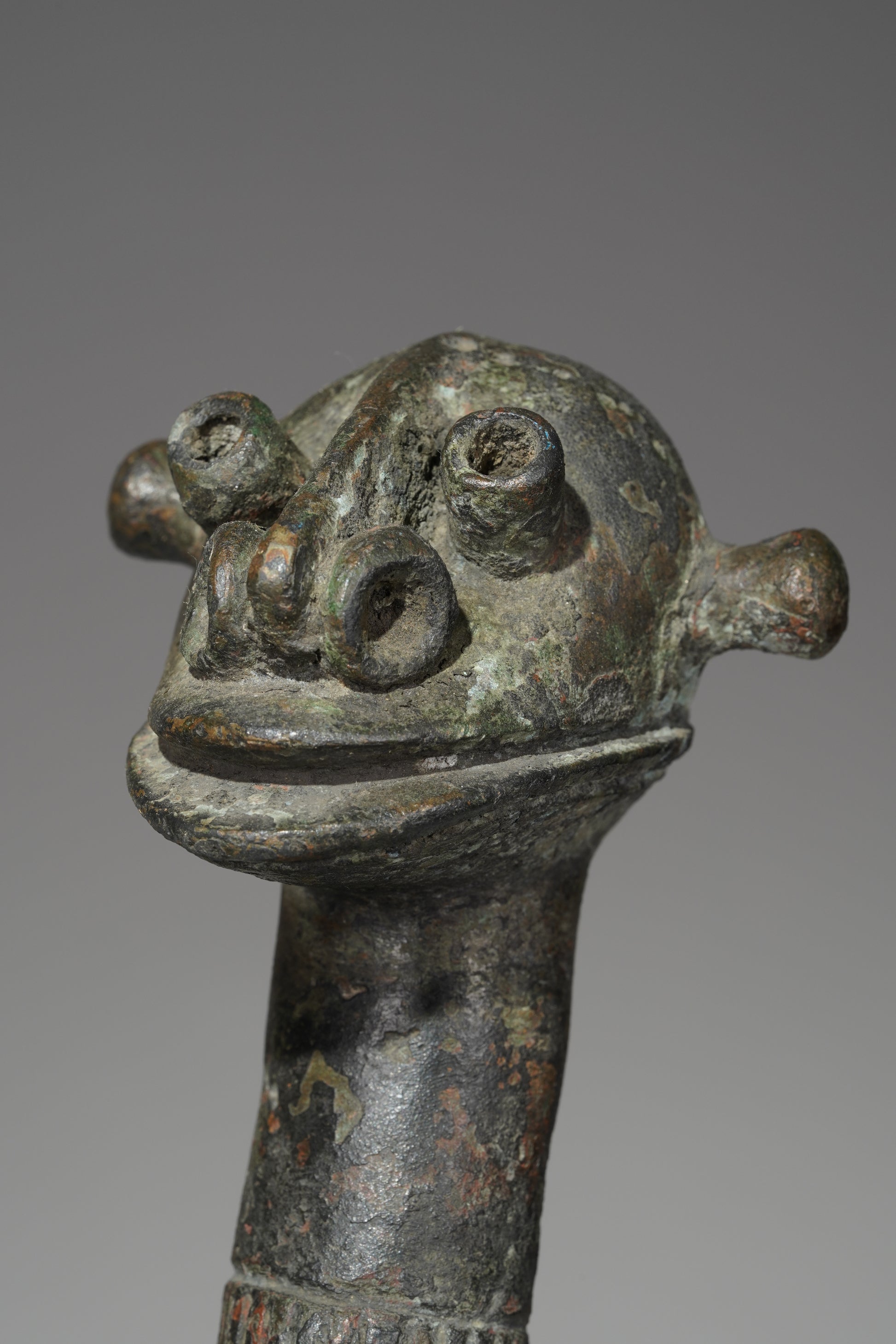 A female Tikar bronze sculpture, east Cameroun, standing on her two large feet, knees slightly bent, large rounded hips, and a thin elongated torso with a protruding navel, she holds the head of two children that grasp her breasts and are sitting on both sides of her hips, the third child is hitting on her back grasping her shoulders. Her arms are thick compared to theirs which are very thin, her cylindric neck is long and holds a small rounded head at its extremity, which has interesting features, a large mouth, flared nose and bulbous eyes, the children have the same features; hols in the knees, hips and neck, signs of use.
