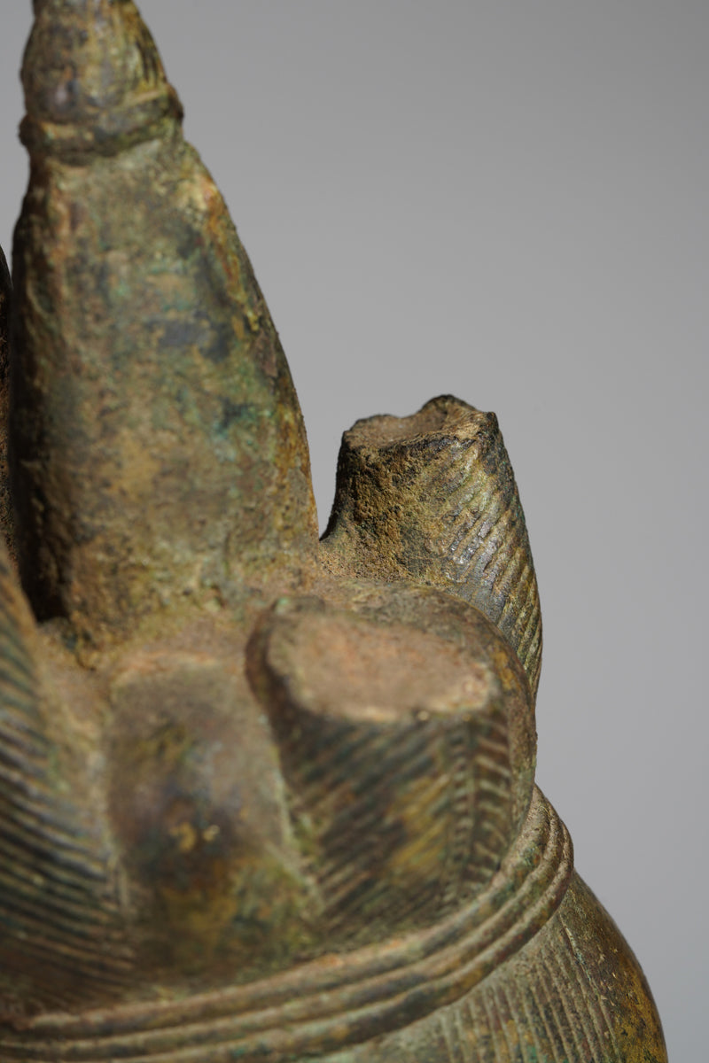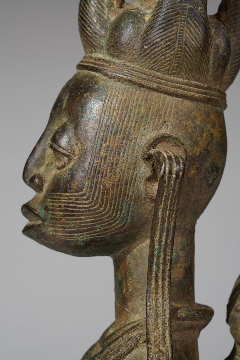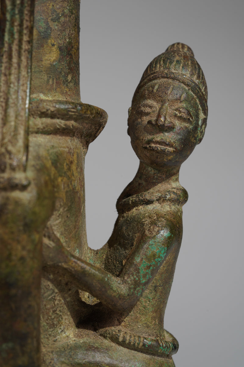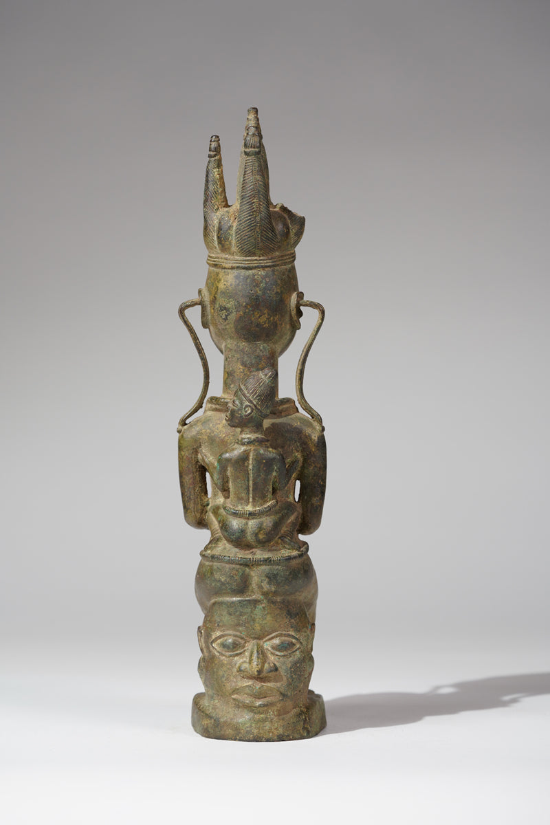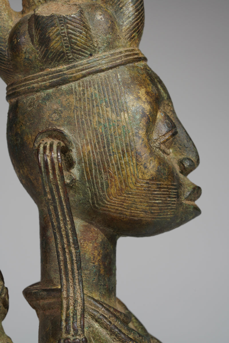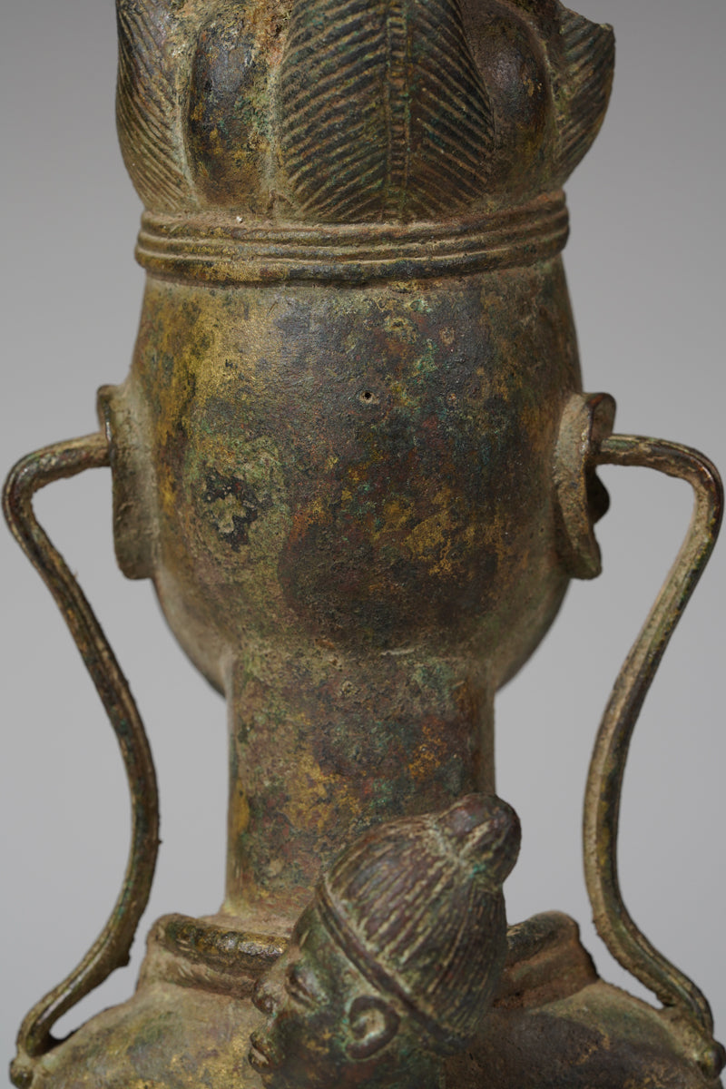 A fragmentary Afo bronze Maternity, Nigeria, arare and symbolically rich depiction of motherhood: A female figure sits atop a stylized male face, holding an offering bowl in her hands while carrying a child on her back. This complex composition alludes to fertility, sacrifice, and the spiritual interconnection between male and female forces. The bronze features a beautiful, multi-layered patina ranging from earthy browns to areas of green oxidation, indicative of significant age and long ritual use. The expressive form and symbolic depth make this piece an outstanding example of traditional Afo metalwork from central Nigeria.
