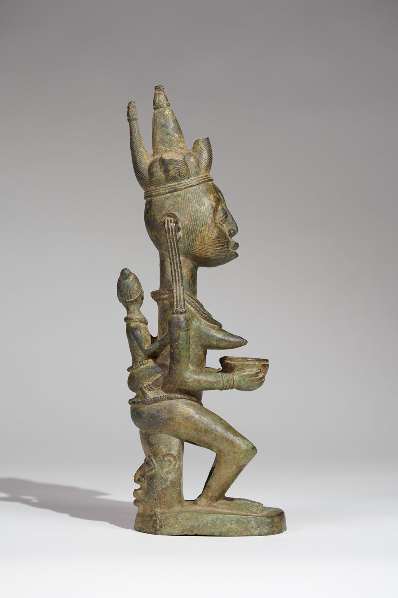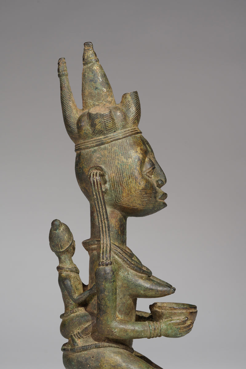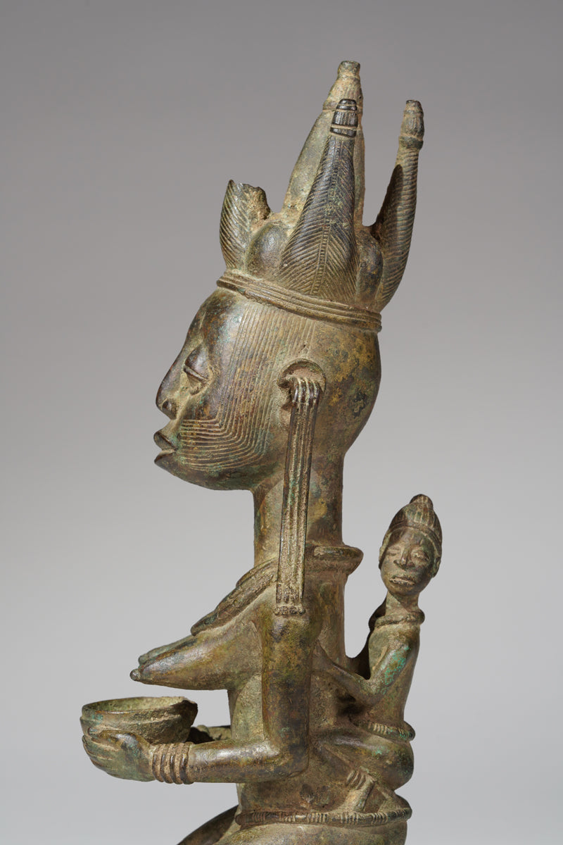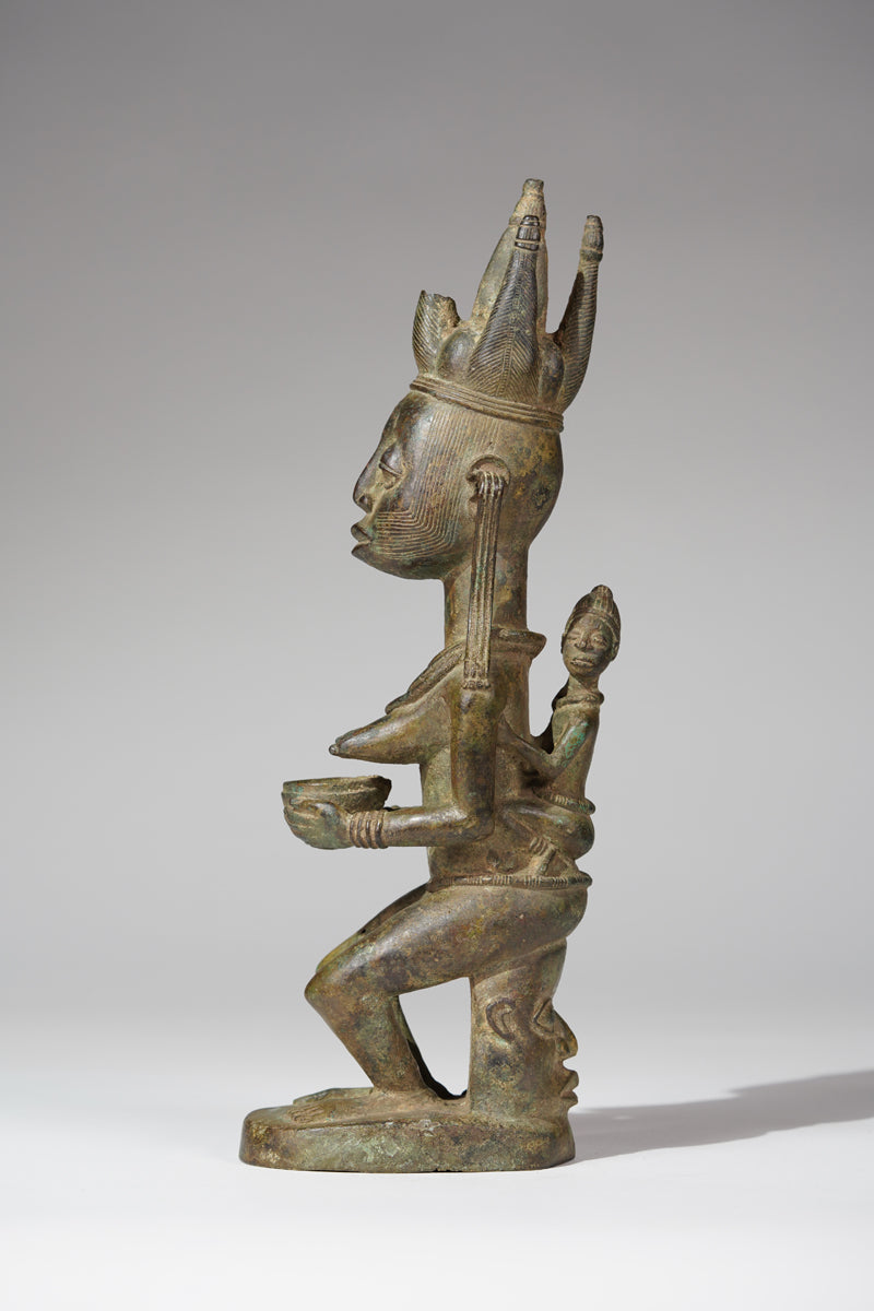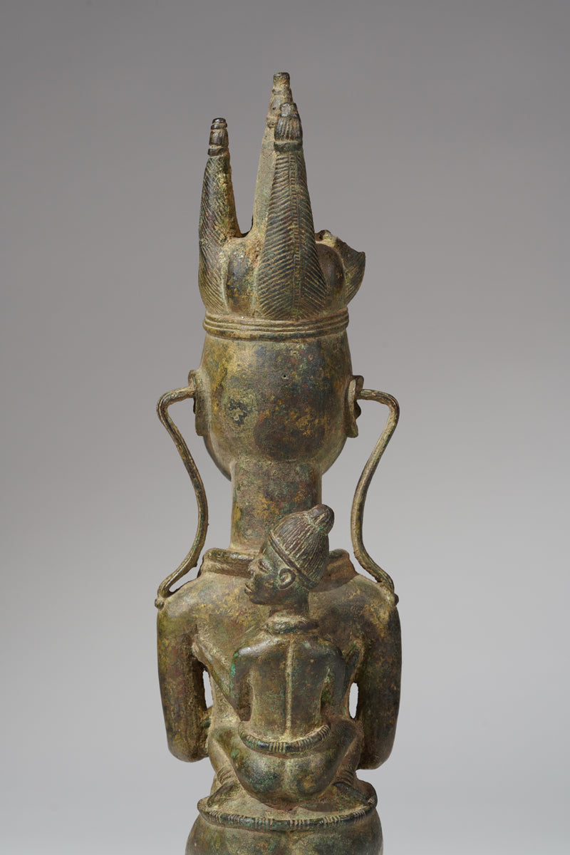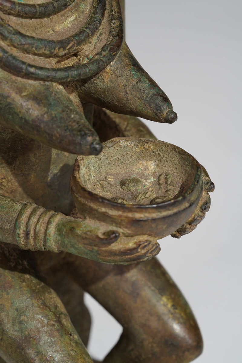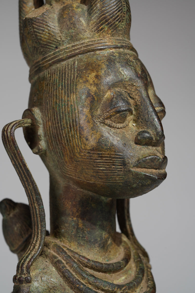 A fragmentary Afo bronze Maternity, Nigeria, arare and symbolically rich depiction of motherhood: A female figure sits atop a stylized male face, holding an offering bowl in her hands while carrying a child on her back. This complex composition alludes to fertility, sacrifice, and the spiritual interconnection between male and female forces. The bronze features a beautiful, multi-layered patina ranging from earthy browns to areas of green oxidation, indicative of significant age and long ritual use. The expressive form and symbolic depth make this piece an outstanding example of traditional Afo metalwork from central Nigeria.