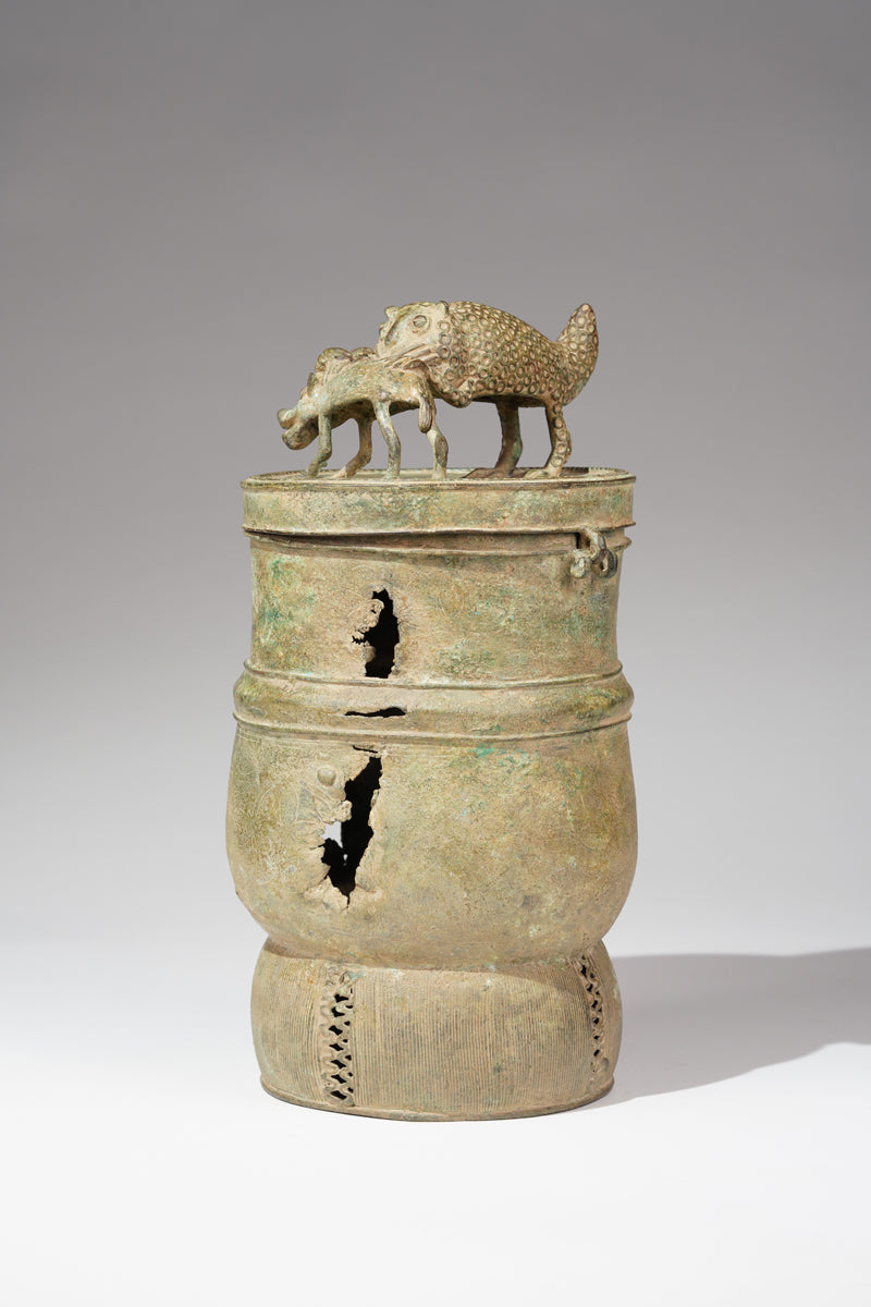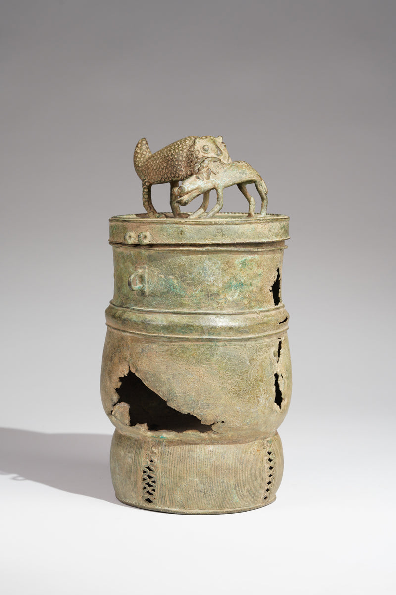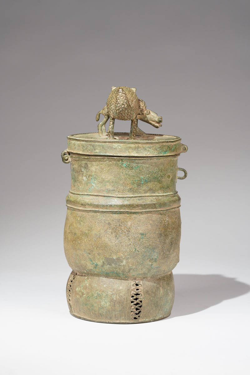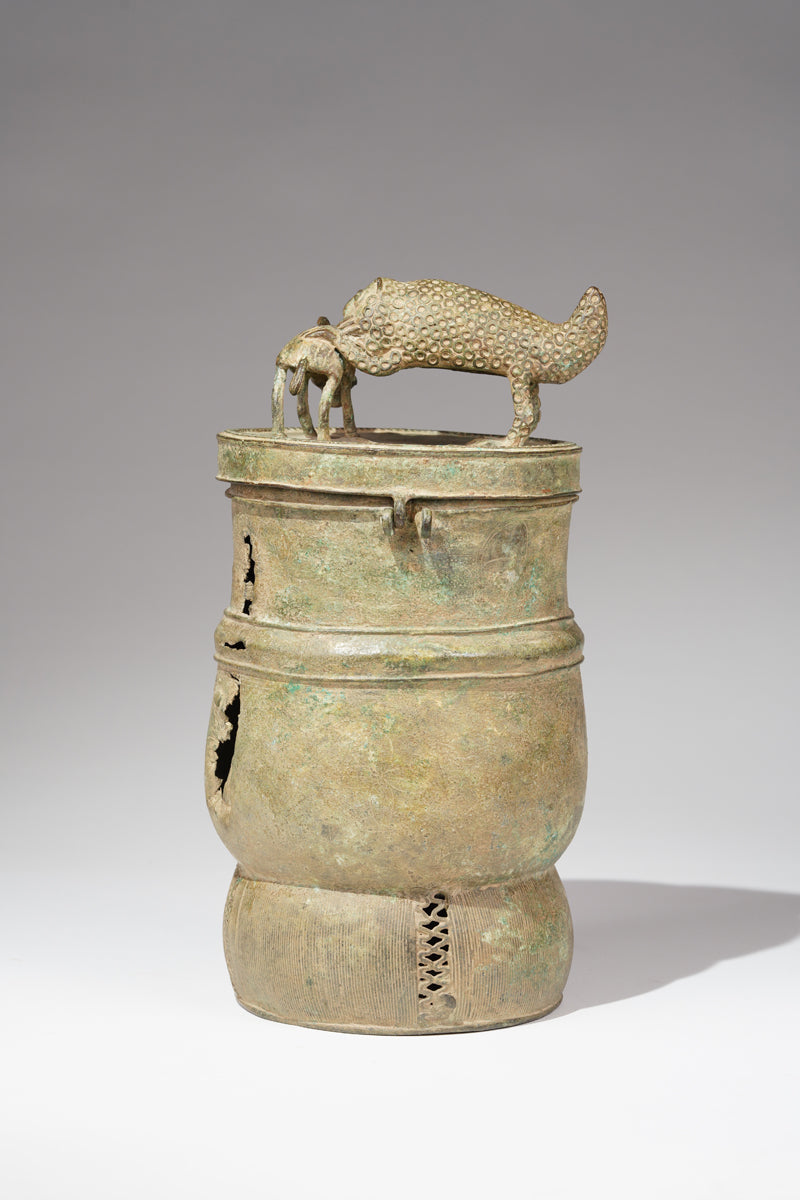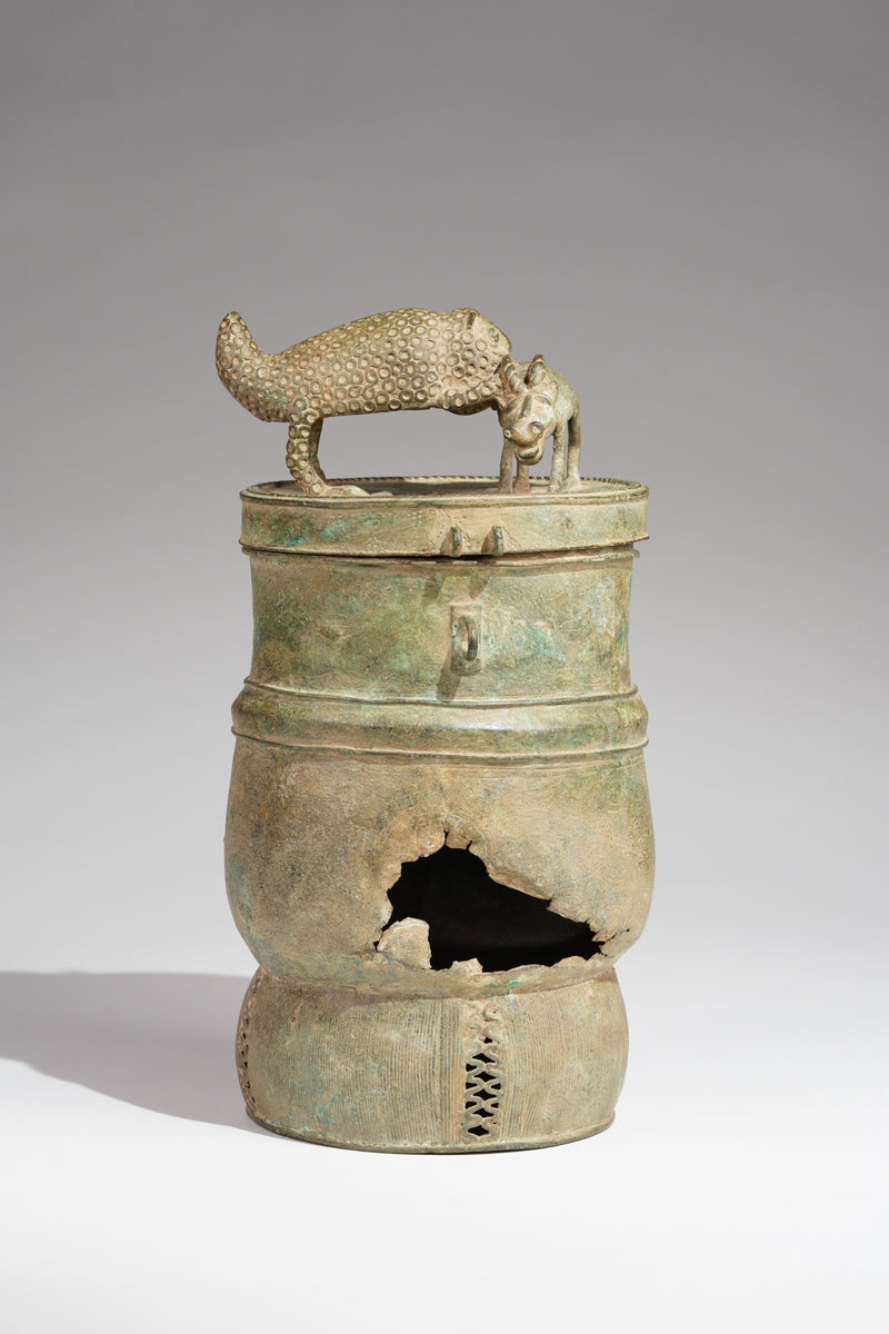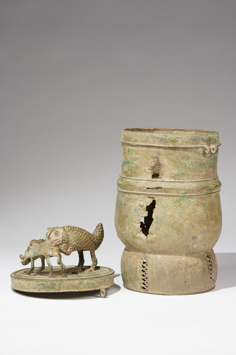 A fragmentary Akan Kuduo vessel, Ghana, on the lid we see a leopard attacking a warthog.