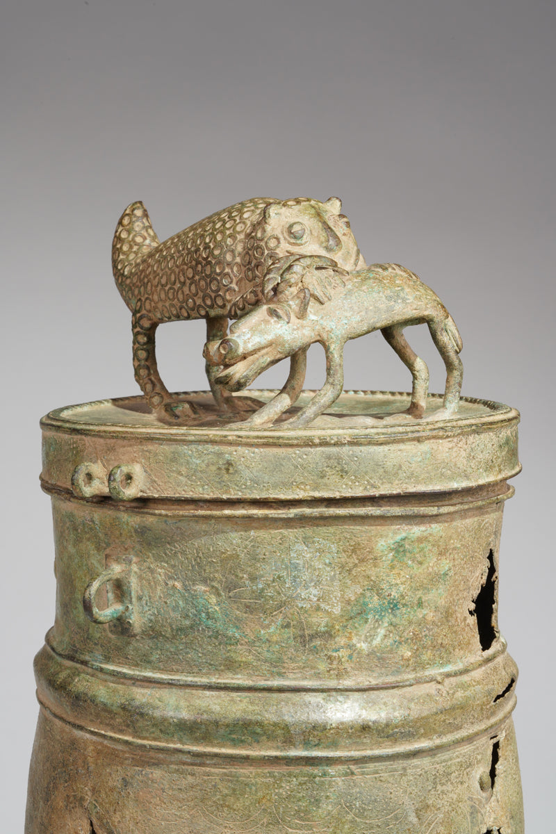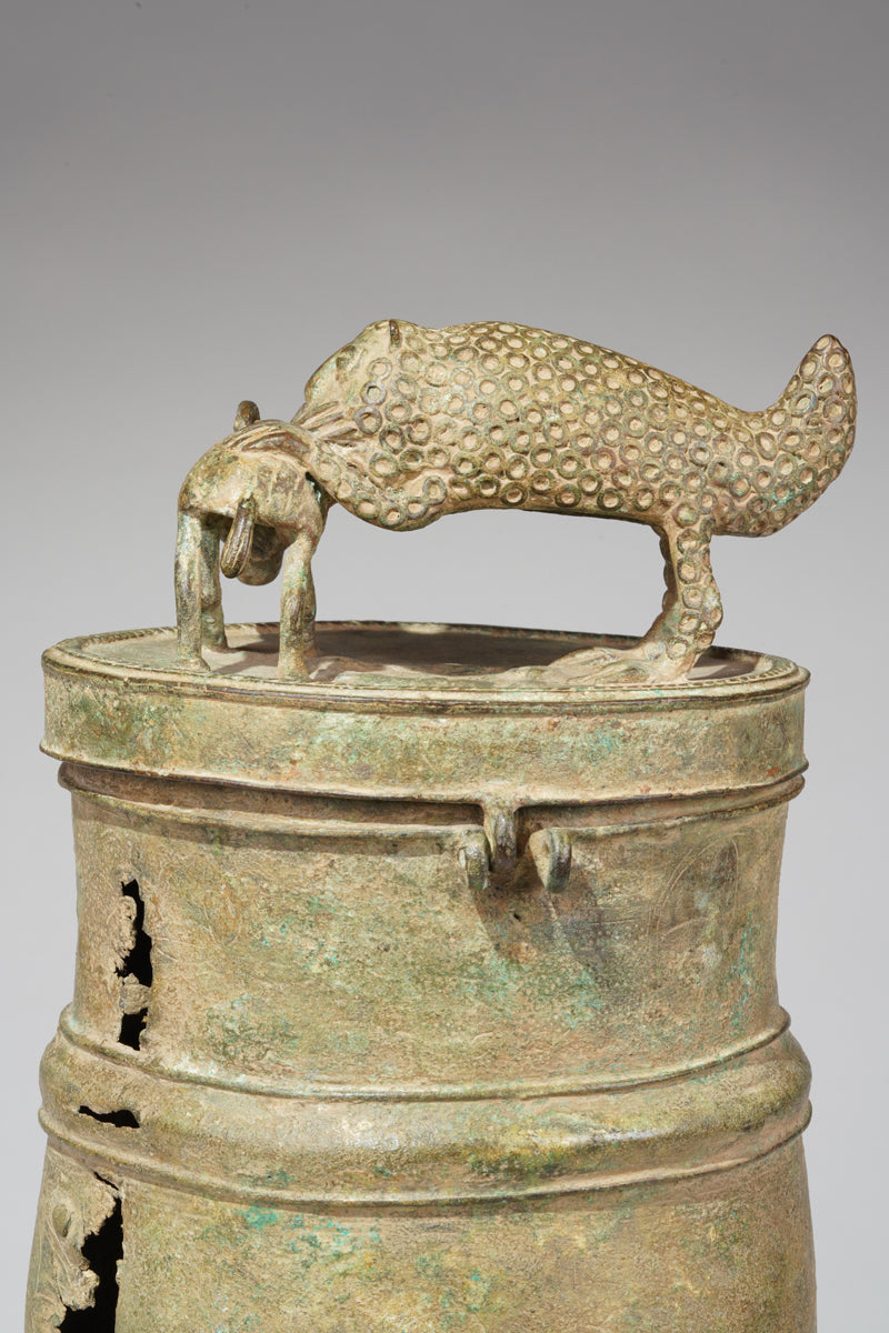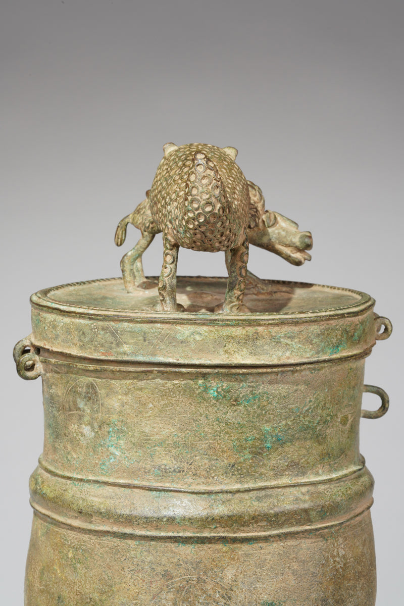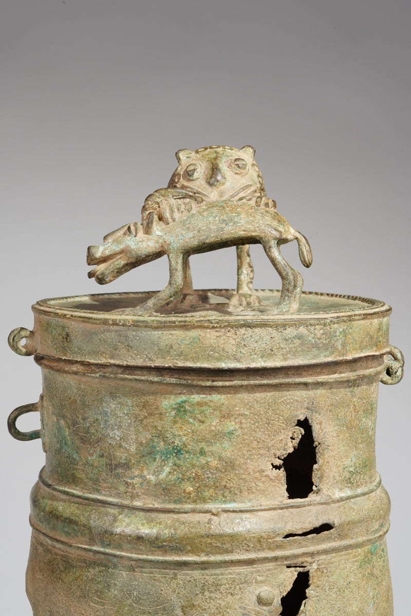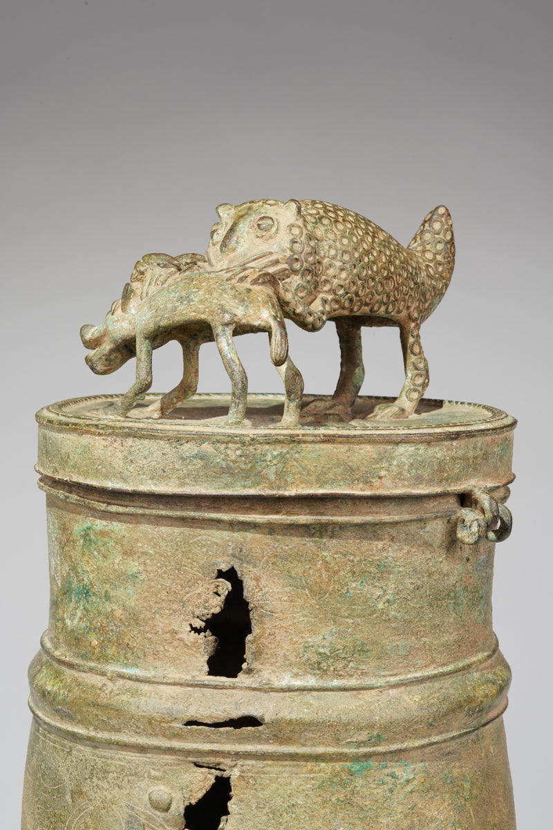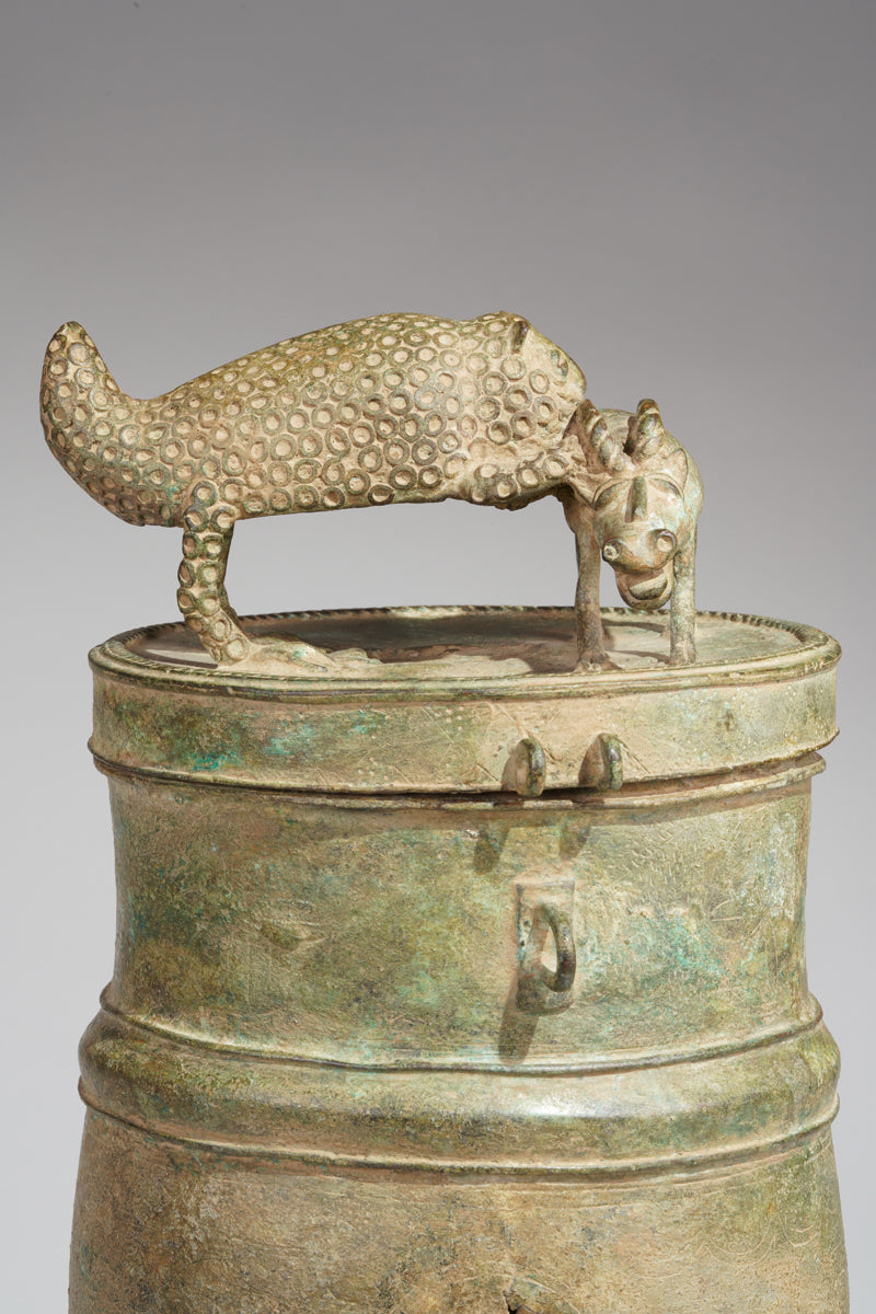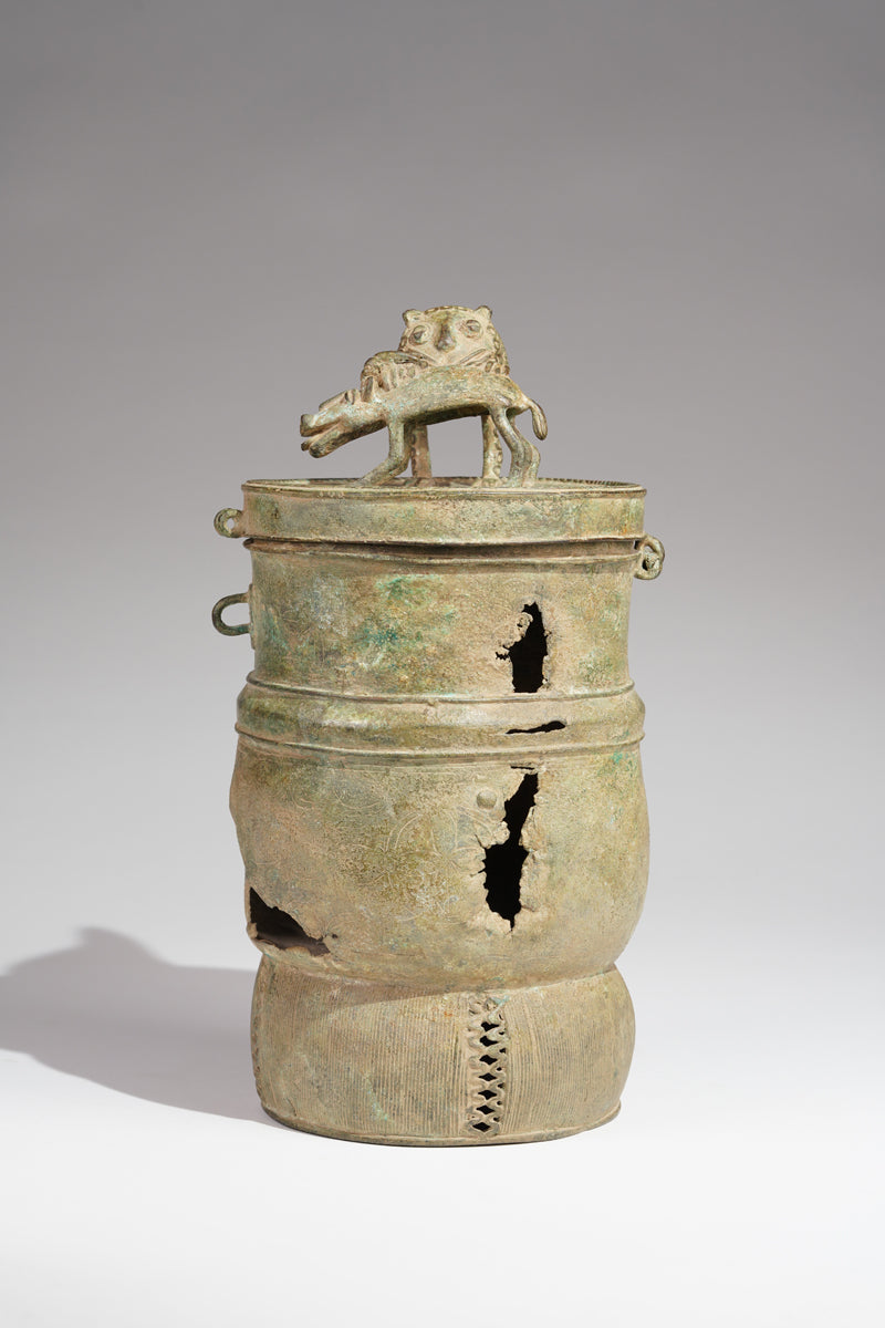 A fragmentary Akan Kuduo vessel, Ghana, on the lid we see a leopard attacking a warthog.