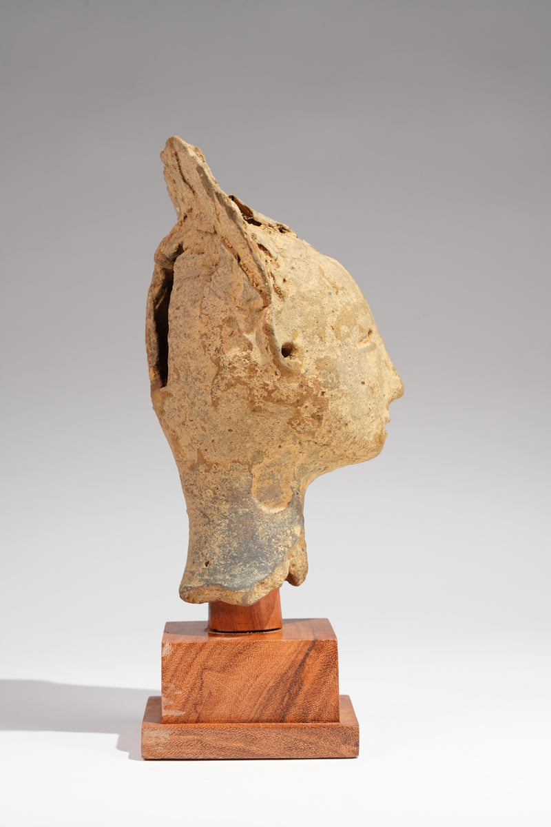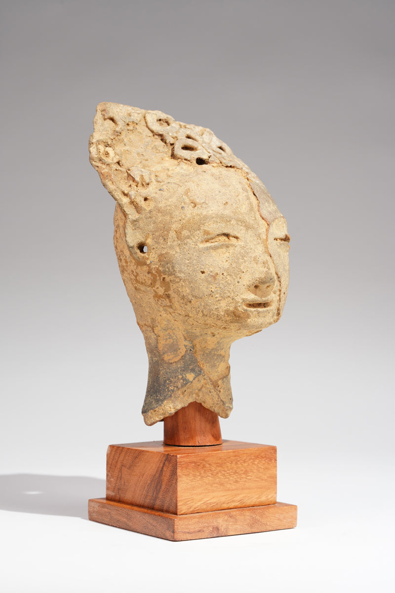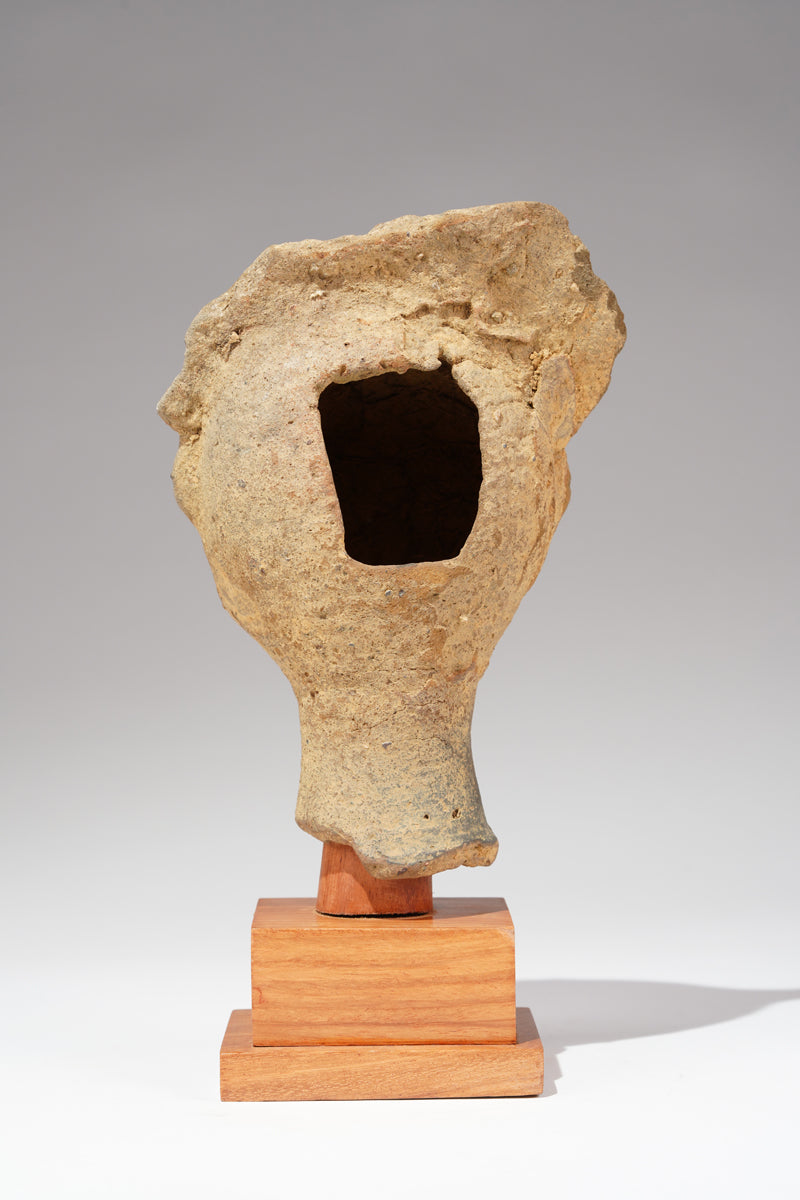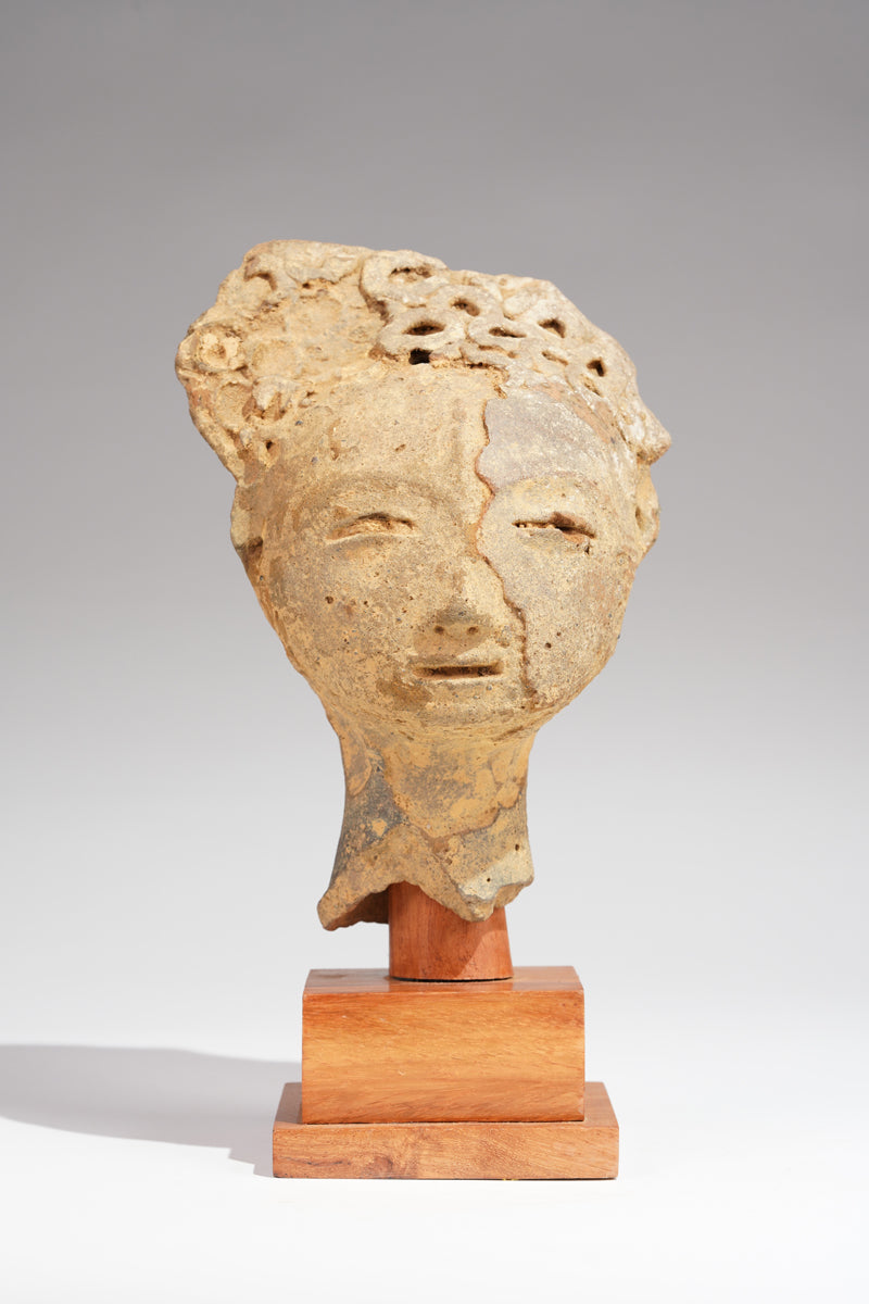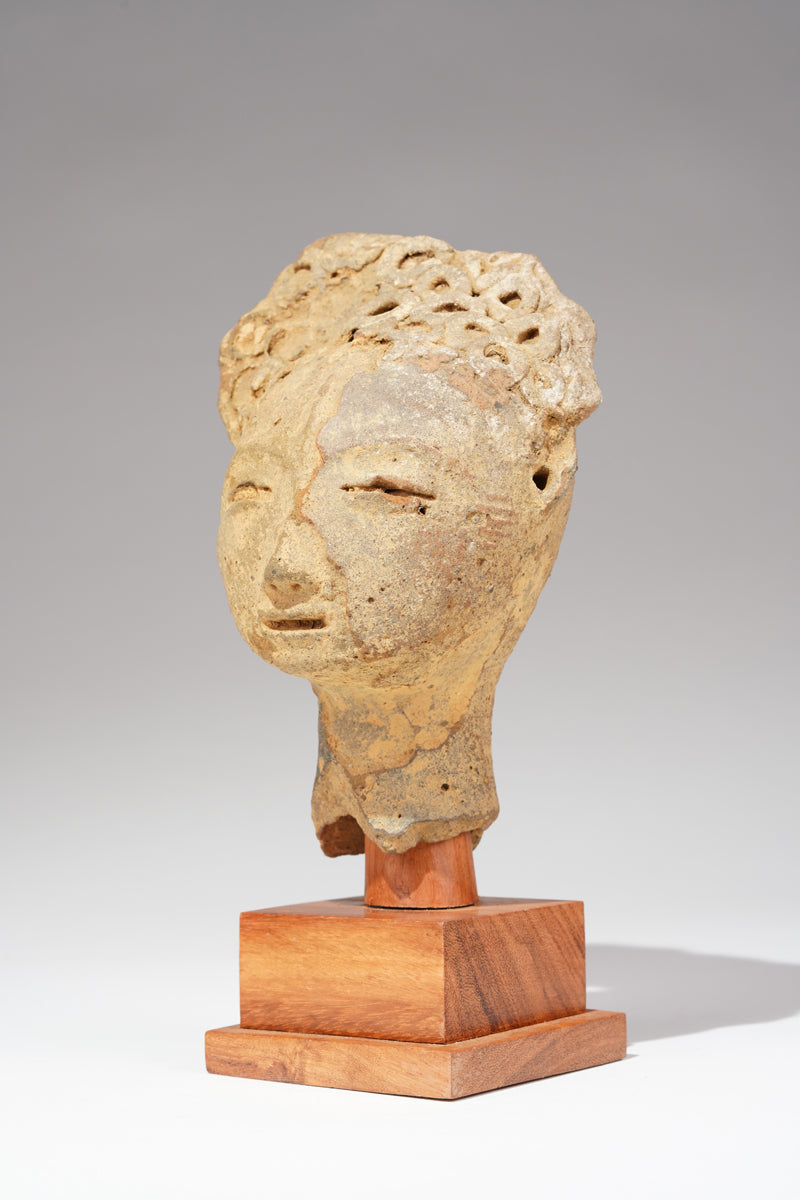 A fragmentary Akan Memorial terracotta head, Ghana, incl. stand.