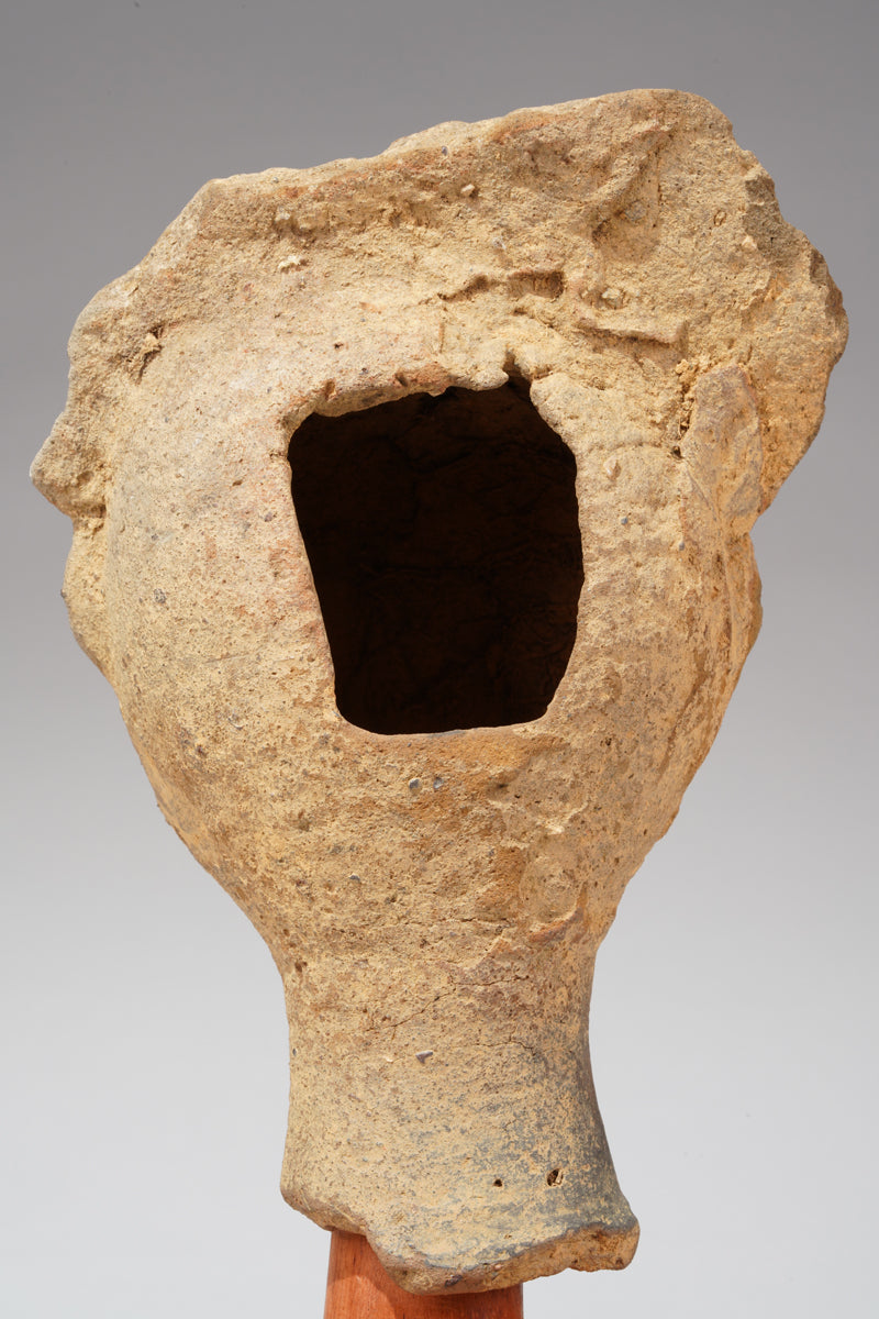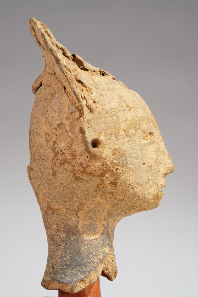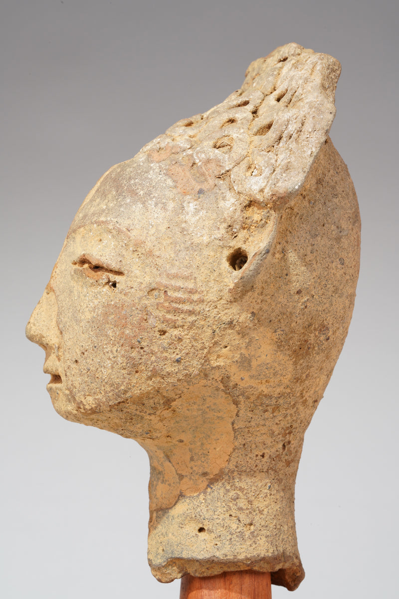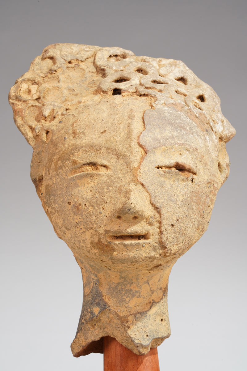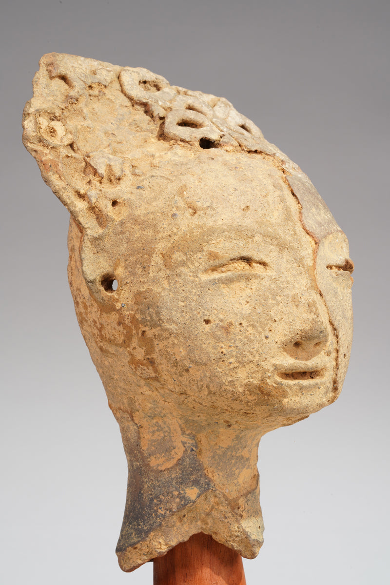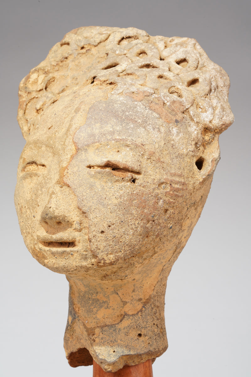 A fragmentary Akan Memorial terracotta head, Ghana, incl. stand.