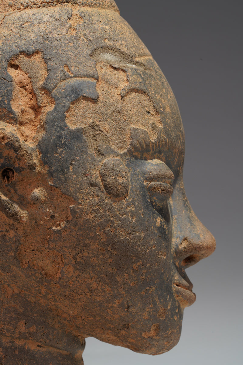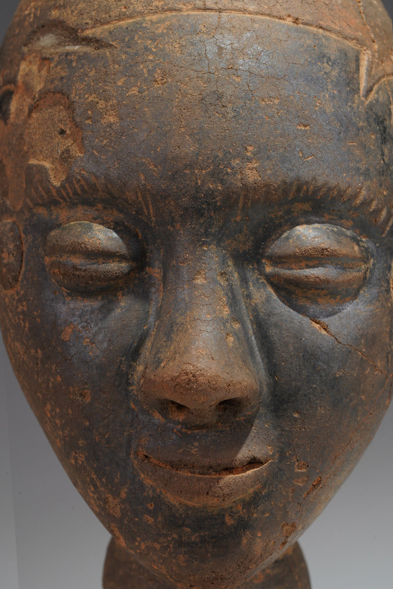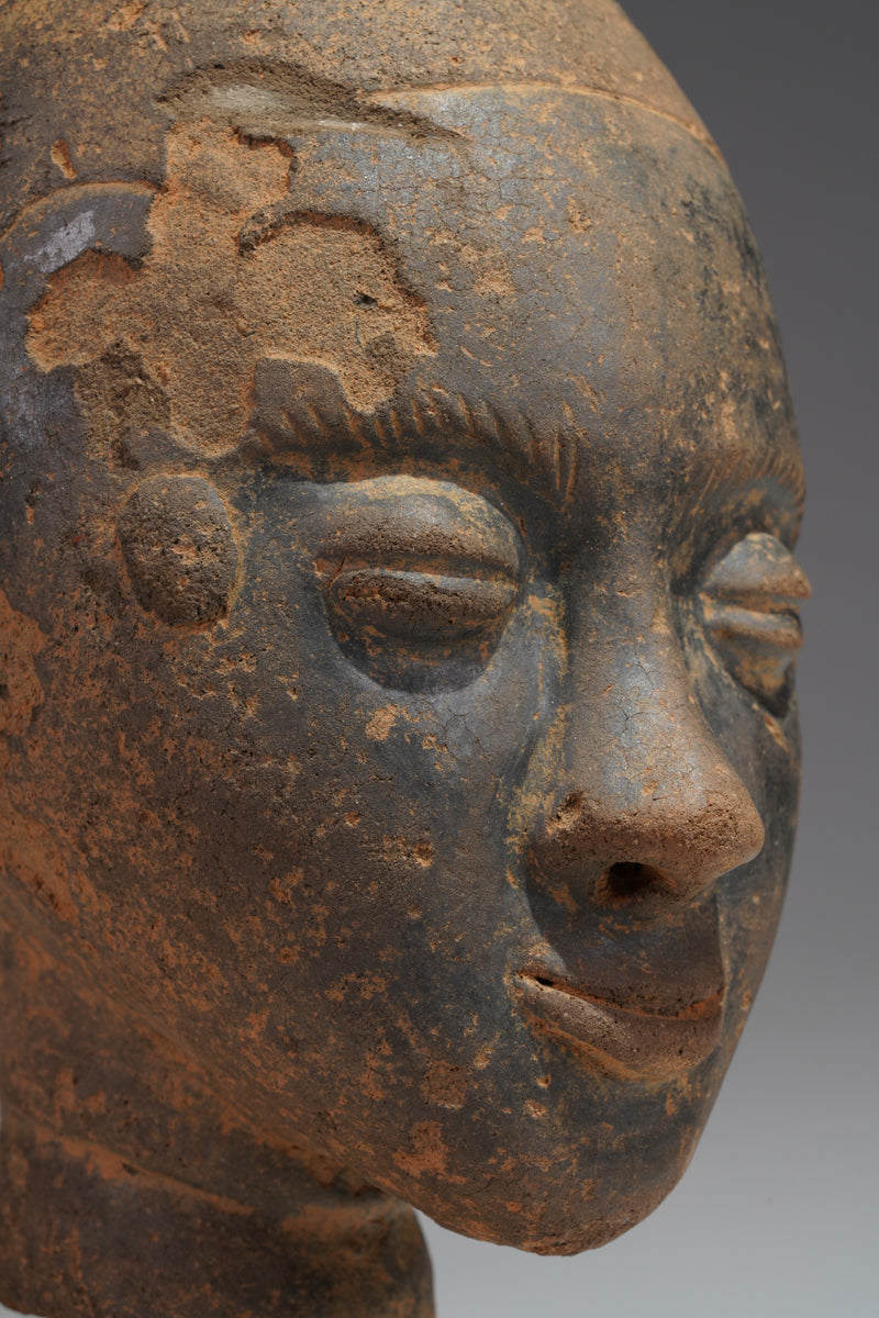 "While terracotta portraiture flourished among southern Akan peoples, it was virtually unknown to the Asante and the northern Akan. Royal family members commissioned terracotta portraits from female artists to be placed in sacred groves outside the village days or even months after they died. Periodically, rituals comprising libations, offerings, and prayers were performed at these groves in honour of the ancestors. Busts, standing and seated figures, and figuratively decorated vessels populated such groves along with commemorative heads, generally called mma ("infants"), of which the Cleveland's head is an example. These terracotta memorials were viewed as idealized portraits of the deceased, with the ancestor's identity suggested by cosmetic adornments, including scarification patterns and symbols of rank and prestige."