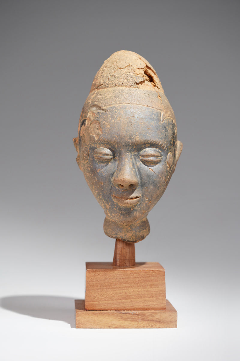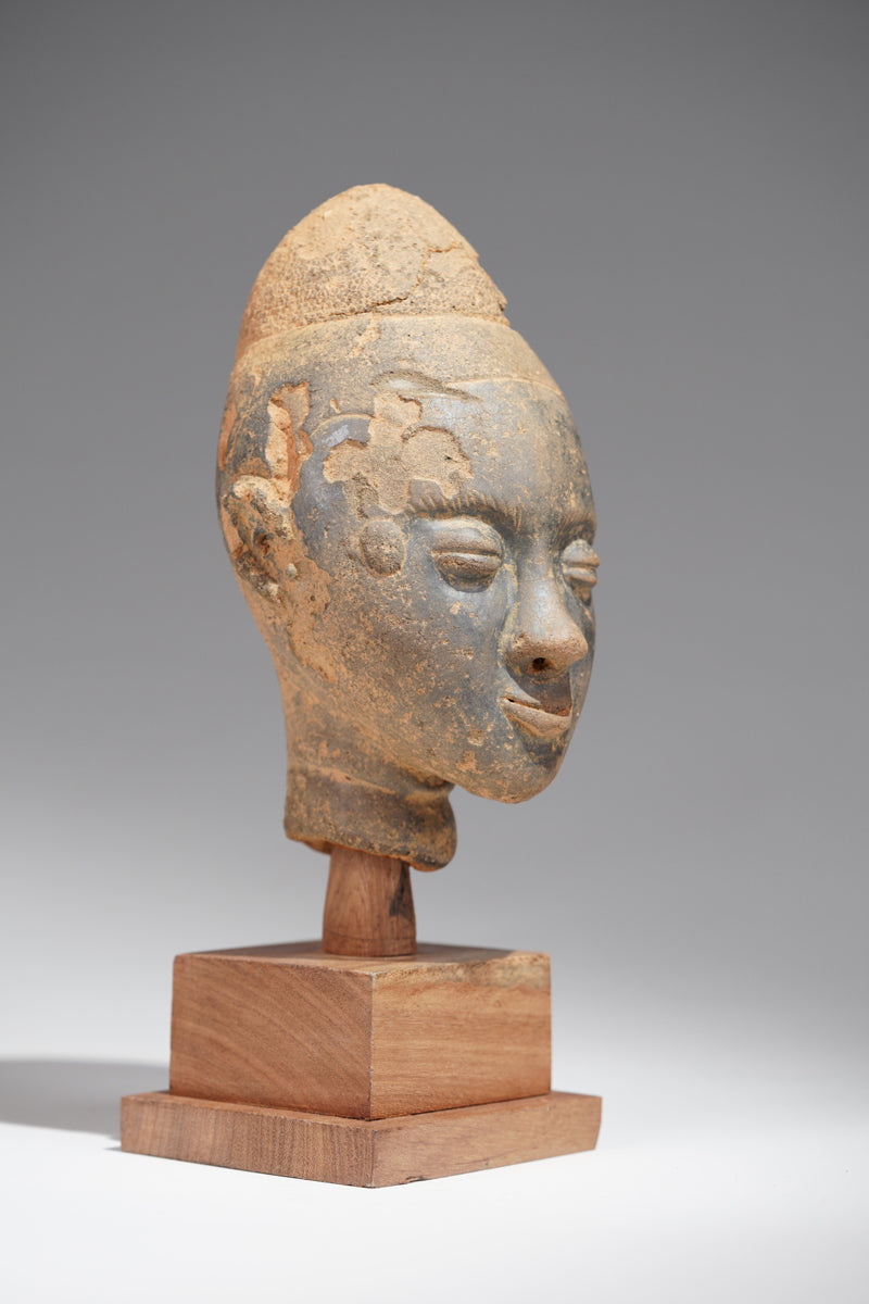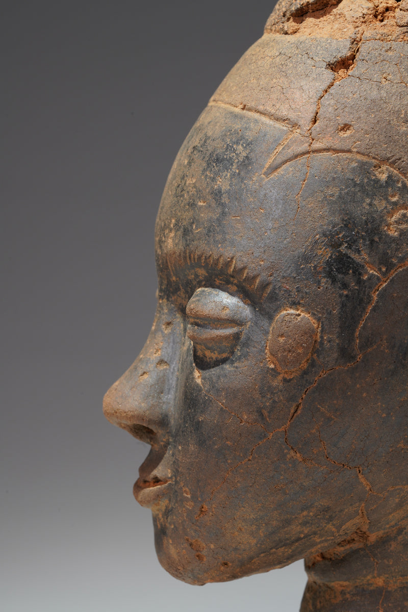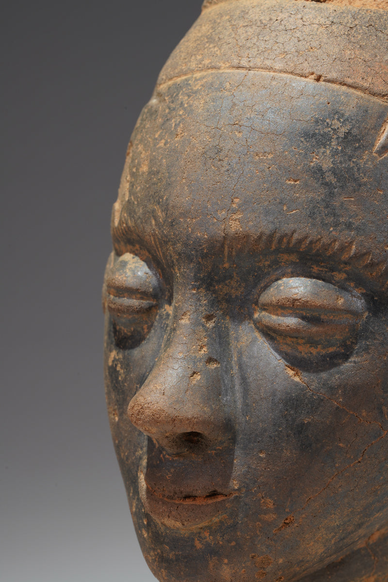 "While terracotta portraiture flourished among southern Akan peoples, it was virtually unknown to the Asante and the northern Akan. Royal family members commissioned terracotta portraits from female artists to be placed in sacred groves outside the village days or even months after they died. Periodically, rituals comprising libations, offerings, and prayers were performed at these groves in honour of the ancestors. Busts, standing and seated figures, and figuratively decorated vessels populated such groves along with commemorative heads, generally called mma ("infants"), of which the Cleveland's head is an example. These terracotta memorials were viewed as idealized portraits of the deceased, with the ancestor's identity suggested by cosmetic adornments, including scarification patterns and symbols of rank and prestige."
