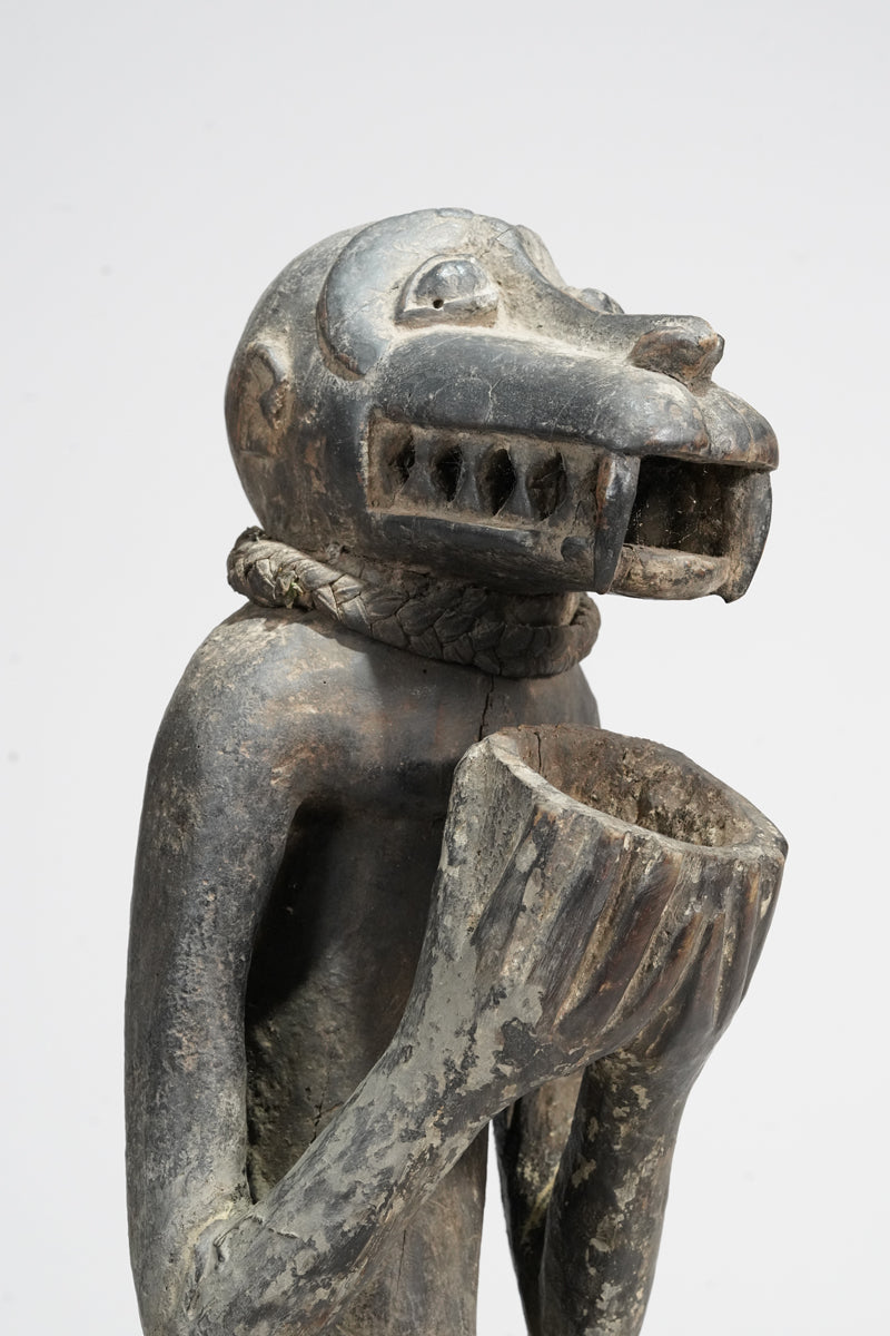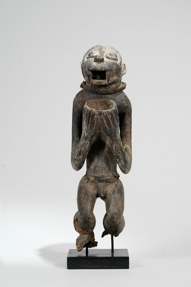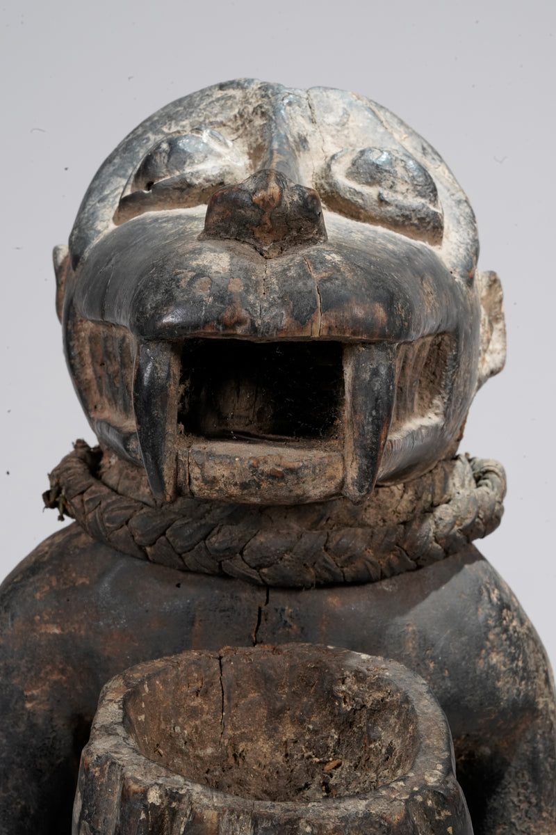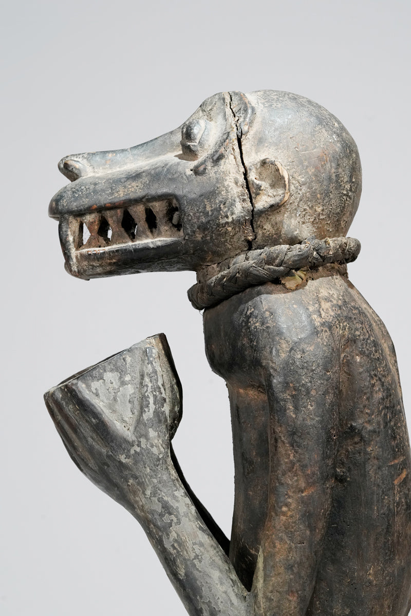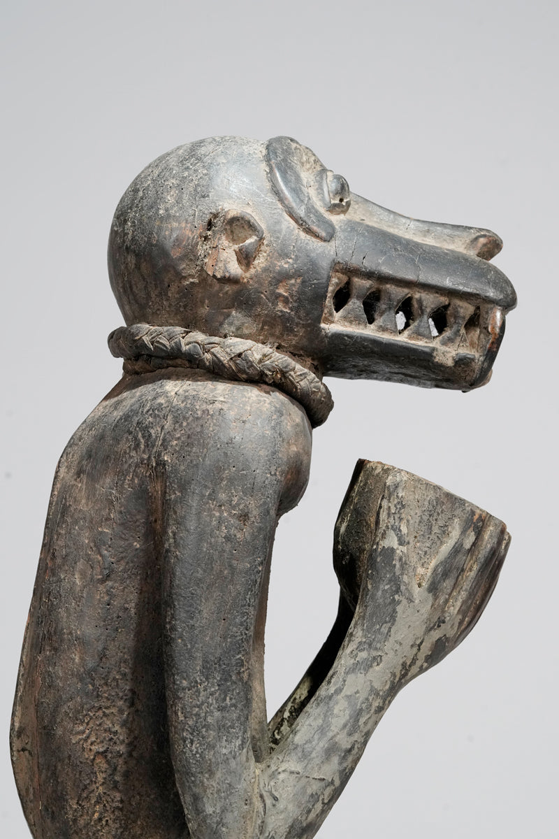 A fragmentary Baule monkey, holding a vessel in its hands, the legs in a bent position, a loincloth covers the male genitals, a braided textile ring around the short neck, the teeth in open work manner with imposing canine teeth, the gaze of the bulging eyes is directed upwards and underlines the submissive posture of this monkey sculpture; gray to brown surface, partially flaked off,
