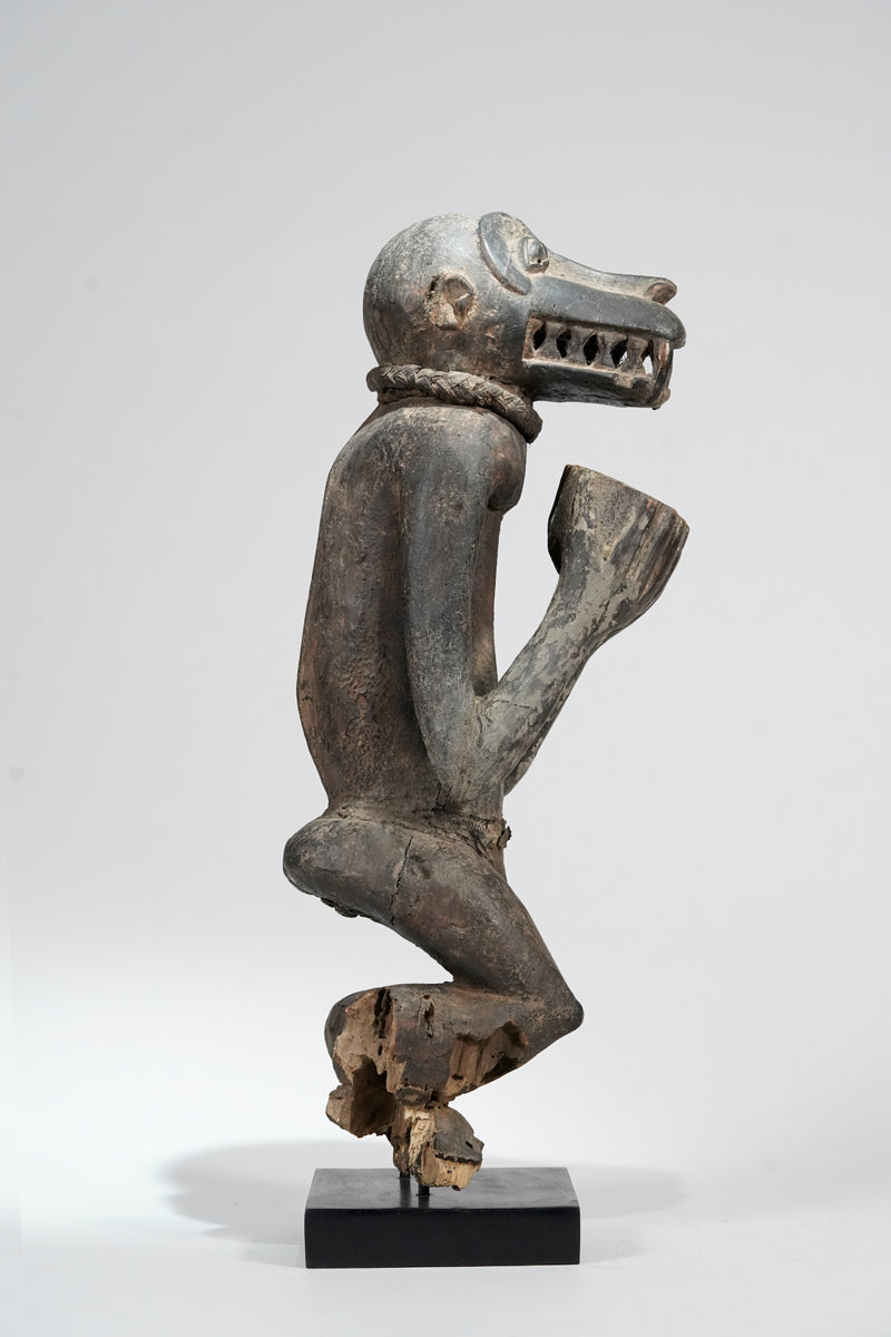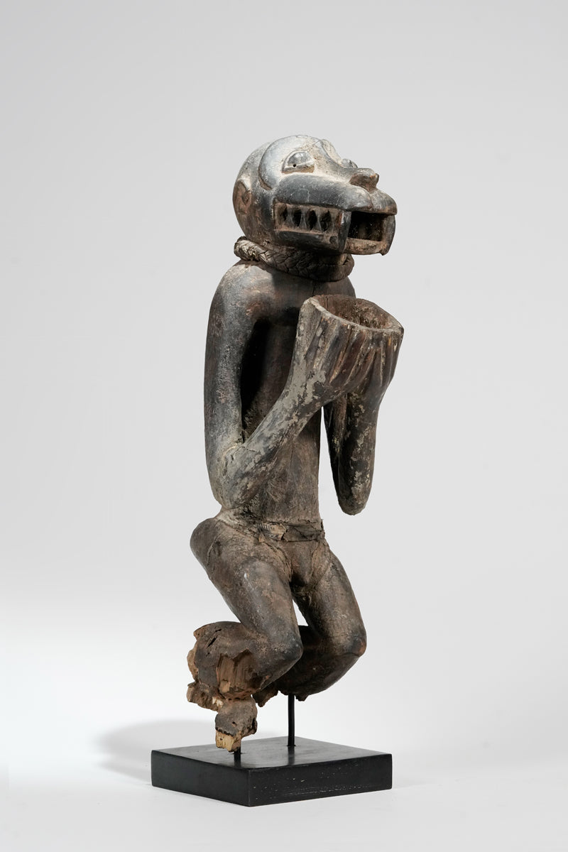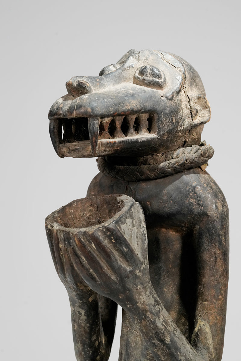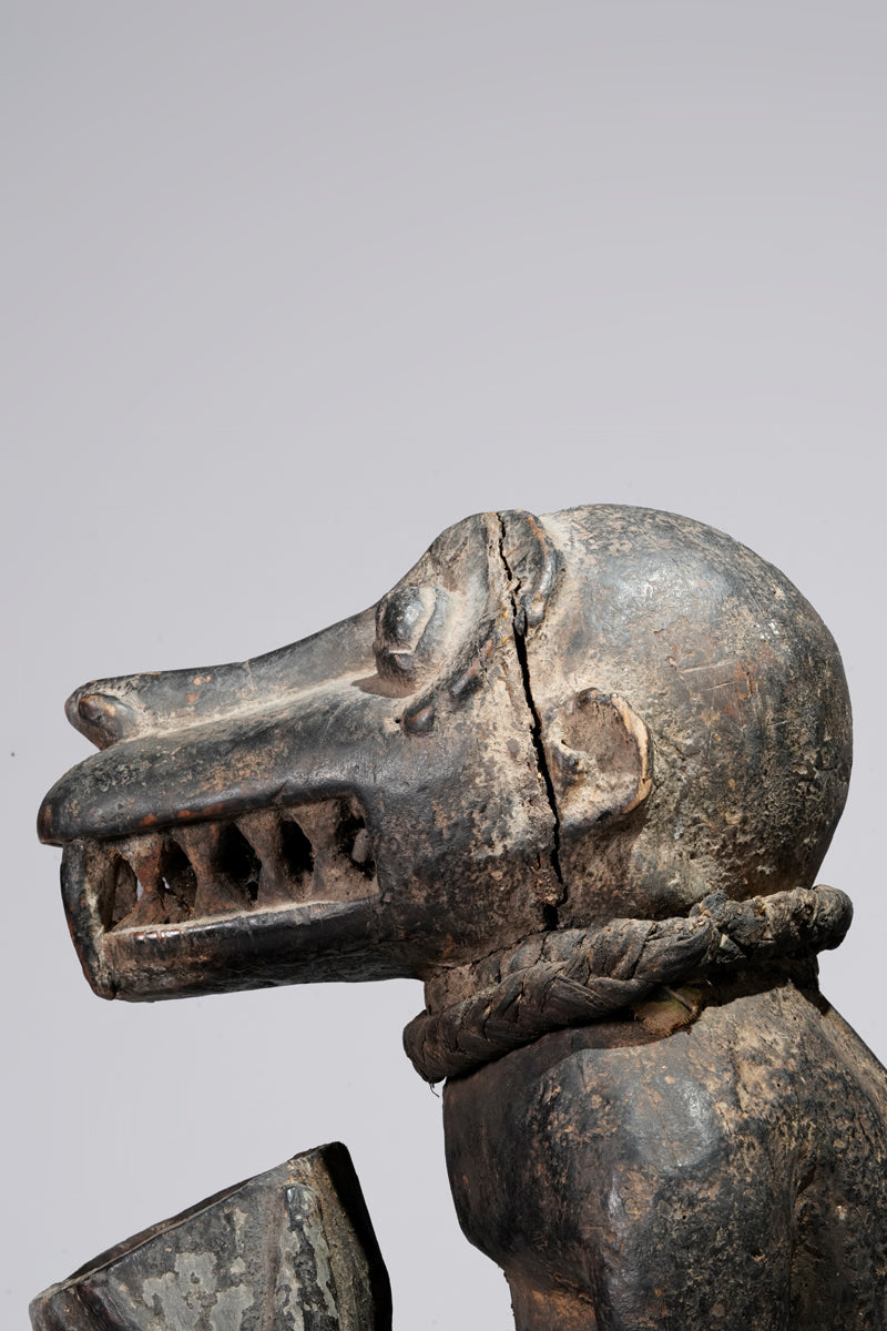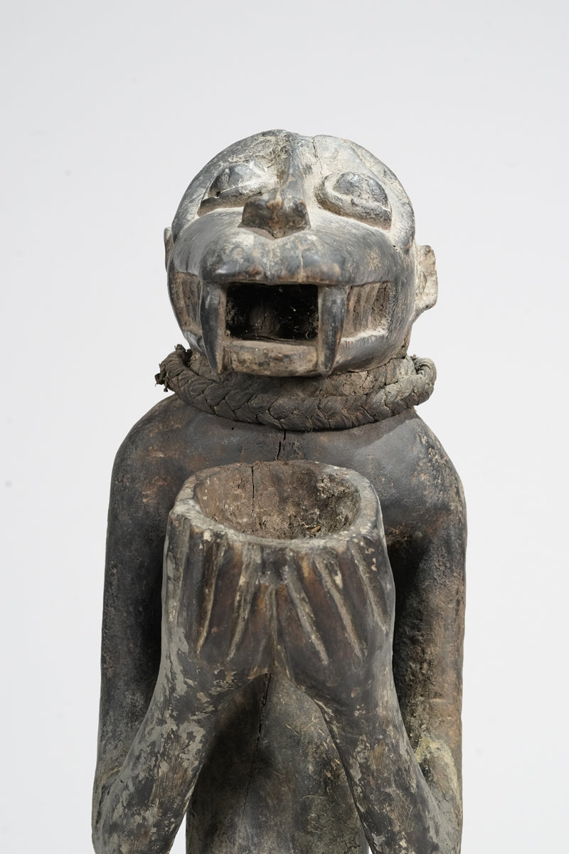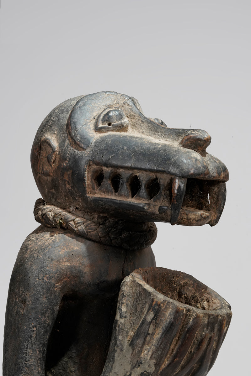 A fragmentary Baule monkey, holding a vessel in its hands, the legs in a bent position, a loincloth covers the male genitals, a braided textile ring around the short neck, the teeth in open work manner with imposing canine teeth, the gaze of the bulging eyes is directed upwards and underlines the submissive posture of this monkey sculpture; gray to brown surface, partially flaked off,