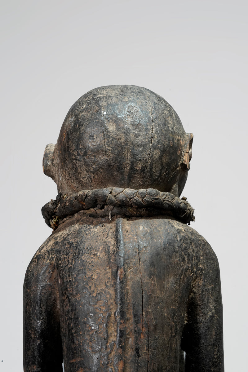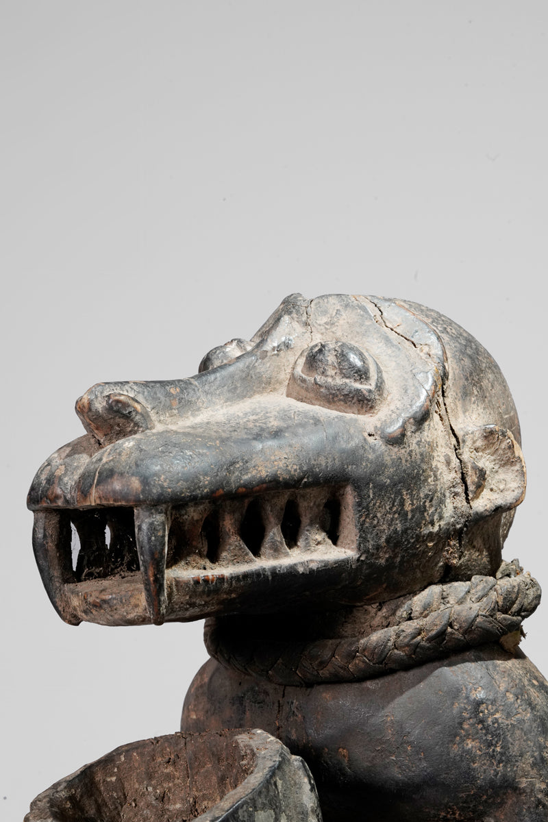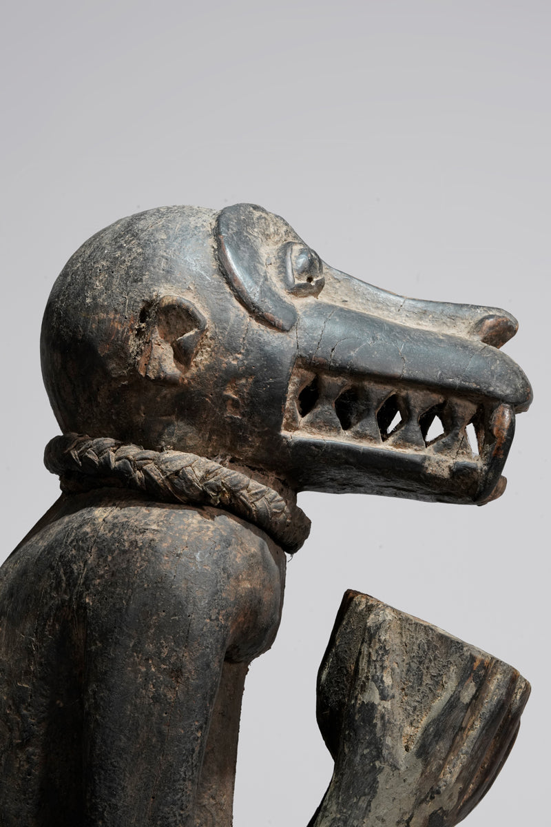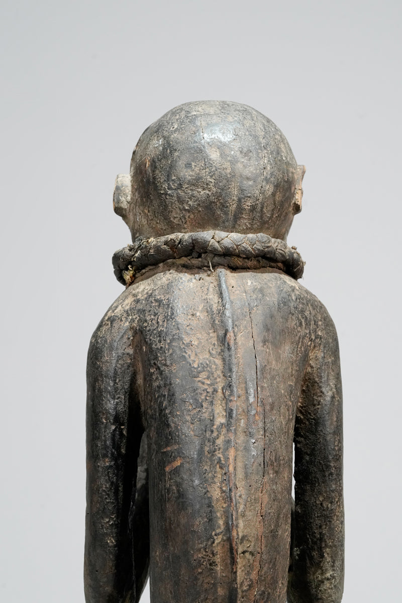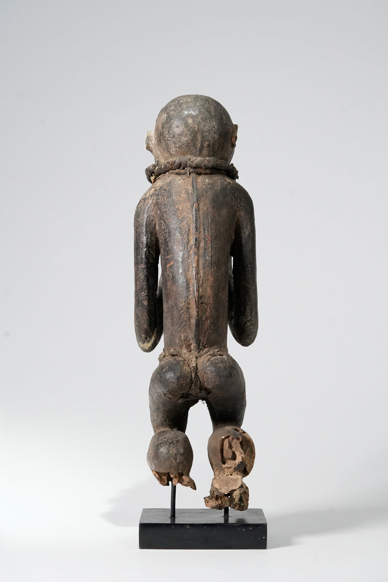 A fragmentary Baule monkey, holding a vessel in its hands, the legs in a bent position, a loincloth covers the male genitals, a braided textile ring around the short neck, the teeth in open work manner with imposing canine teeth, the gaze of the bulging eyes is directed upwards and underlines the submissive posture of this monkey sculpture; gray to brown surface, partially flaked off,