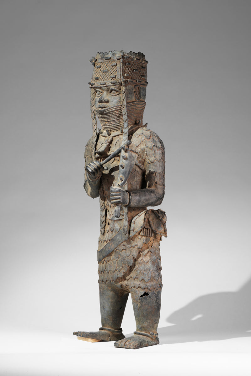 A fragmentary bronze in the style of Benin, In the robes of an Oba, striking a gong or bell. The Oba's unusual rectangular crown suggests bronze plaques with a similar depiction of an Oba or a high-ranking figure; condition report: the left foot has a crack and bent upwards, the left arm is slightly warped and has dents. Bronzes in this size are extremly rare.