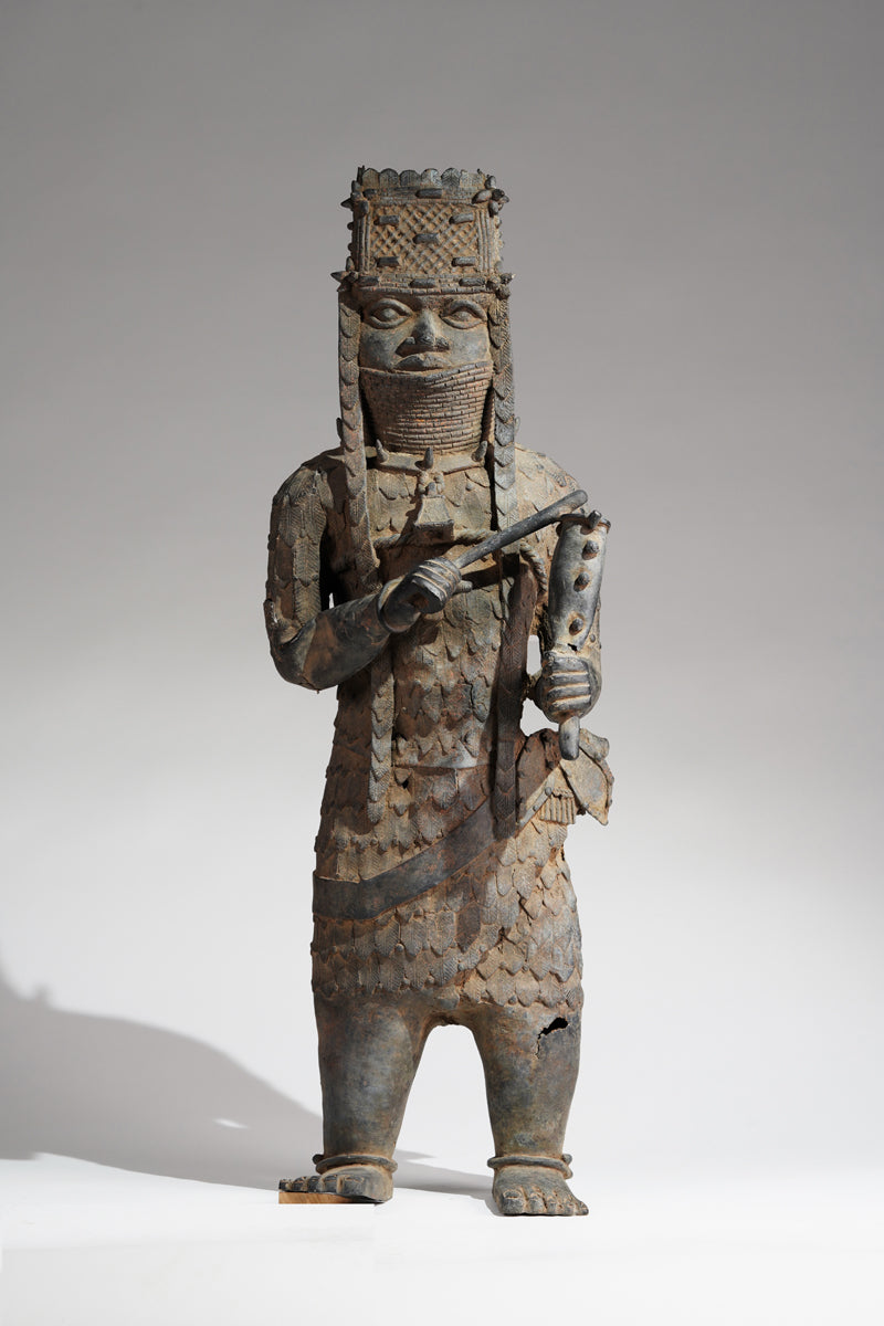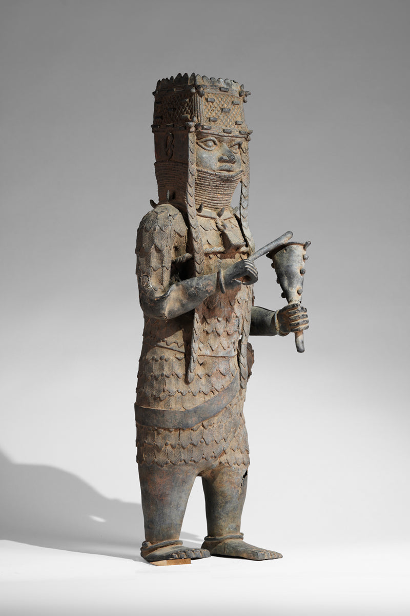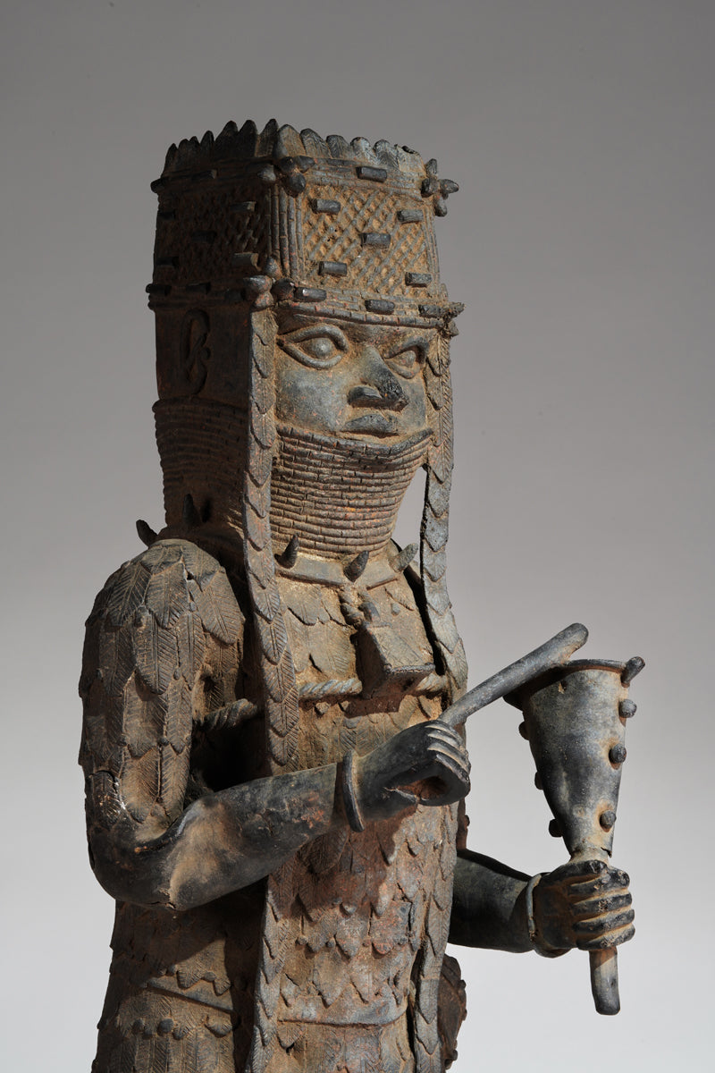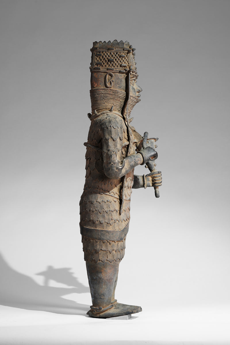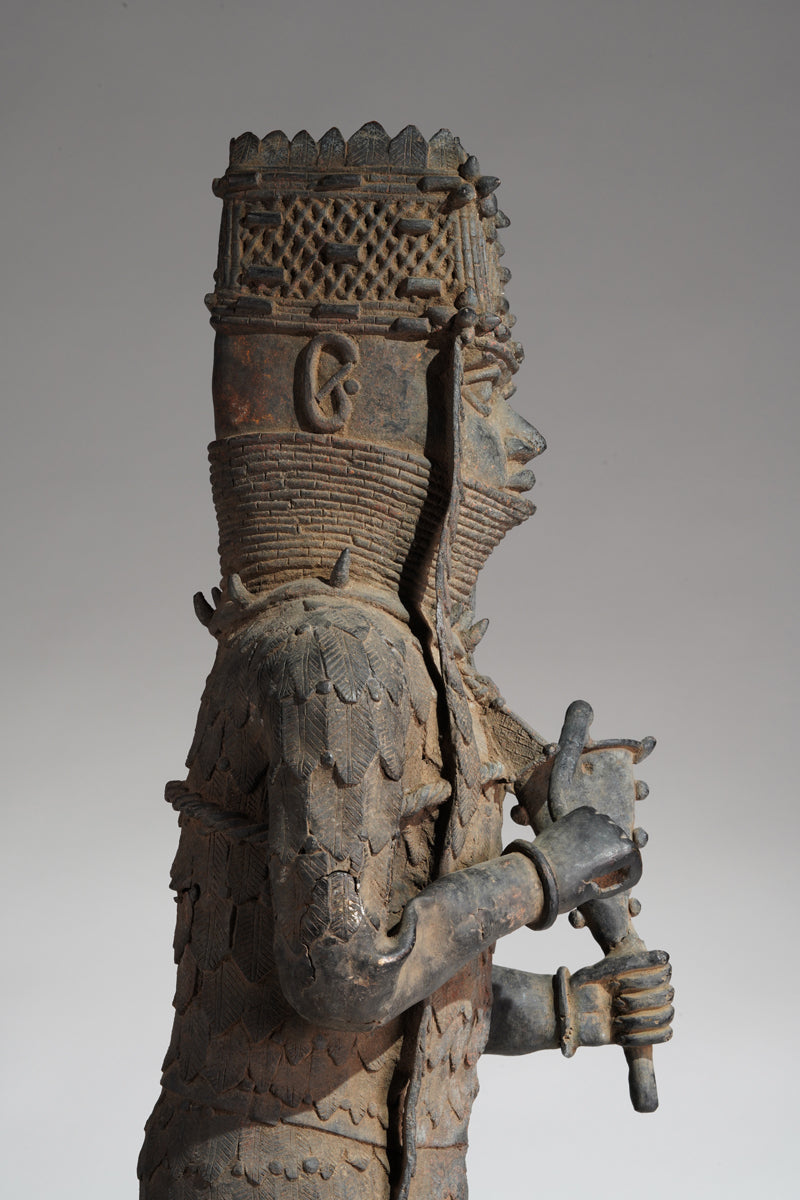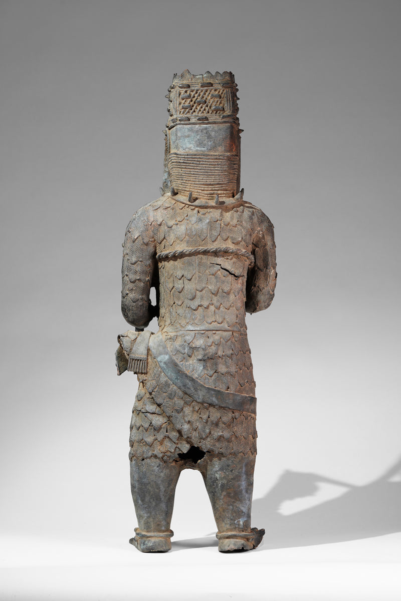 There are examples of this that we have collected in the past. Similar depictions are also documented on Digital Benin. In the robes of an Oba, striking a gong or bell. The Oba's unusual rectangular crown suggests bronze plaques with a similar depiction of an Oba or a high-ranking personality . There are examples of this that we have collected in the past. Similar depictions are also documented on Digital Benin. The scaled dress of the depicted person also appears to be typical of a particular period and style of clothing, although it is not entirely clear whether it is a feather costume or a dress made of scaled metal, as we know it from knight's armor.