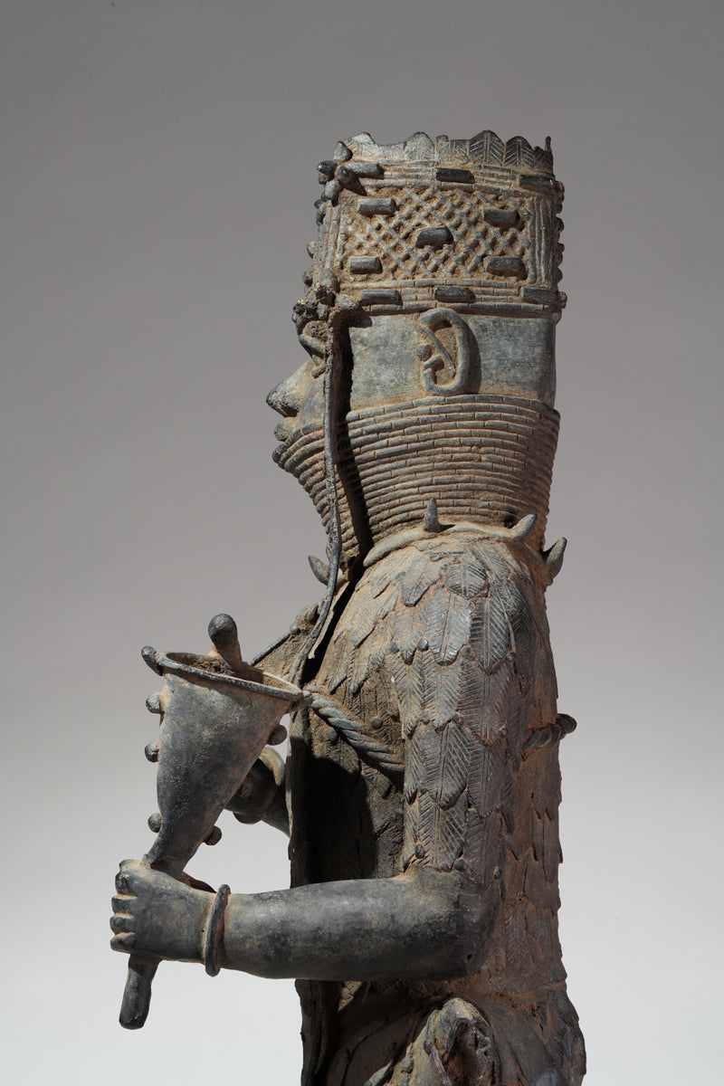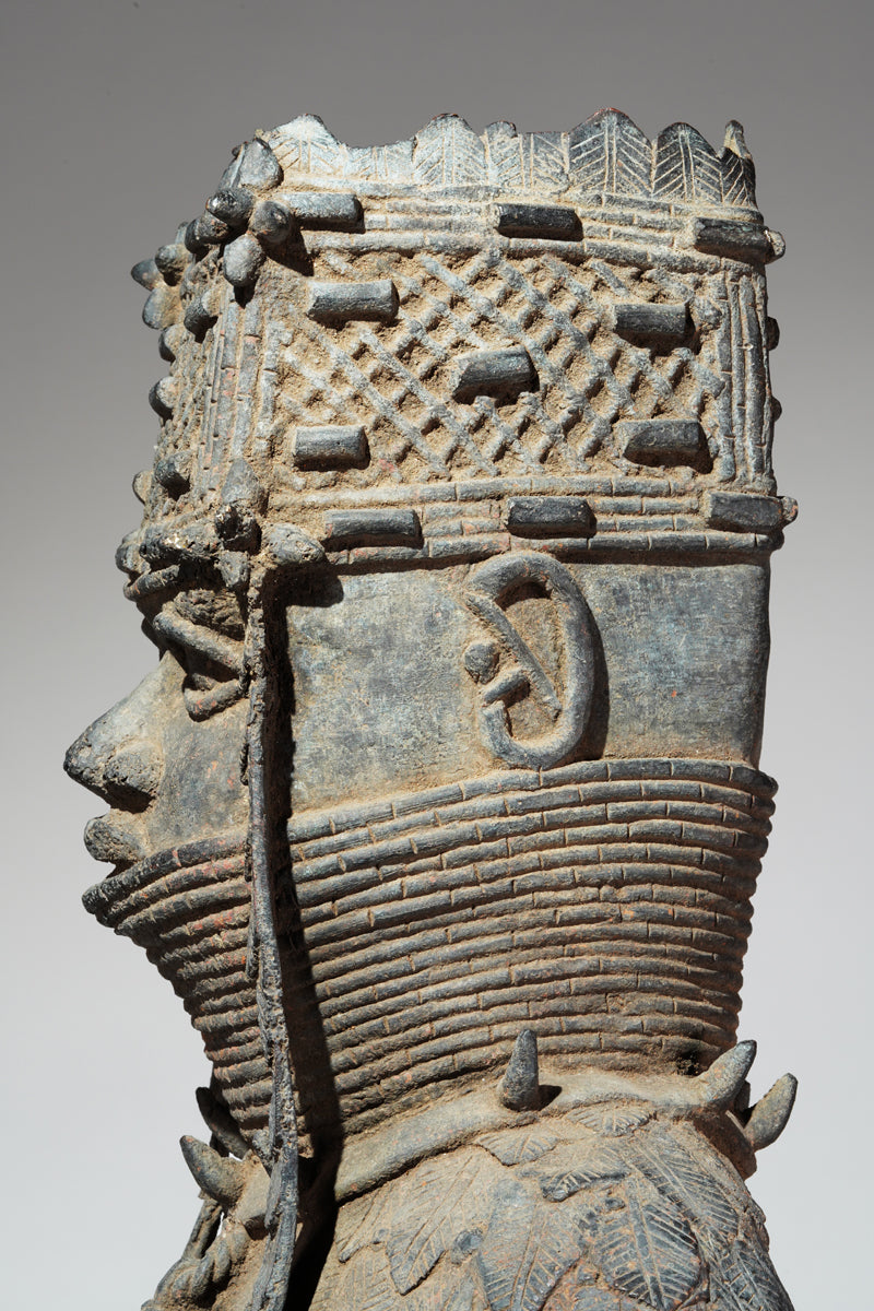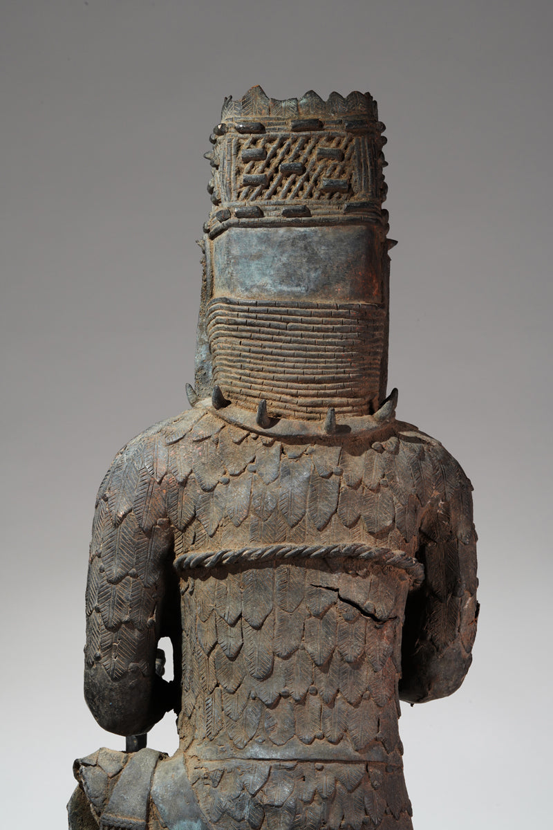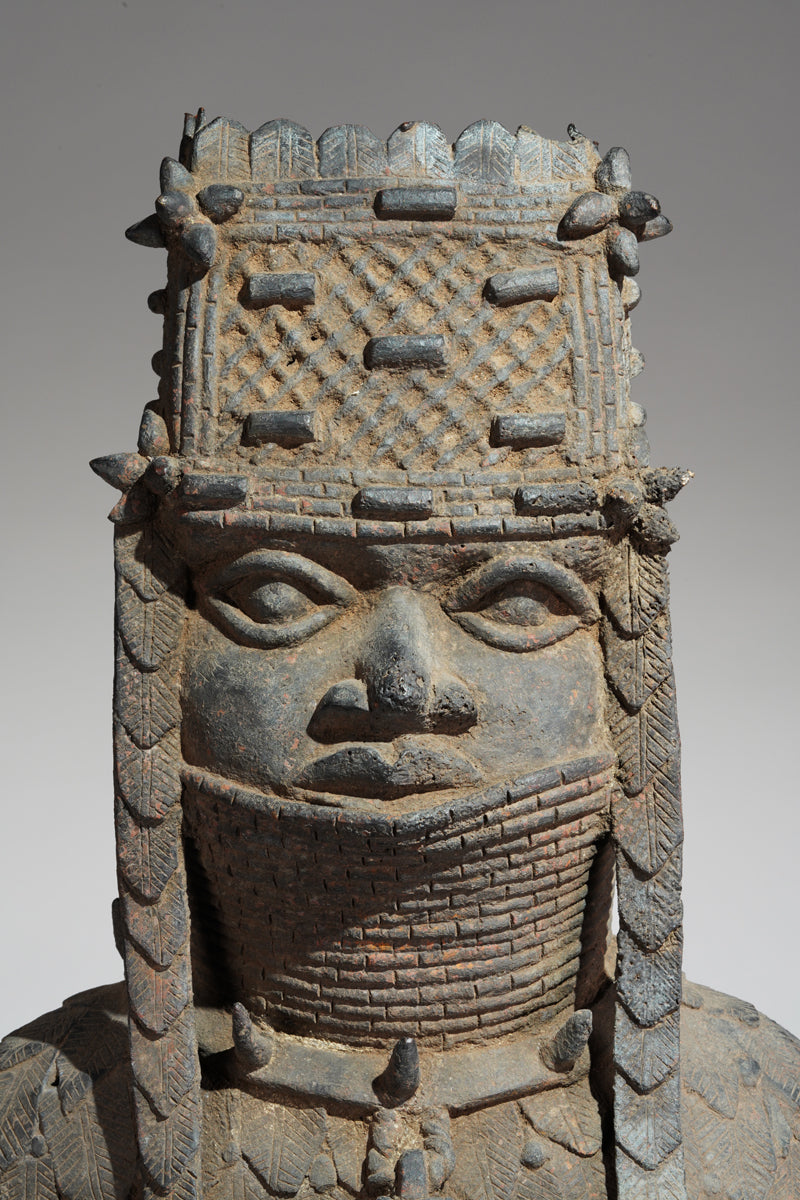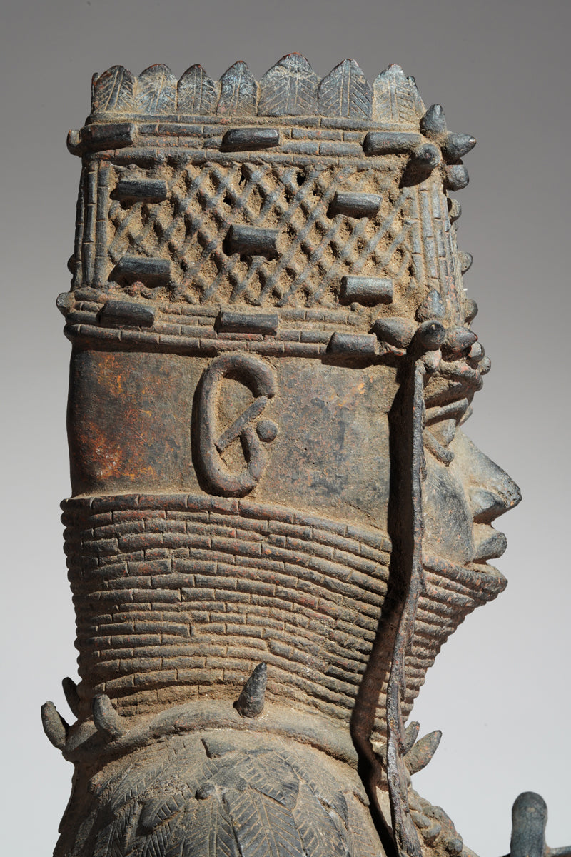This bronze representation of an Oba or a high ranking personality is a quintessential example of court art from the Kingdom of Benin, located in present-day southern Nigeria. Created by sp of brass casters (Igun Eronmwon), this work exemplifies the high technical and artistic standards achieved by Benin artists, particularly under royal patronage.