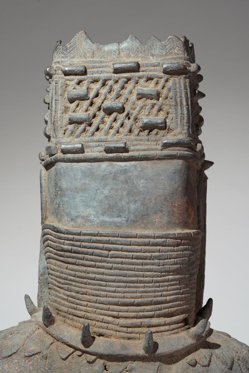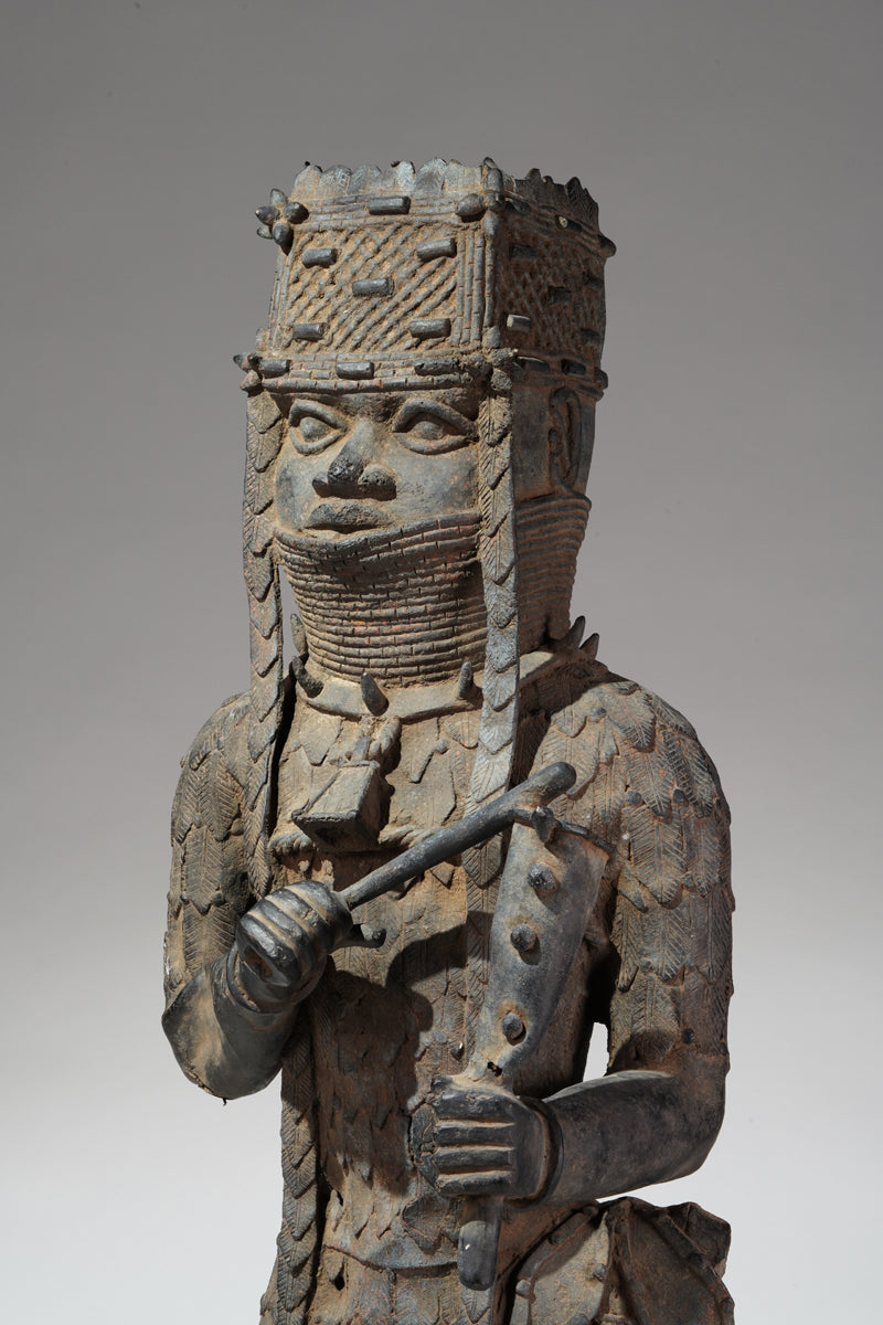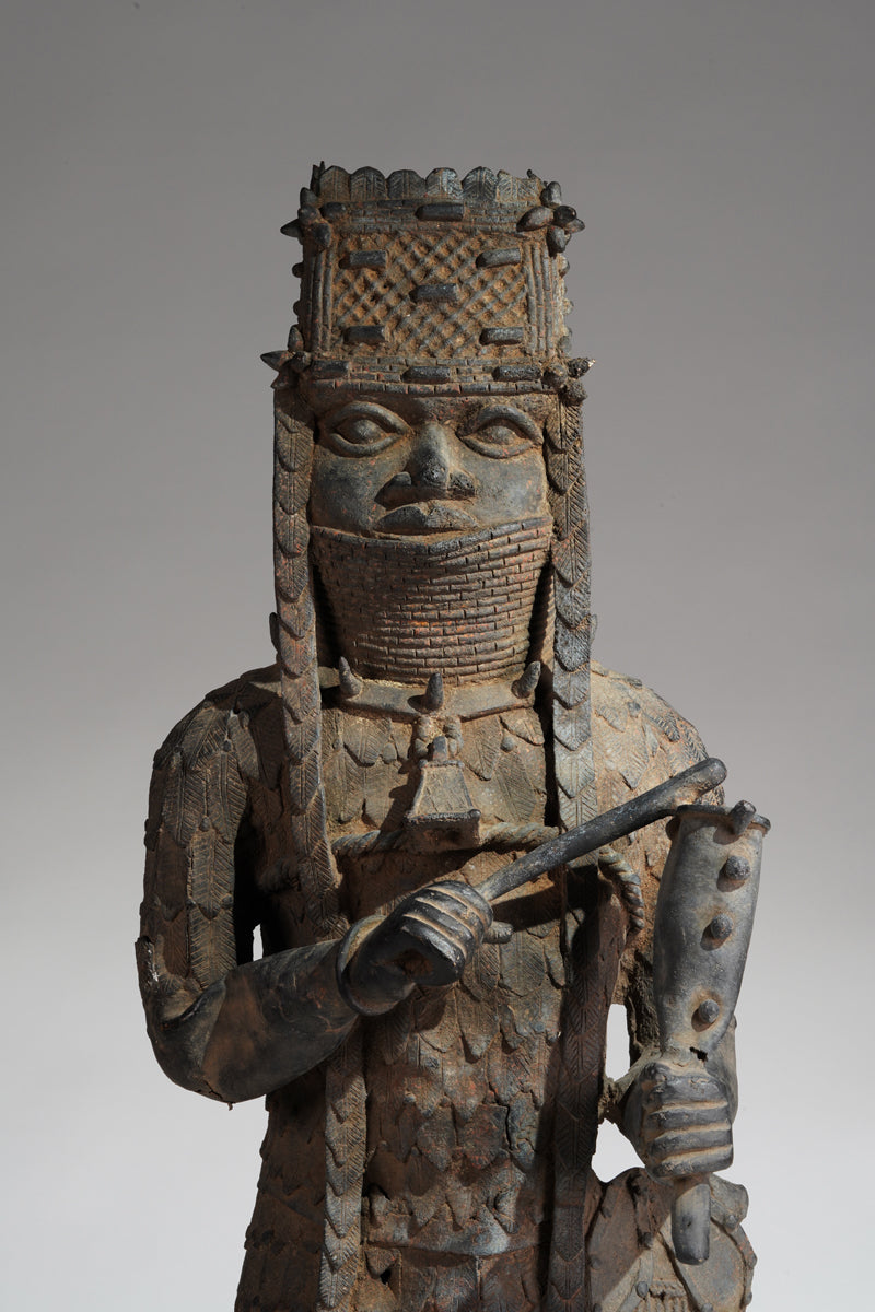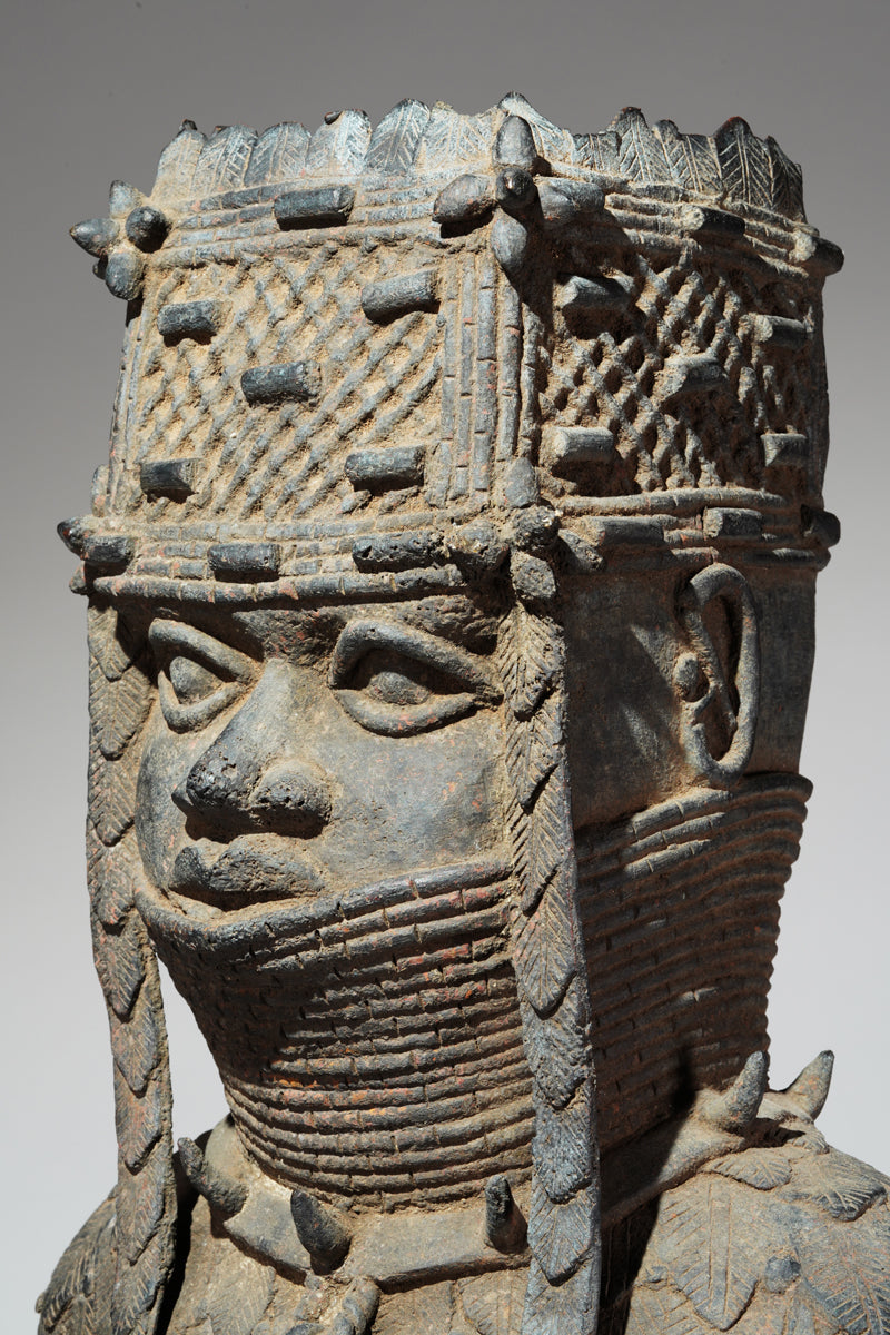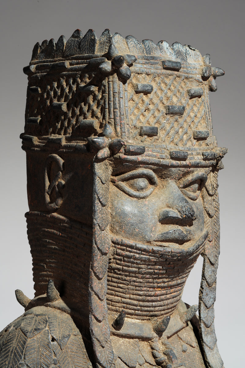 This bronze representation of an Oba or a high ranking personality is a quintessential example of court art from the Kingdom of Benin, located in present-day southern Nigeria. Created by sp of brass casters (Igun Eronmwon), this work exemplifies the high technical and artistic standards achieved by Benin artists, particularly under royal patronage.