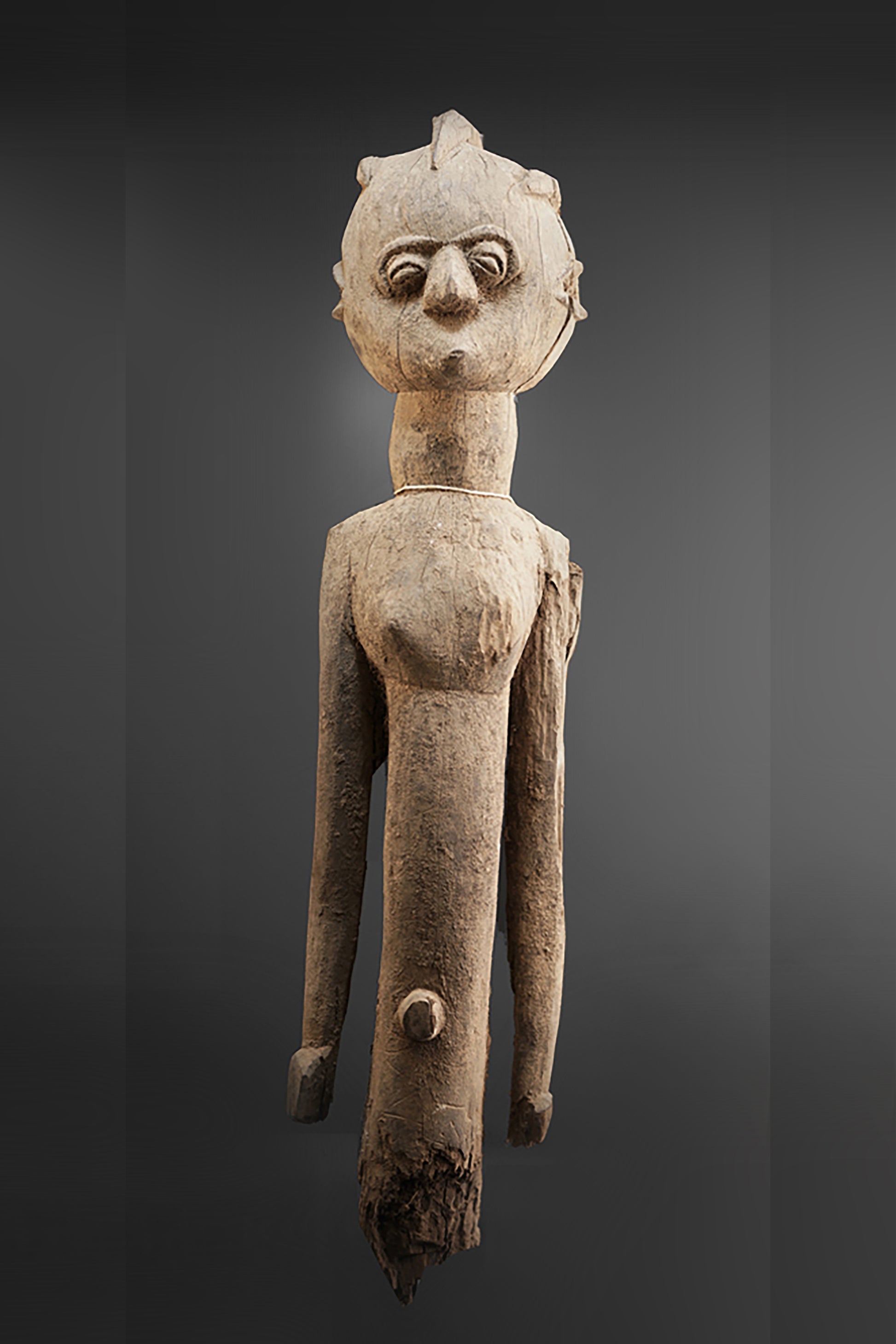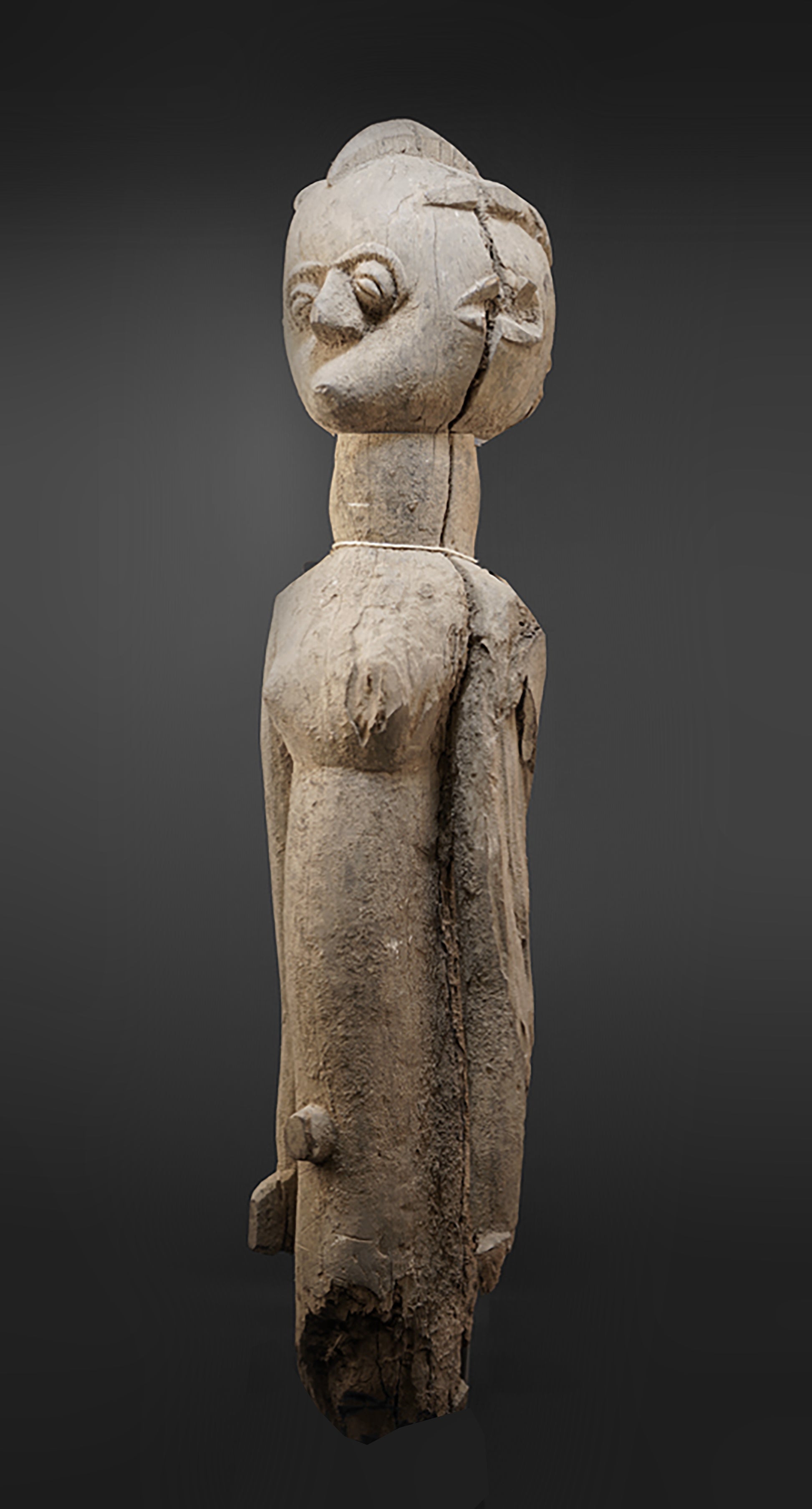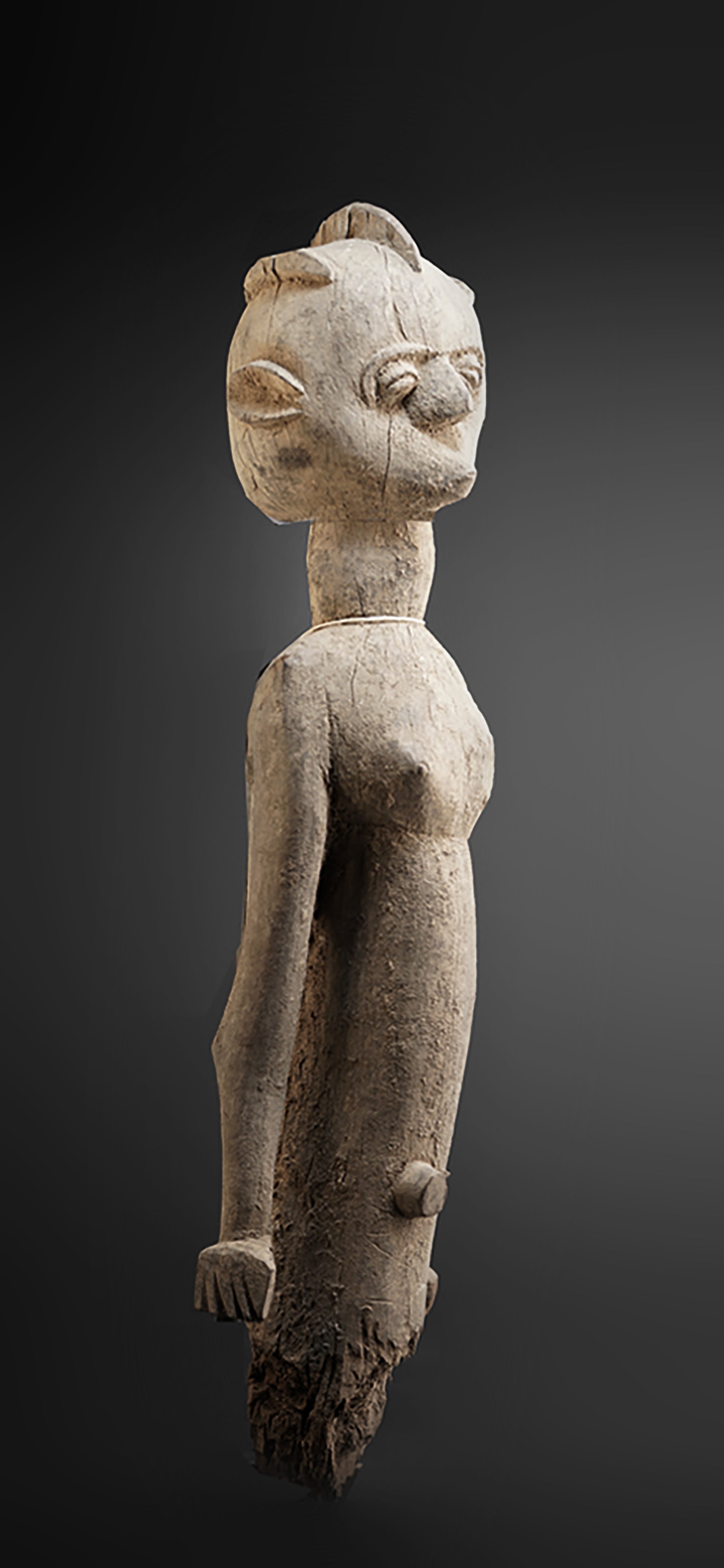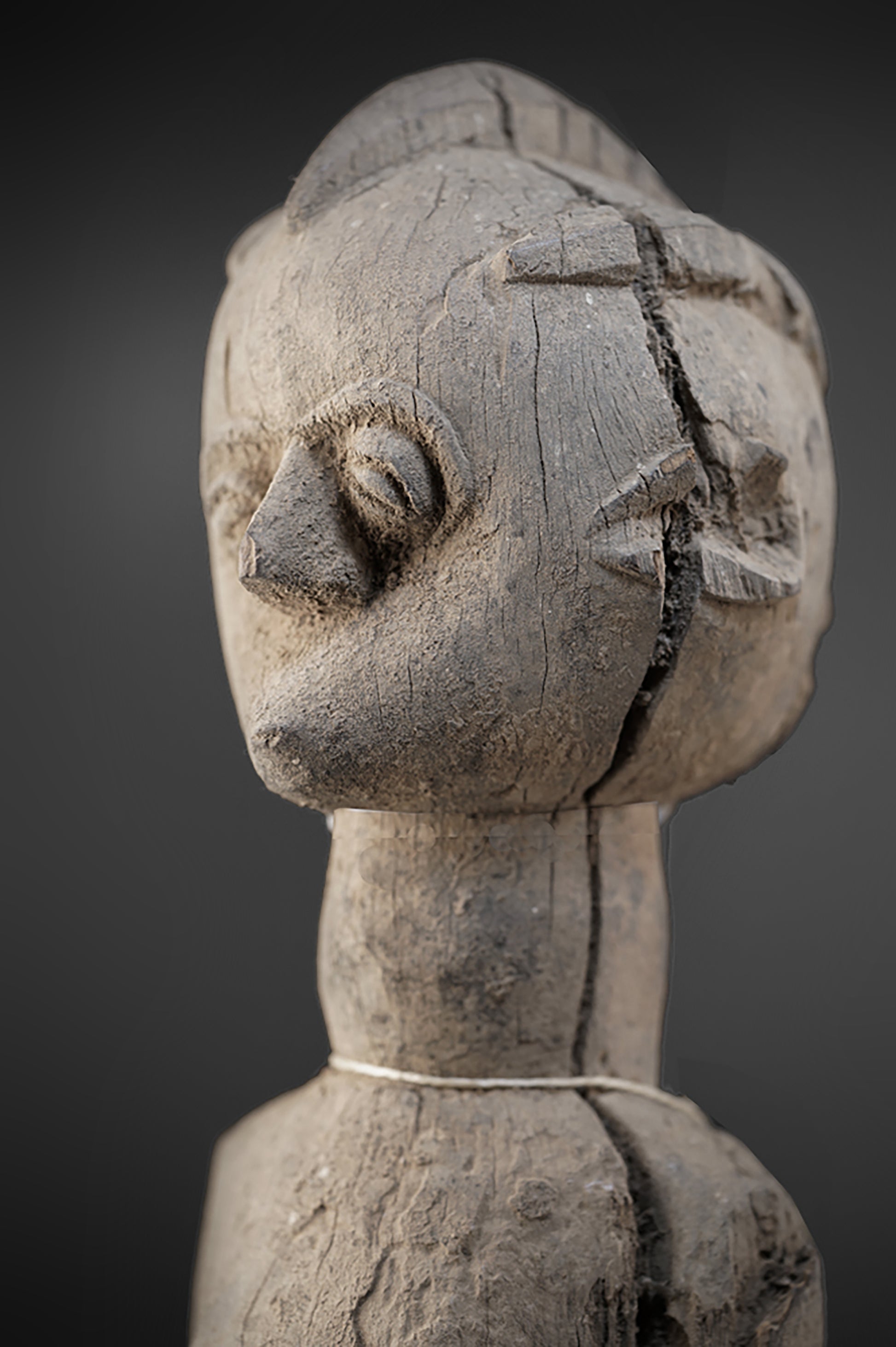 A fragmentary female Lobi sculpture with a slender torso, arms carved close to the body, a globular neck surmounted by a head of the same shape, a three-parted headdress, partly encircled eyes, framed by horseshoe-like ears, a prominent triangular nose and small pointed mouth, extremely heavy hardwood, which is the consequence of an oxidation process of many decades, also called "ironwood". A large age crack at the left side of the sculpture. Remnants of encrustations, which could be a long-lasting sacrification period.