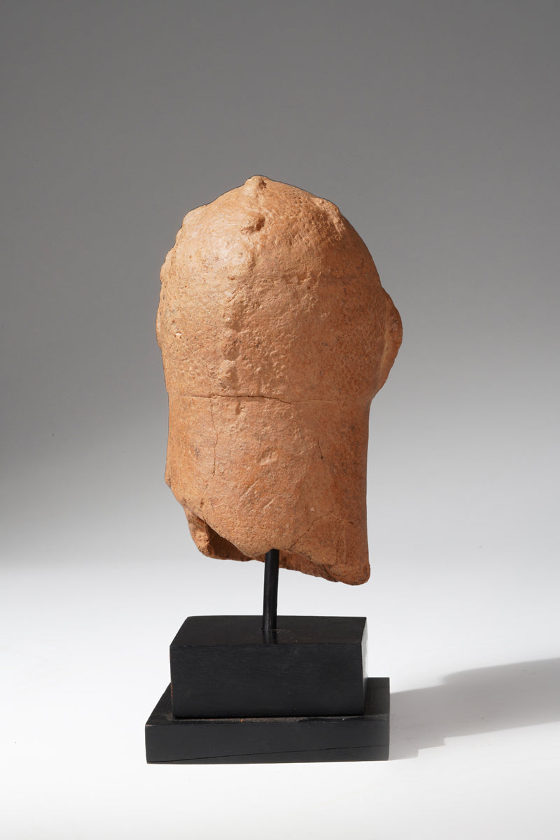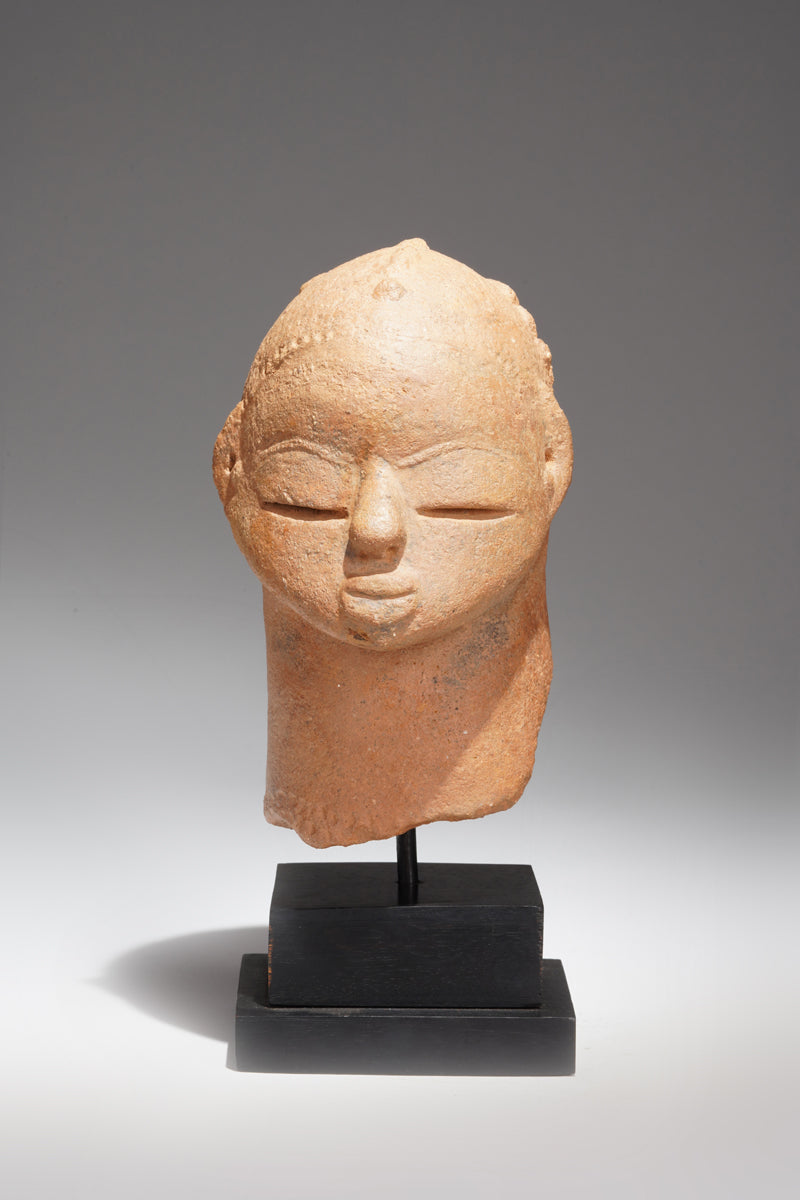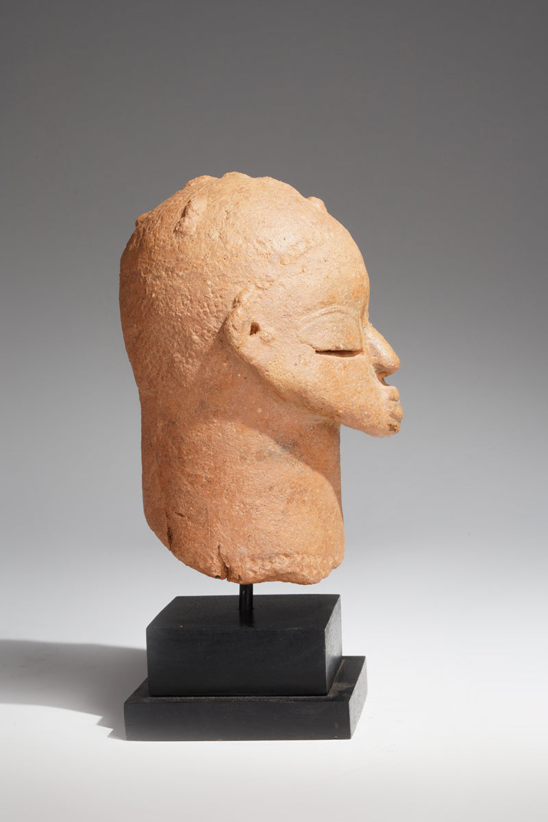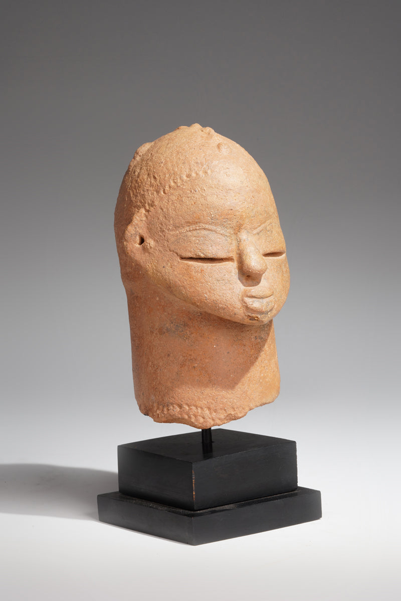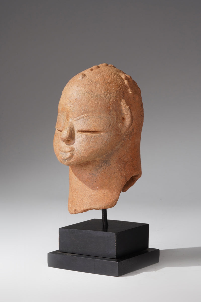 A fragmentary terracotta head in the Katsina style, Nigeria with a small face, long horizontal slits for eyes with eyebrow carvings over them, a small nose and narrow round mouth; the ears are carved high and the head has small protrusions for coiffure. Certificate of origin and provenance.
